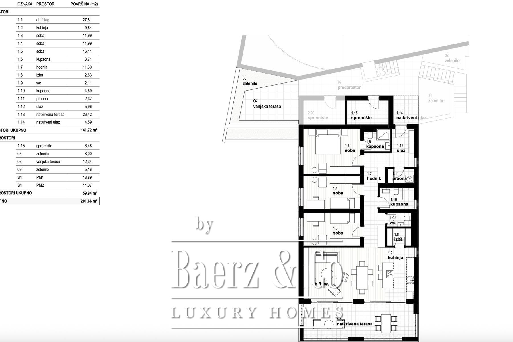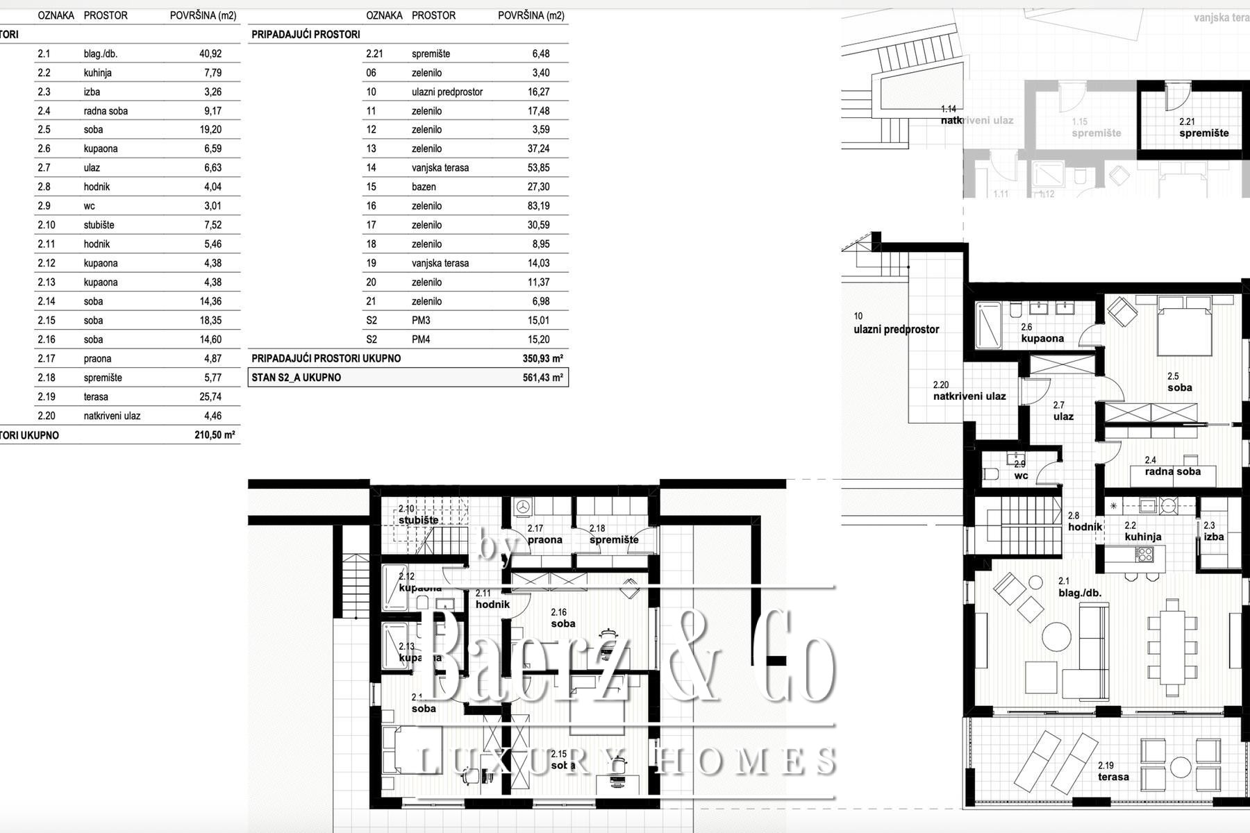 In Kostrena, one of the most beautiful and sought-after locations on the Kvarner coast, a luxurious two-level five-bedroom apartment of 251,58 m² is for sale in a modern building with a total of two floors. This elegant new development represents the perfect combination of sophisticated design, comfort, and contemporary living, offering a stunning sea view that will take your breath away.The apartment consists of a spacious living room and dining area of 40.92 m², connected to a modern kitchen of 7.79 m². It features five spacious bedrooms (9.17 m², 19.20 m², 14.36 m², 18.35 m², and 14.60 m²), three elegant bathrooms, a guest toilet, walk-in wardrobe, laundry room, storage room, pantry, hallway, and entrance area. A covered terrace of 25.74 m² provides additional space to enjoy the fresh air, peace, and beautiful panoramic sea views.Additionally, the apartment includes a private swimming pool, two outdoor terraces with a garden, two outdoor parking spaces, and a separate storage room of 6.48 m².Special attention has been given to the superior quality