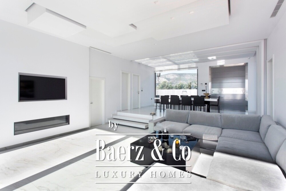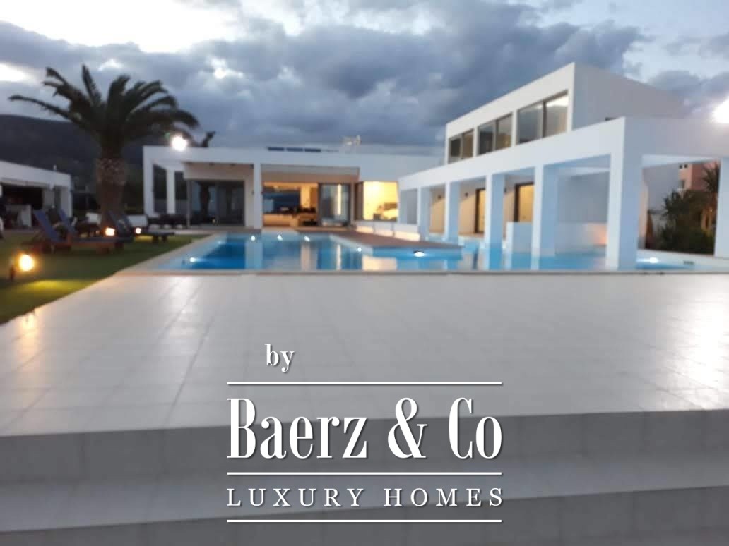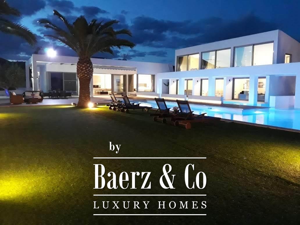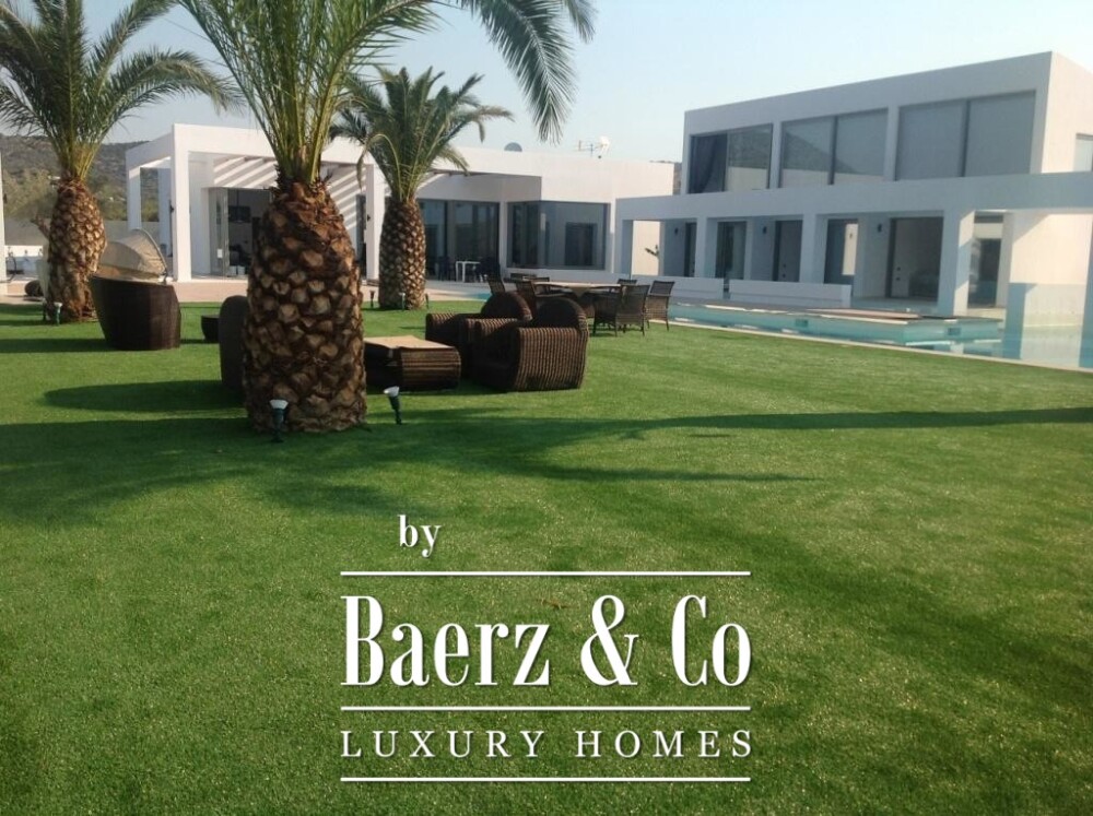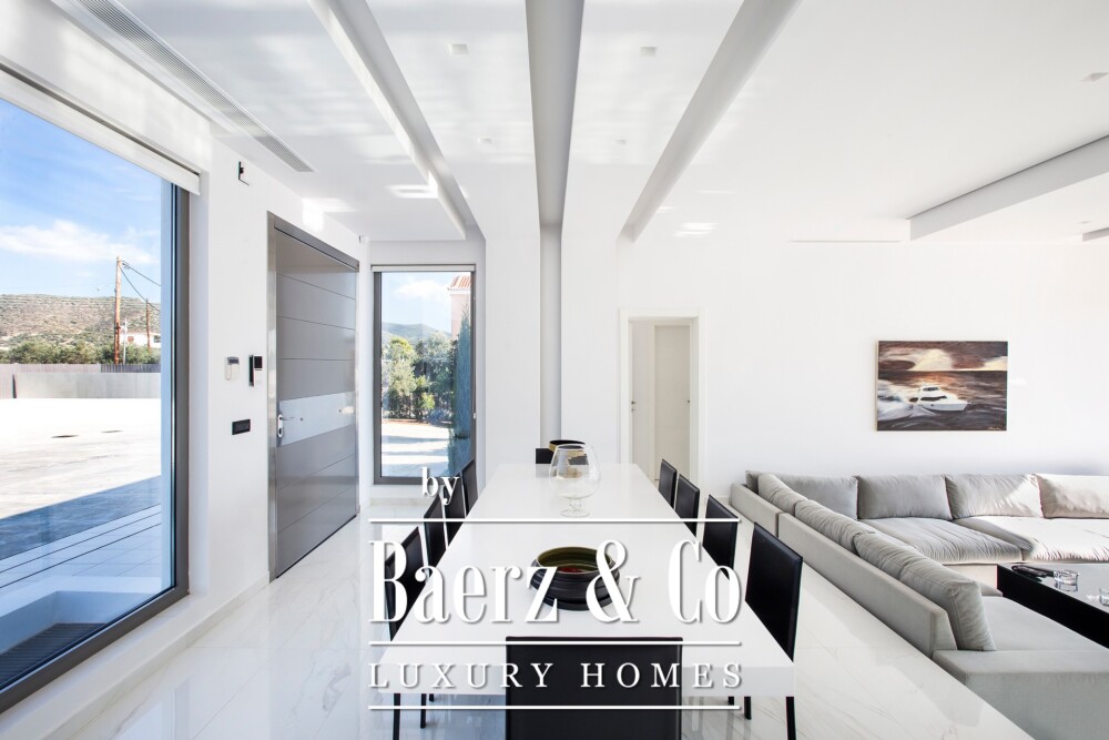 Natural light filters through double-glazed windows, illuminating interiors with a gentle clarity. The living areas maintain a disciplined simplicity that enhances the sense of peace and spaciousness. Outside, a 5,000 m² landscaped plot embraces a large swimming pool, wooden deck, areas dedicated to outdoor dining and living, and a thoughtfully designed zone for sun loungers. Sea views provide an ever-present backdrop, while a sheltered barbeque and designated parking add further practicality.