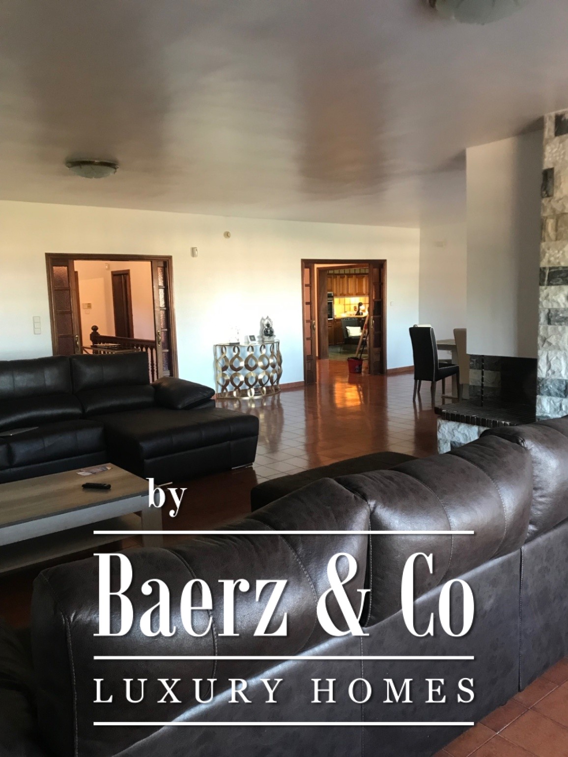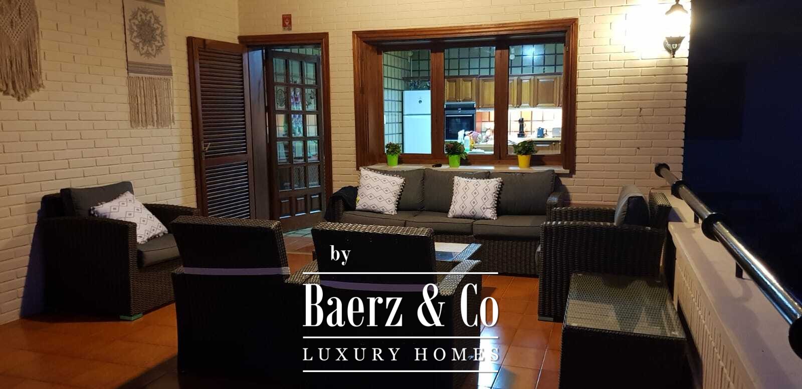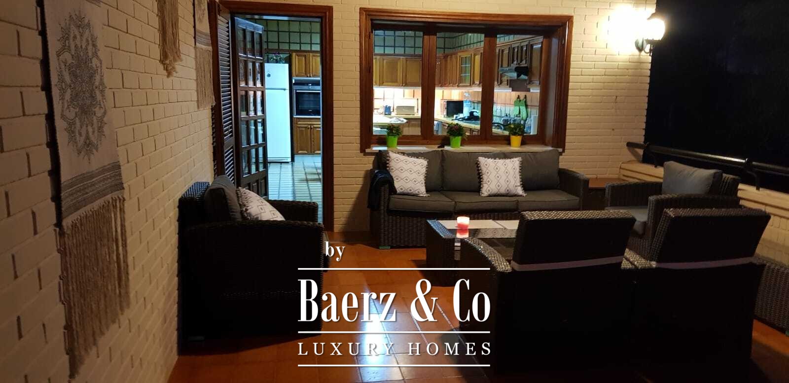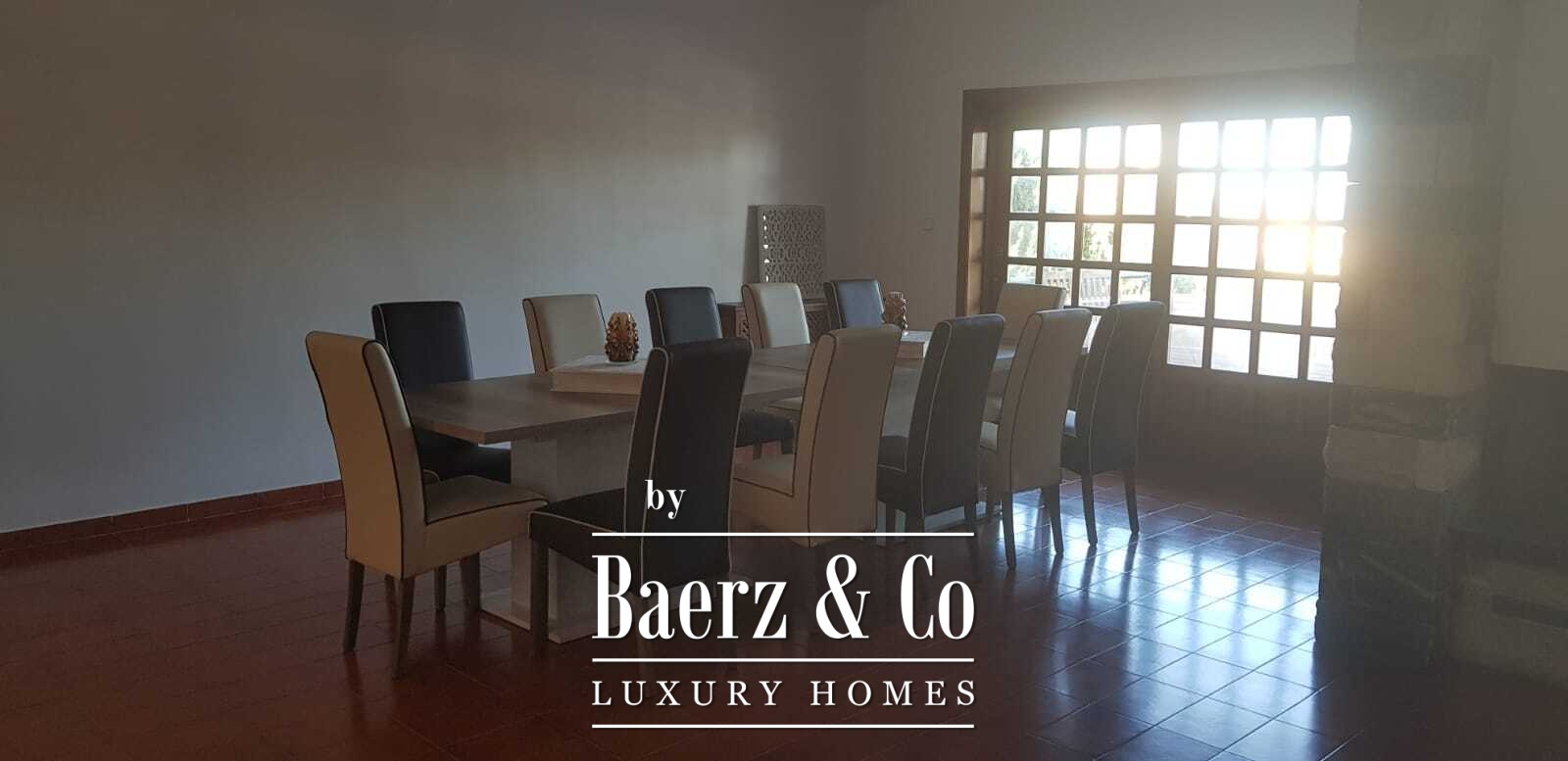 Inside, the layout flows around four generously proportioned double bedrooms and five full bathrooms, with an additional guest toilet for convenience. The main living area, a 100 m² expanse, moves seamlessly into a spacious kitchen and dining area, creating a natural rhythm for gatherings and quiet moments alike. The villa opens towards mature gardens and a swimming pool with a designated children’s area, further complemented by open and covered terraces for year-round enjoyment.