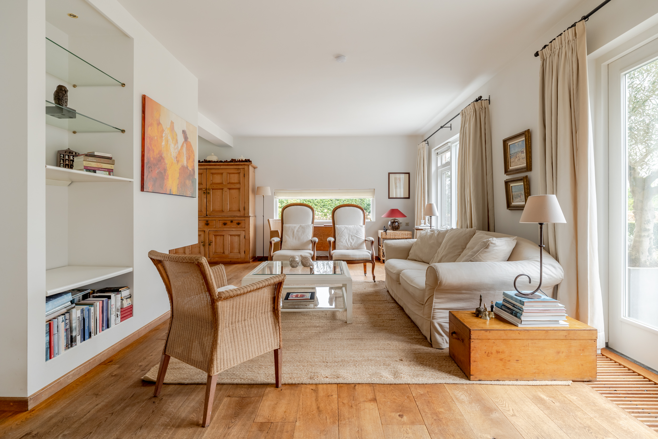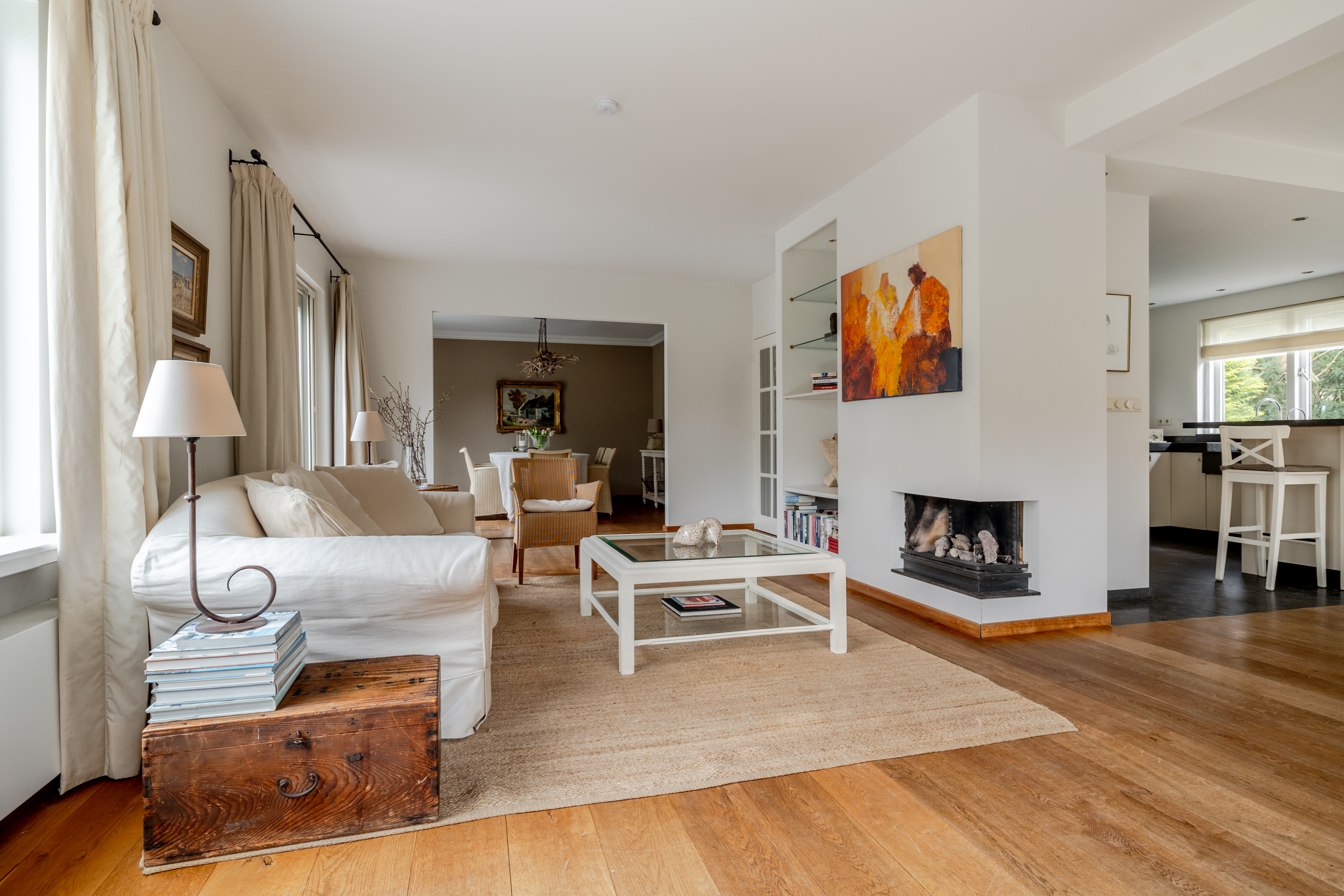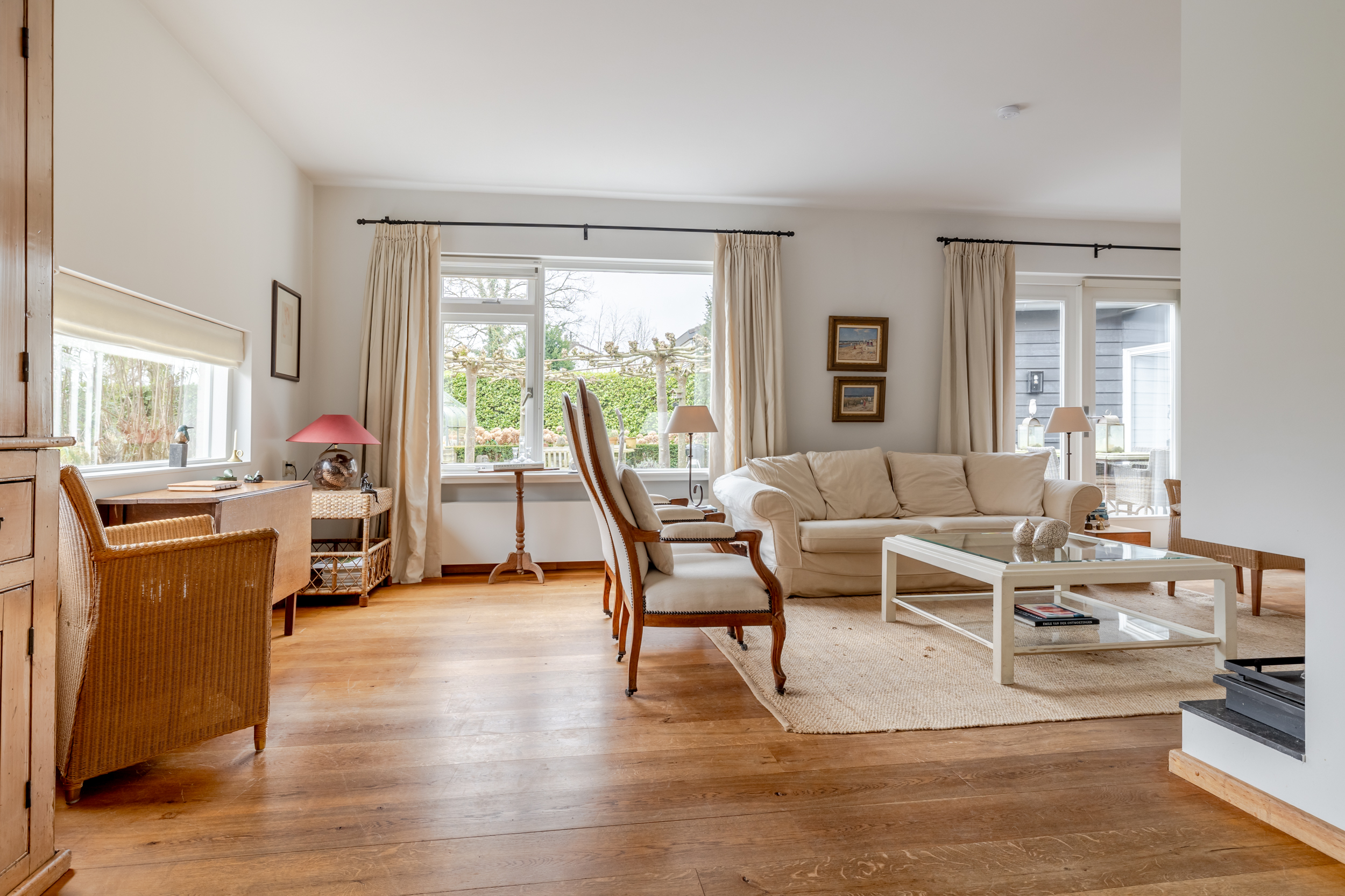 Garden-facing living room consisting of a lounge area (approx. 4.00 x 7.30 m) and a dining area (approx. 4.00 x 4.05 m) with a fireplace and French doors opening onto the garden. Large windows provide beautiful natural light and a seamless connection to the outdoors.