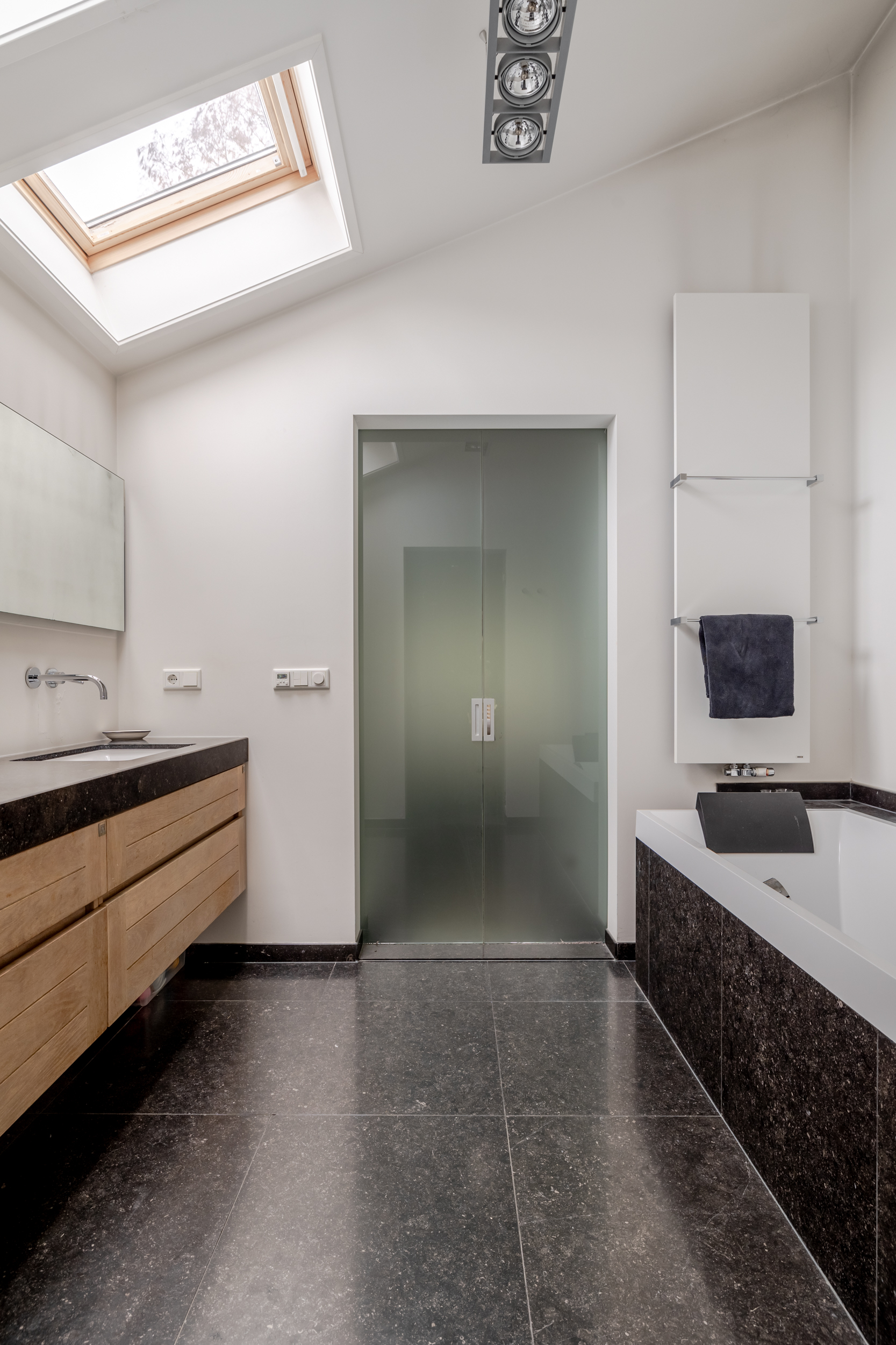 Luxury bathroom (approx. 3.85 x 2.95 m) featuring a bathtub, vanity unit, a large walk-in shower (partially finished in natural stone) with both rain and hand showers, and a designer radiator.
