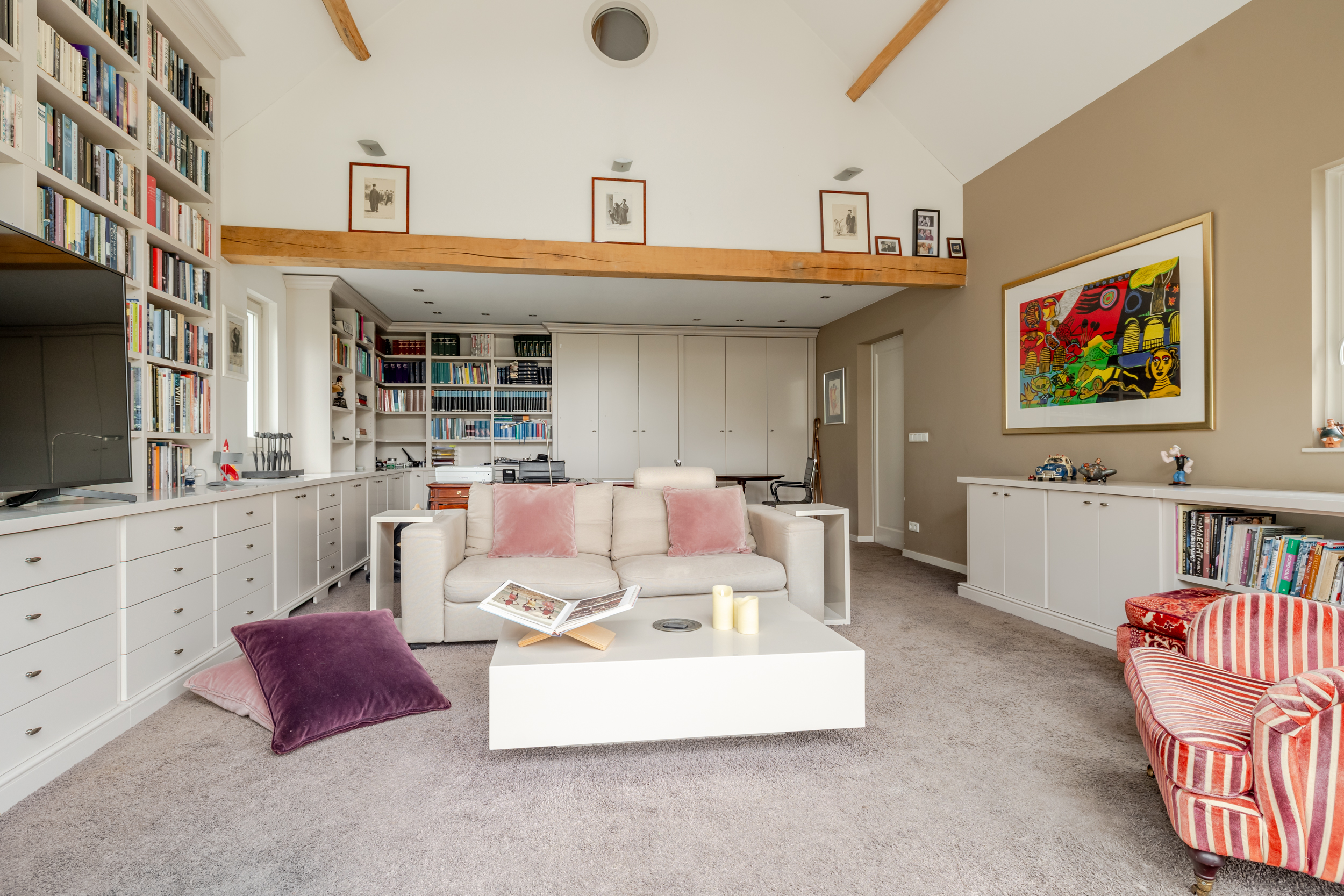 Spacious workroom (approx. 5.40 x 7.85 m) with beautifully crafted custom wall cabinetry and French doors opening onto the garden. This room offers stunning views over the garden and adjacent water.