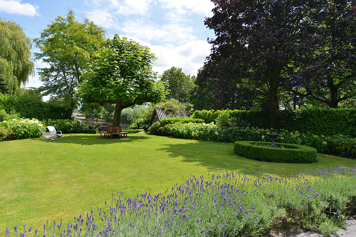 Multiple terraces have been created, including a spacious terrace directly on the water and a large hardstone-paved terrace next to the house, partially shaded by plane trees. The front/side garden also features a decorative pond.