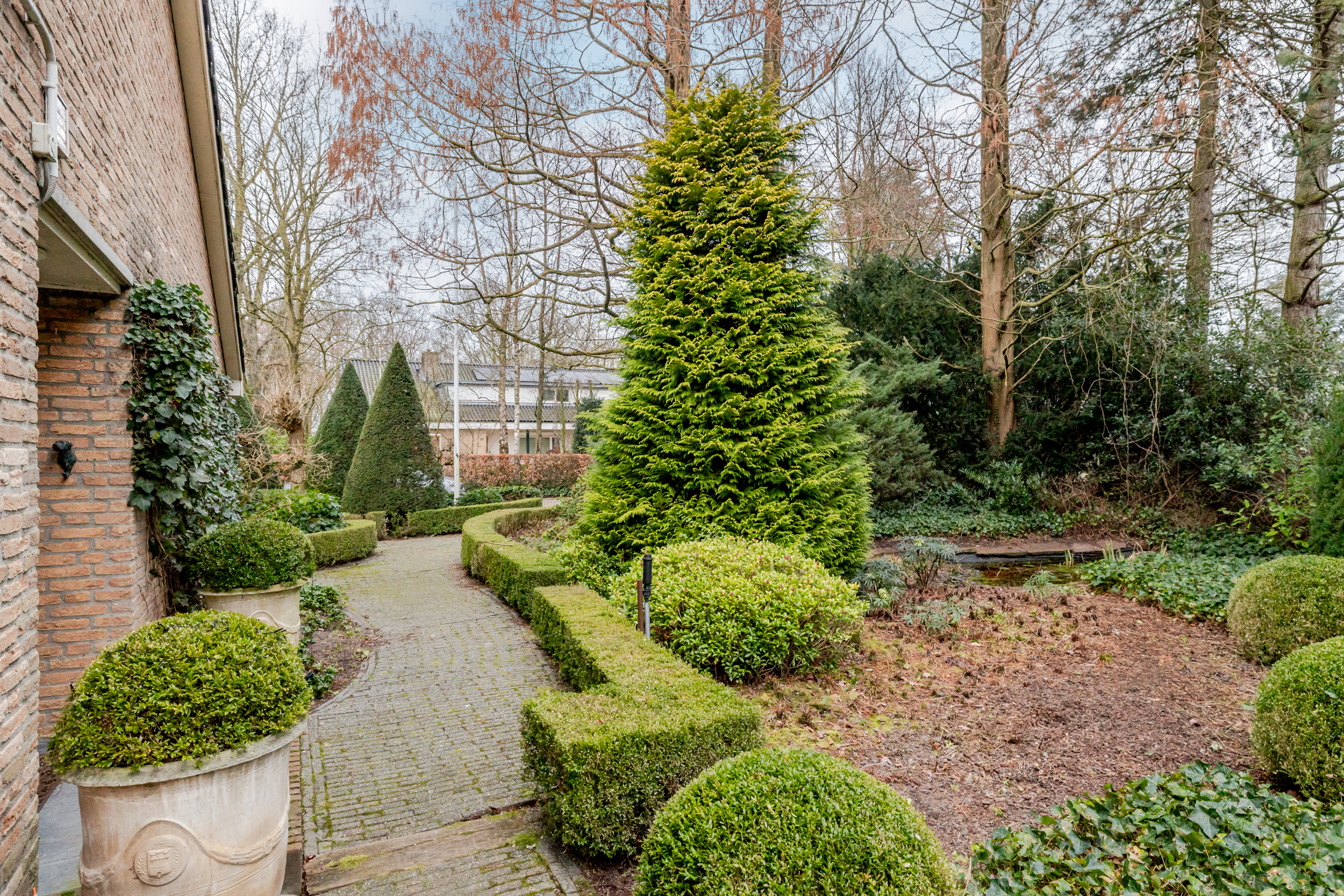 The beautifully landscaped garden features a lawn (with irrigation system), a wide variety of plants, and offers complete privacy. At the rear of the house, a large pond ensures that there are no rear neighbors.