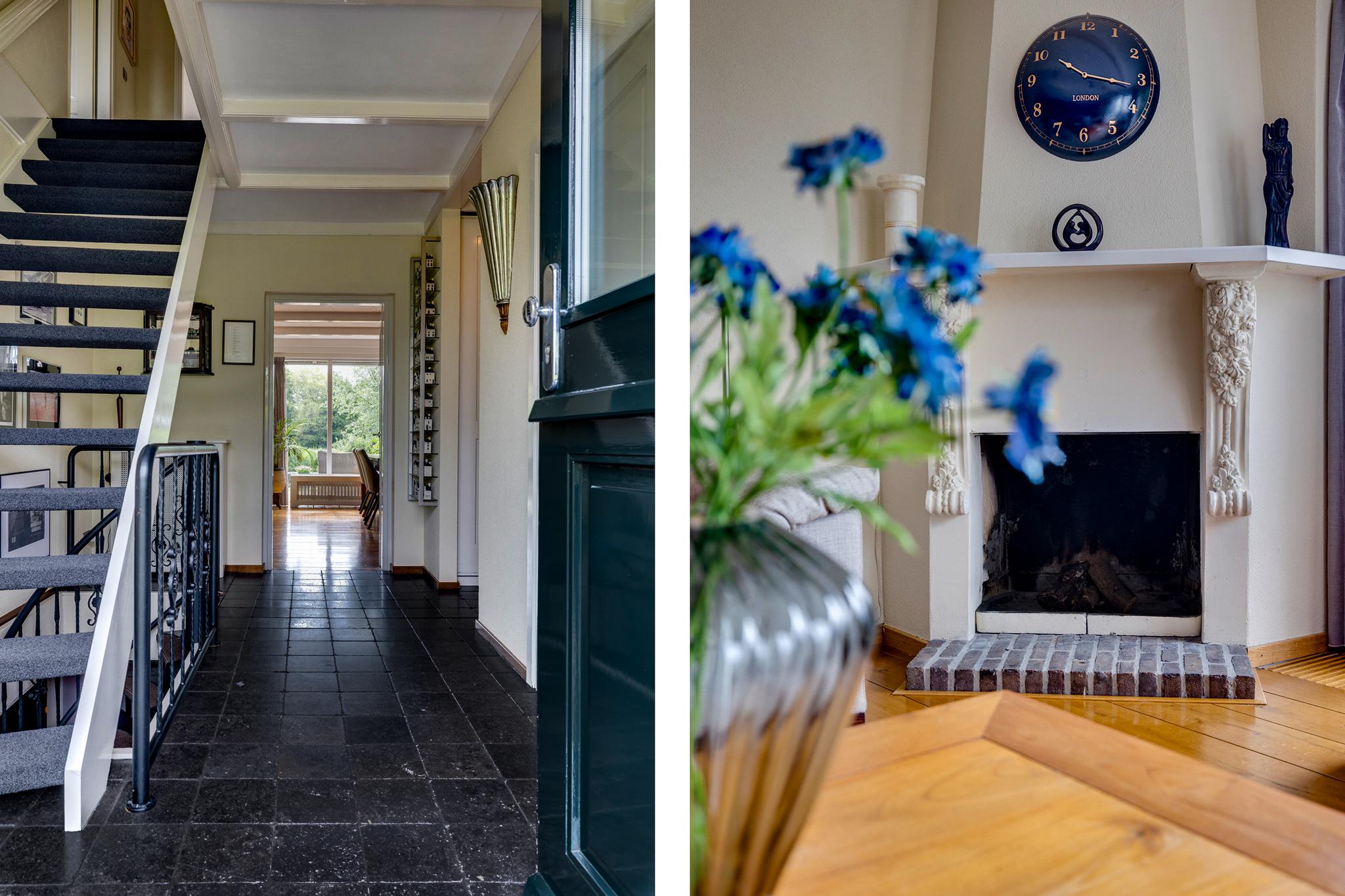 Begane grond: binnenkomst in hal met meterkast, ruime wasruimte, garderobekast en toilet met fonteintje. Z-vormige living met open haard en schuifpui naar één van de terrassen met uitzicht over het water. Middels de eetkamer bereikt u de woonkeuken welke voorzien is van diverse inbouwapparatuur zoals: 6-pits gasfornuis, oven, magnetron, heet water kraan en vaatwasser.