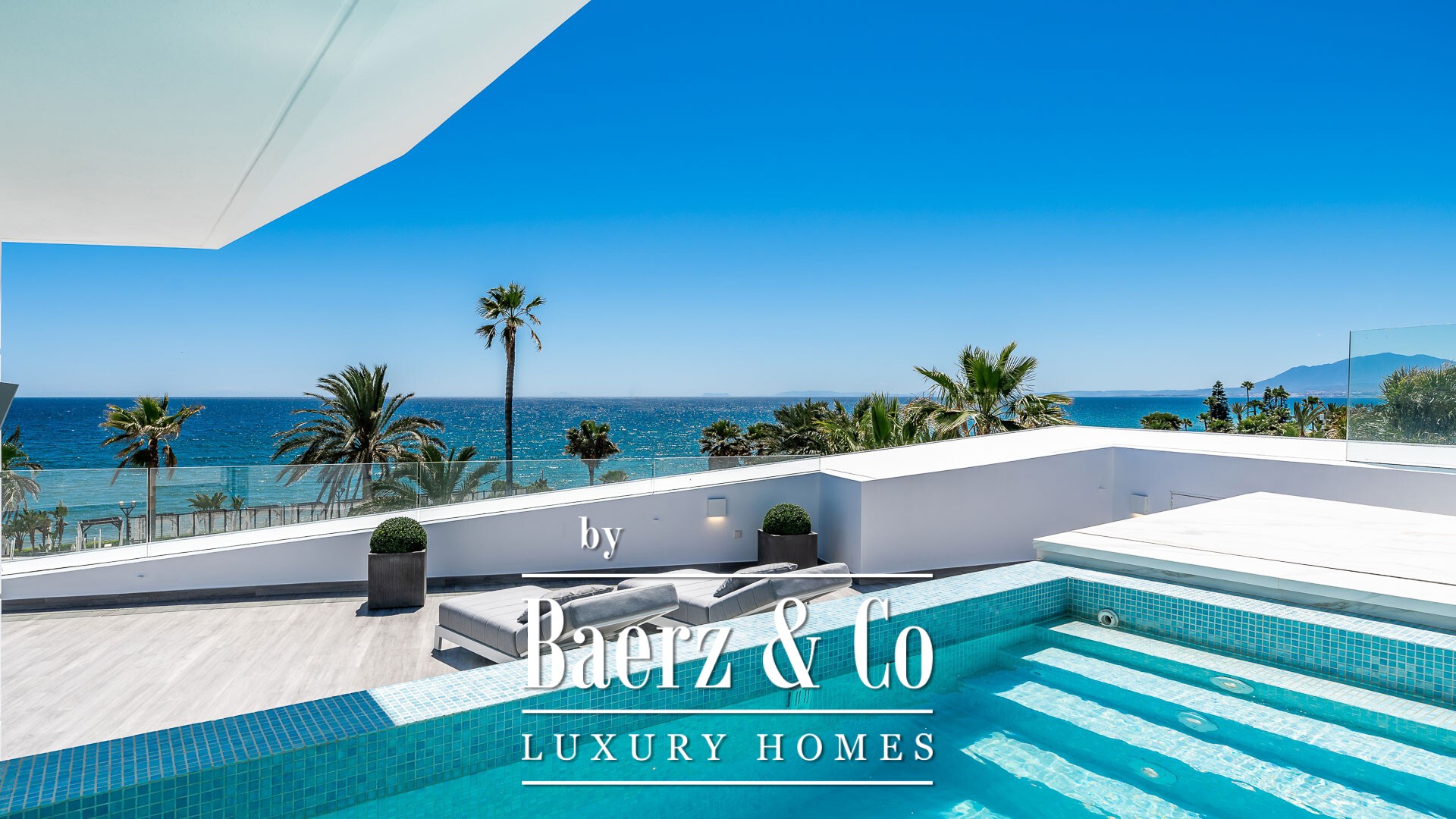 This architectural masterpiece boasts exquisite design and luxurious finishes throughout. As you step inside through the grand entrance hall, you are immediately greeted by the open-plan living and dining area, seamlessly connected to a partially enclosed kitchen. From here, you can access the marvelous terrace, offering panoramic views of the glistening sea. On the same floor, a master bedroom suite awaits, providing a haven of tranquillity and indulgence. Adjacent to it, you'll find a unique office space with a modern boat-style design, featuring double-height ceilings and surrounded by water—an inspirational setting for your work or creative endeavors. Additionally, there is a guest toilet for added convenience. To effortlessly move between levels, a private lift is at your service, granting access to the basement or the first floor. The basement is bathed in natural daylight and features a state-of-the-art garage capable of accommodating up to 5 cars. Furthermore, there is an additional bedroom and a versatile multi-use room that can be transformed into a private gym, sauna, bar, or home cinema, catering to your personal desires. Completing the basement are a laundry room, a storage room, and a spacious technical room. Ascending to the first floor, you will discover three out of the four en-suite bedrooms, each offering breath-taking views of the sea. The master suite on this level is a true embodiment of luxury and space, providing the utmost comfort and serenity. A crowning jewel of this extraordinary property is the rooftop terrace, where you can unwind and bask in pure bliss. Immerse yourself in the Jacuzzi pool or lounge on the expansive decking areas, all enclosed with glass walls that guarantee uninterrupted vistas of the sea, Africa, Gibraltar, and the Bay of Marbella. Notable features of this prestigious villa include under-floor heating throughout the property, an advanced alarm system, 24-hour security for peace of mind, and a cutting-edge home automation system. Moreover, you will enjoy direct access to the beach, allowing you to relish the sun, sand, and sea at your leisure.