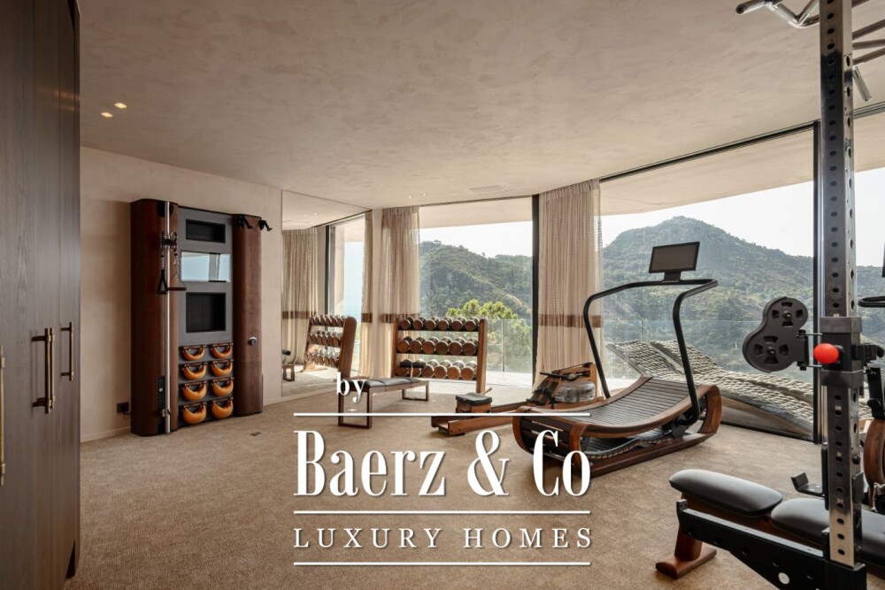 Technology and comfort advance in tandem: a full Control 4 Domotic system, adaptive AC, integrated audio-visual, two elevators, an automated aromatic diffuser, and security with 24/7 monitoring maximise ease and peace of mind. Life extends naturally outdoors with a 500 m² terrace network, infinity pool, outdoor lounges and automated irrigation. A multi-car garage, gym, and cinema room complement the villa’s holistic composition.