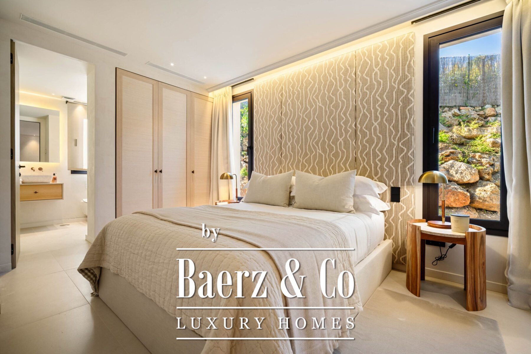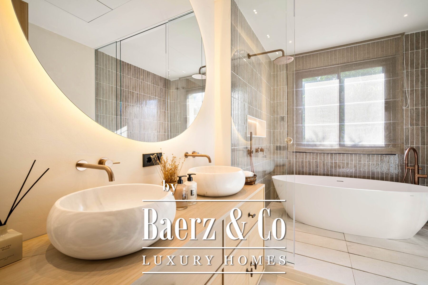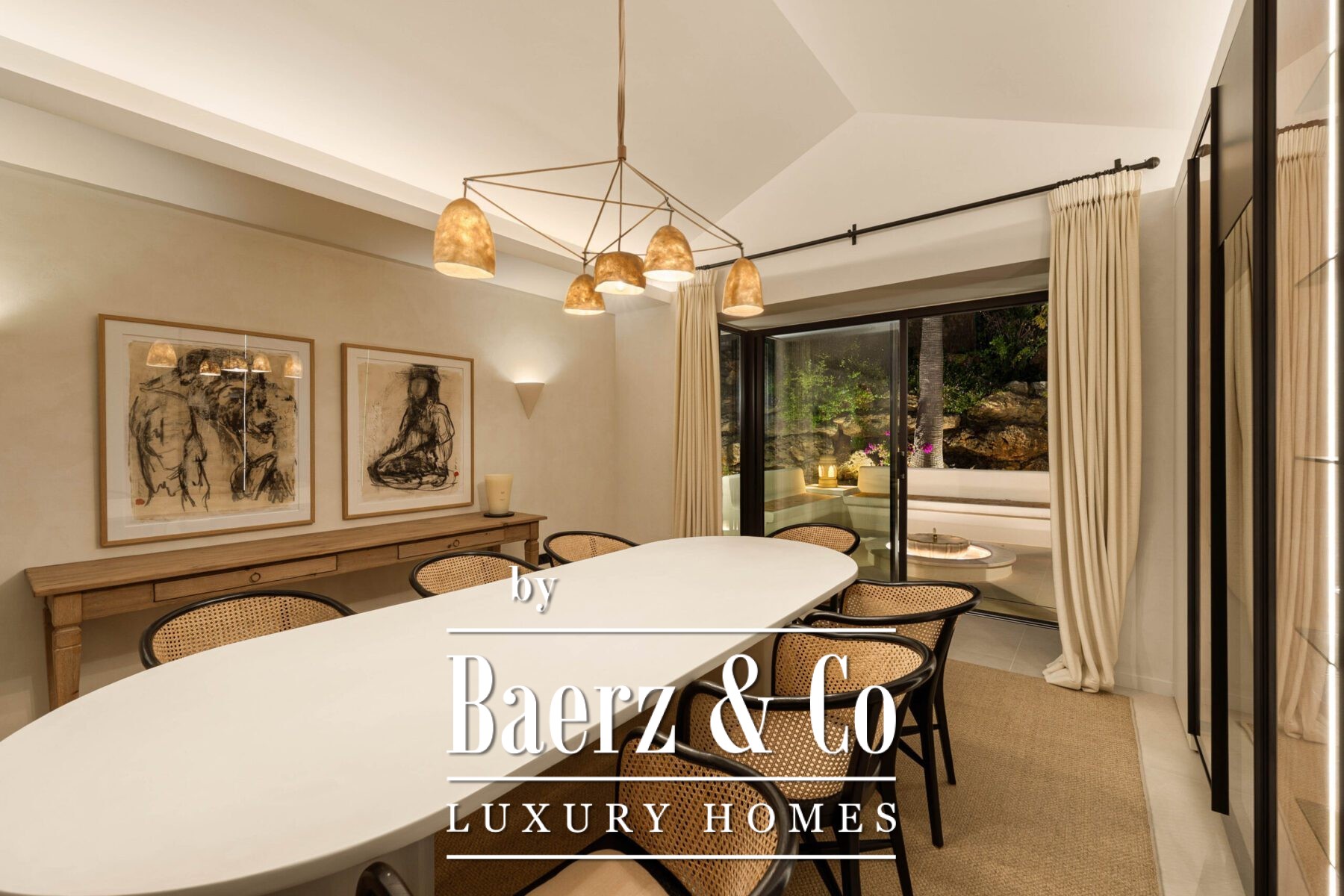 Villa Marbella with Sea and Mountain Views sits quietly in Nueva Andalucía, minutes from Los Naranjos Golf Course and close to Marbella’s celebrated beaches and dining. This fully renovated single-level villa, with 241 m² of living space and set on an 855 m² elevated plot, captures the essence of Mediterranean life. The main living area is defined by its open-plan design, vaulted ceilings, and a palette of soothing natural tones. Light moves freely throughout, courtesy of floor-to-ceiling glass doors that lead to a generous terrace, where an infinity-edge pool appears suspended above the valley. From both inside and the rooftop terrace, expansive views reach across the valley to meet the sea.