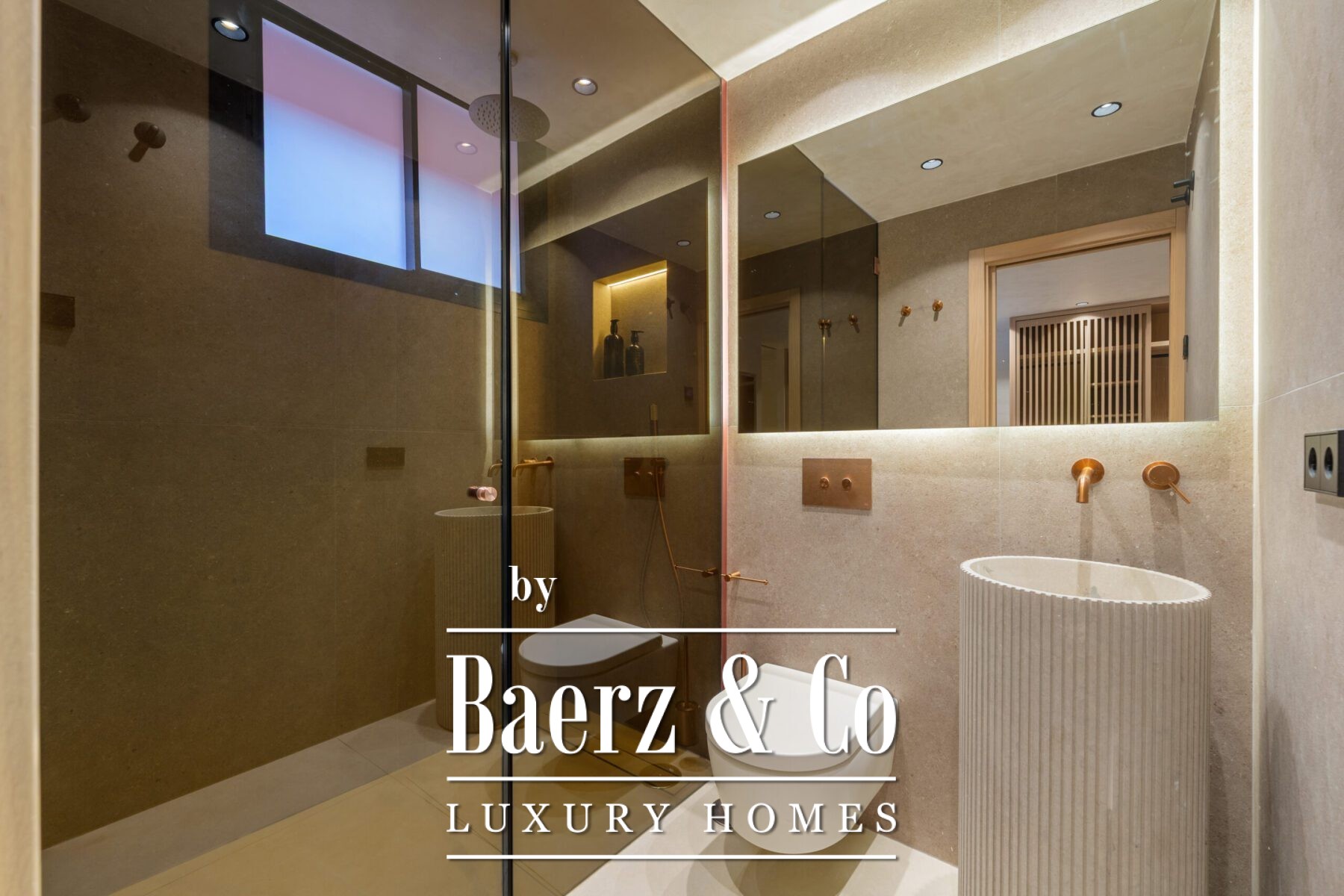 The upper floors host spacious bedrooms, including a master suite with a walk-in wardrobe and an en-suite bath designed with precision. Multiple terraces across levels offer choices for quiet mornings or lively evenings, culminating in a rooftop solarium appointed with built-in BBQ, jacuzzi, and panoramic views across mountain and garden landscapes. A private garage, 24h security, and advanced amenities such as air conditioning and underfloor heating reflect a commitment to comfort and ease.