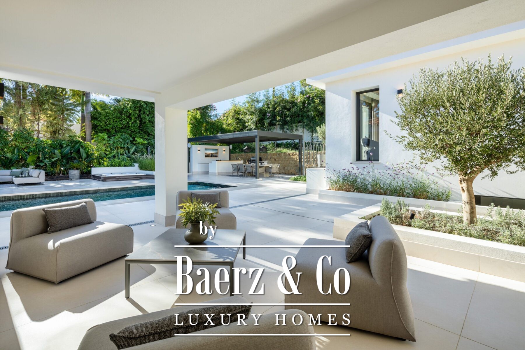The property prioritizes convenience and security alongside luxury. Positioned strategically in Nueva Andalucia, the villa is just a five-minute drive from local shops, a ten-minute drive from schools, and seven minutes from the beach. Features like double glazing, covered parking for two cars, and ample storage space in the basement add to the property’s practicality. The villa is fully furnished in a modern, elegant style, each space inviting comfort and leisure. Top-notch security systems, including alarms and electric blinds, enhance the property’s safety, ensuring residents can indulge in their serene surroundings with peace of mind.