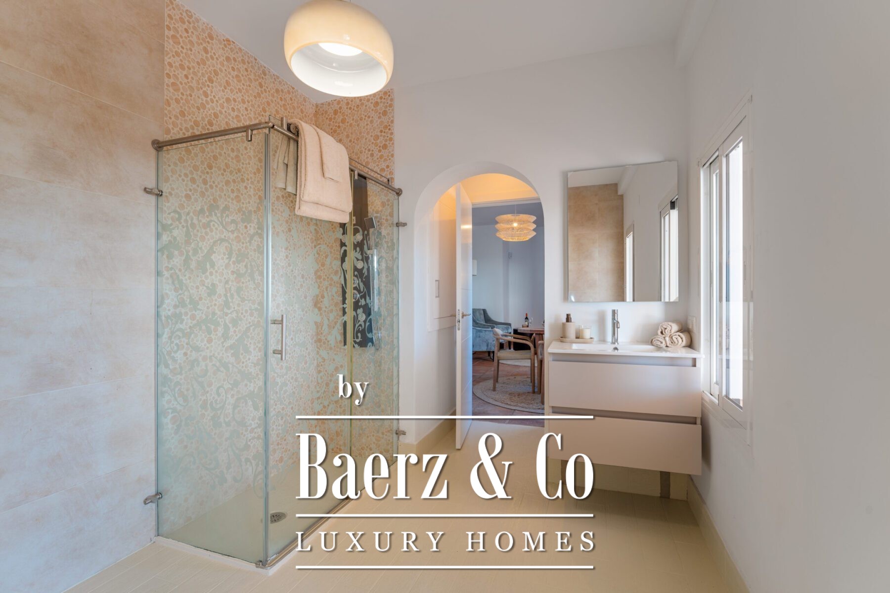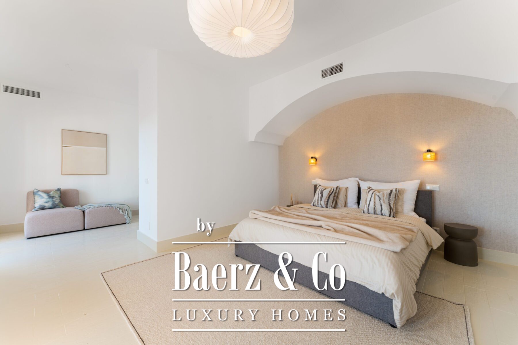Upon entry, warmth and restraint define the experience. The layout flows from a serene entrance to a relaxed TV and lounge space, then to a tranquil bedroom suite—each zone designed for privacy and calm. Downstairs, a luminous living area is adjoined by a streamlined kitchen appointed with Siemens appliances. The space connects seamlessly to a terrace and private pool, inviting uninterrupted transitions between indoor ease and outdoor Mediterranean light. Additional features on this level include a laundry room, guest toilet, a master suite, and a smaller bedroom. The main house is complemented by a separate maid apartment below and a guesthouse above the garage, providing flexibility and discretion for both daily living and hosting.