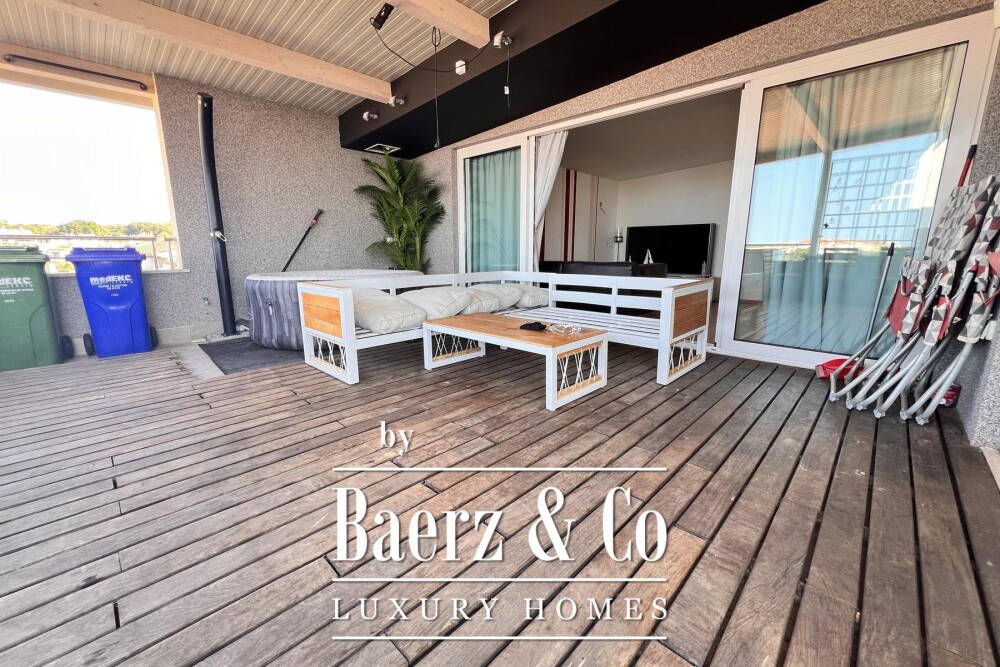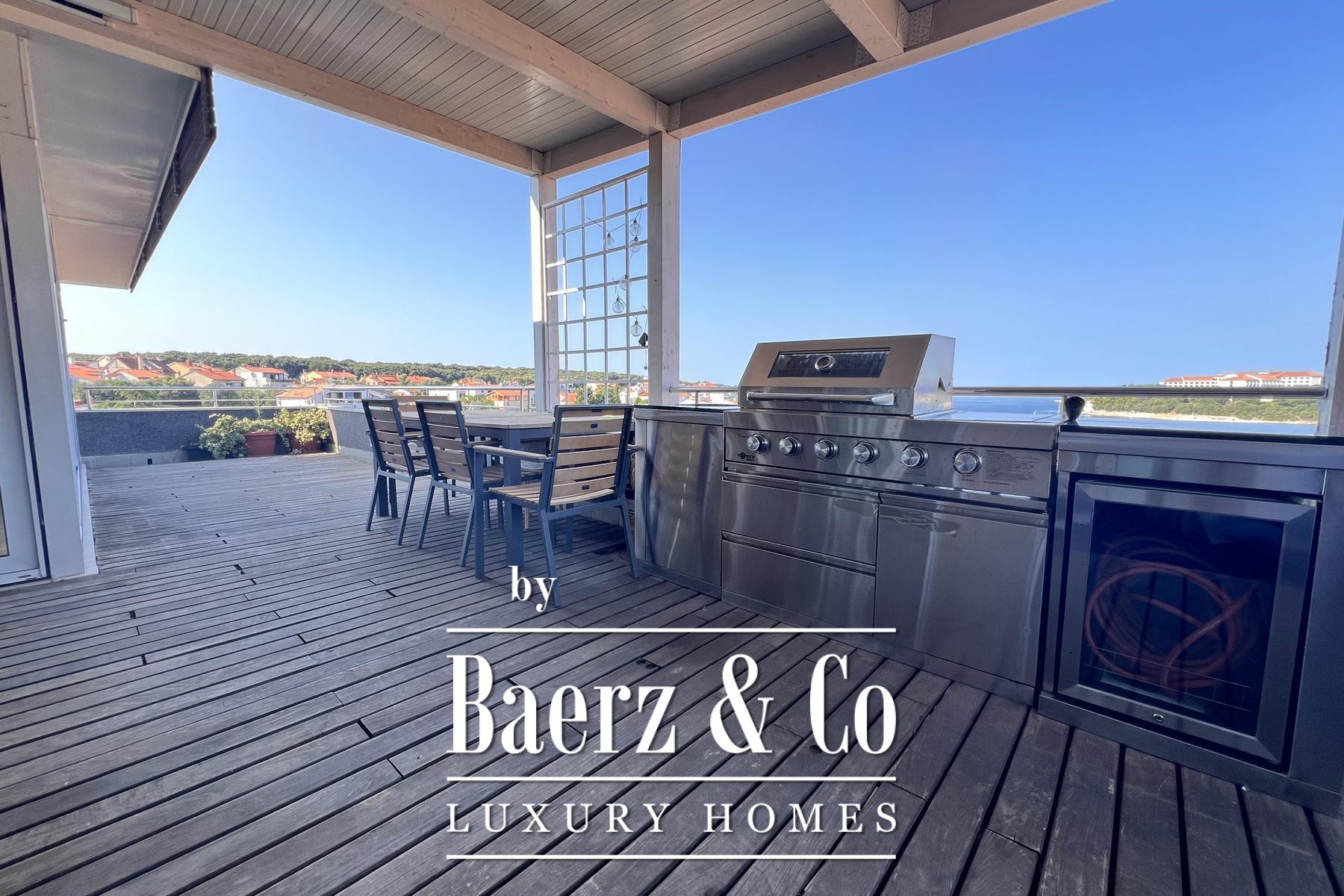 Apartment Medulin is set just 100 meters from the Adriatic, offering a luminous 200 m² penthouse in Pješčana Uvala. This property commands a direct, frontal sea view from its expansive covered terrace, complete with a jacuzzi and barbecue for lingering seaside evenings. The apartment occupies the entire second floor, with an open plan living area elegantly integrating the kitchen and dining space, and has five bedrooms and two bathrooms designed for both privacy and gathering. Parquet flooring brings warmth throughout, while the kitchen and bathrooms feature thoughtful ceramic finishes. The terrace's inviting teak surface unites outdoor serenity with Mediterranean rhythm.