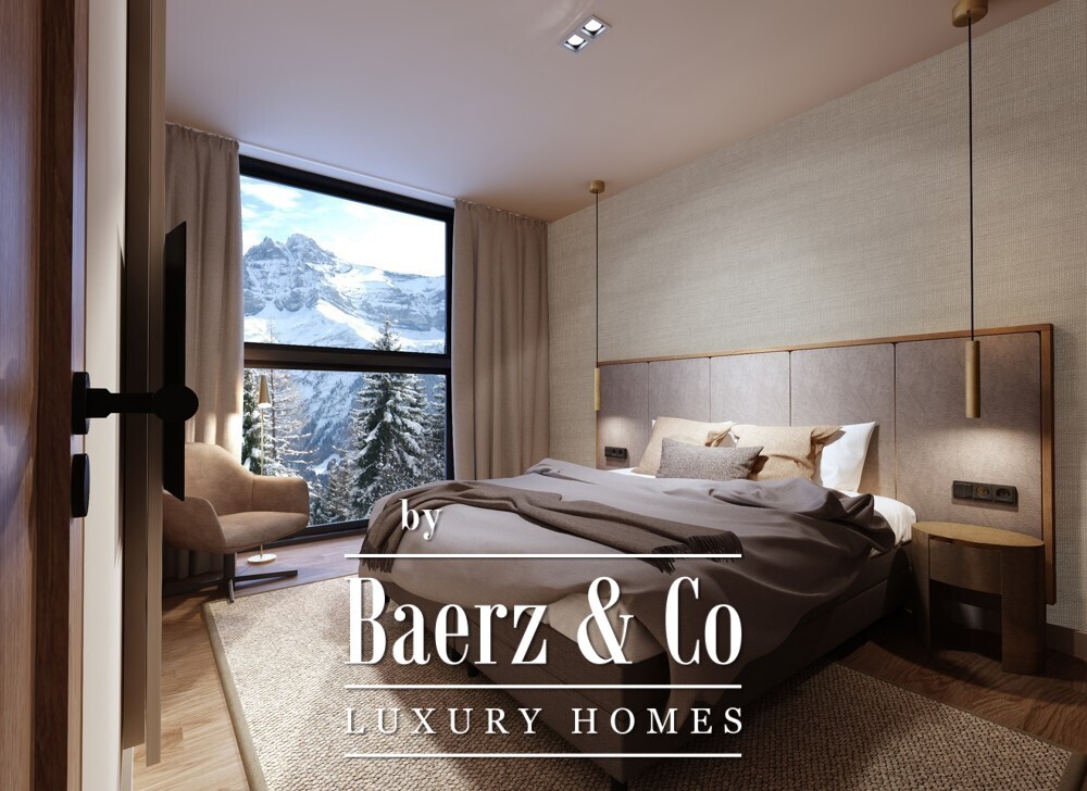 The orientation ensures sunlight fills the interiors, drawing attention to expansive views of the Alps and the storied village below. Underfloor heating introduces a sense of quiet comfort throughout the changing seasons. The penthouse’s layout merges precise functionality with understated elegance, available in two curated interior styles—modern luxury or luxurious alpine—both fostering a distinct sense of place.