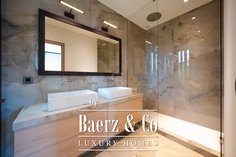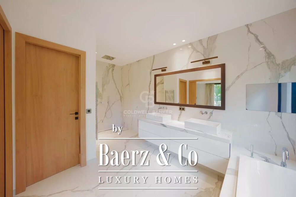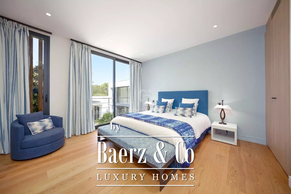 Each of the five en-suite bedrooms, including a main suite with walk-in closet, is oriented for calm and discretion. The villa also houses a dedicated cinema room, a fully equipped fitness suite, sauna, games room, and a wine cellar. Outside, multiple terraces, a 14-meter heated swimming pool, a summer kitchen, and a heated garage for four vehicles extend the experience of understated luxury.