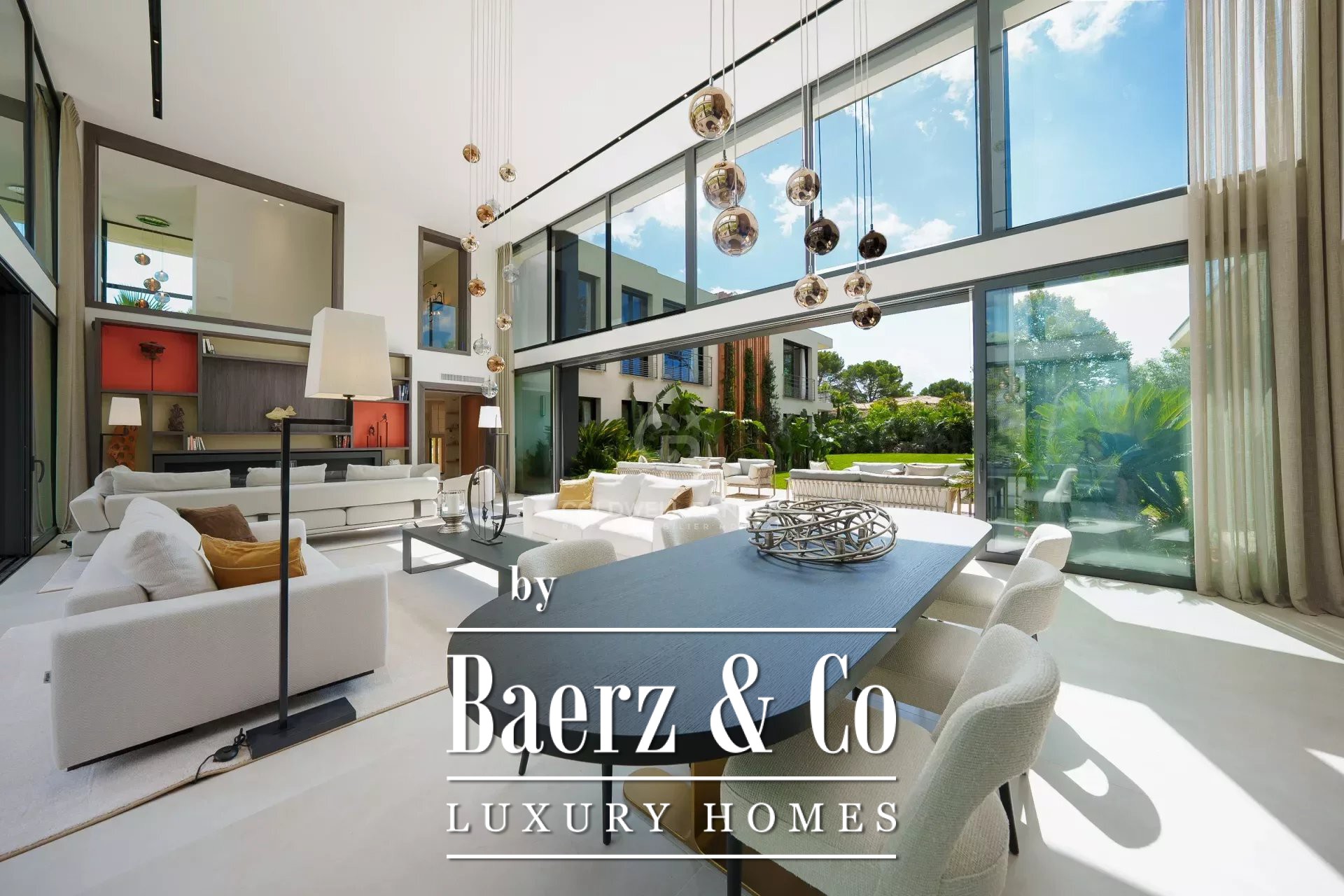 This villa Mougins, situated within the region’s most prestigious estate, offers an assured sense of privacy and refined contemporary living. The property unfolds across 700 m² of living area on a landscaped 2,700 m² plot, inviting natural light into its expansive interiors through south-facing floor-to-ceiling glass. Step into the double-height living room with six-meter ceilings, where openness and serenity define the rhythm of daily life.