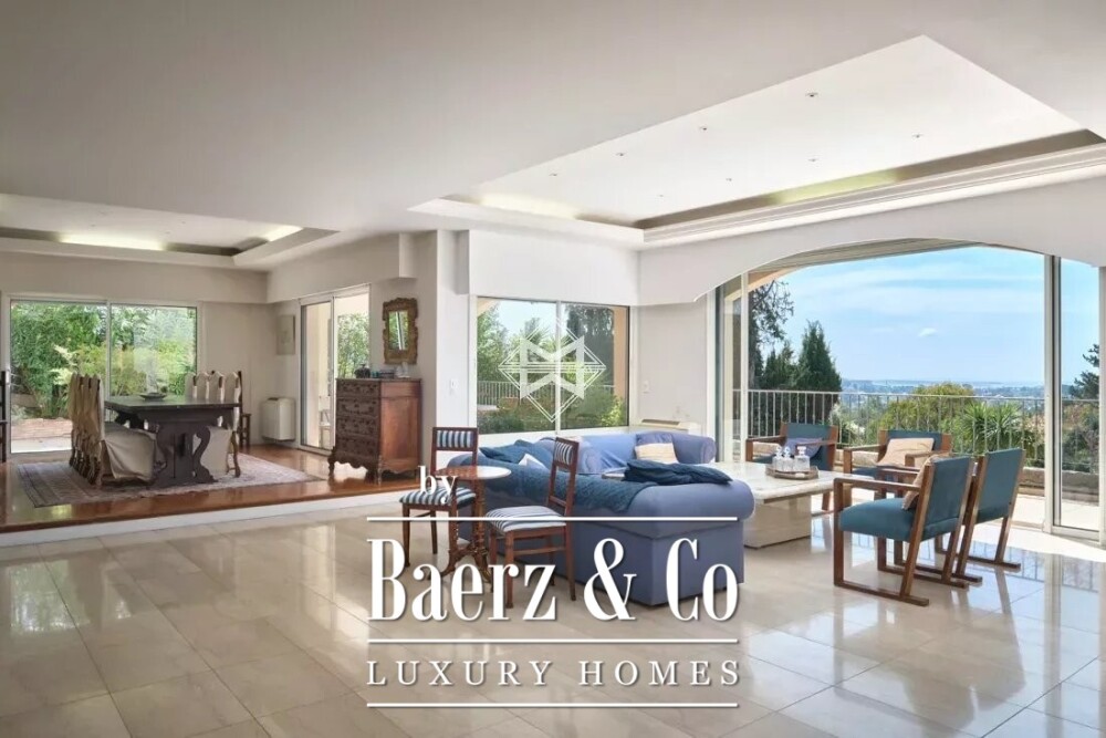 Villa Mougins with panoramic sea and mountain views invites a rare confluence of privacy and Mediterranean light. This 362 m² residence stands within a secure gated domain, perched above the old village of Mougins with unobstructed views stretching from the Lérins Islands to the Estérel peninsula. The villa’s south-facing orientation fills its three levels with natural light at every hour, further heightened by expansive openings that blur the transition between interior and the extraordinary panorama.