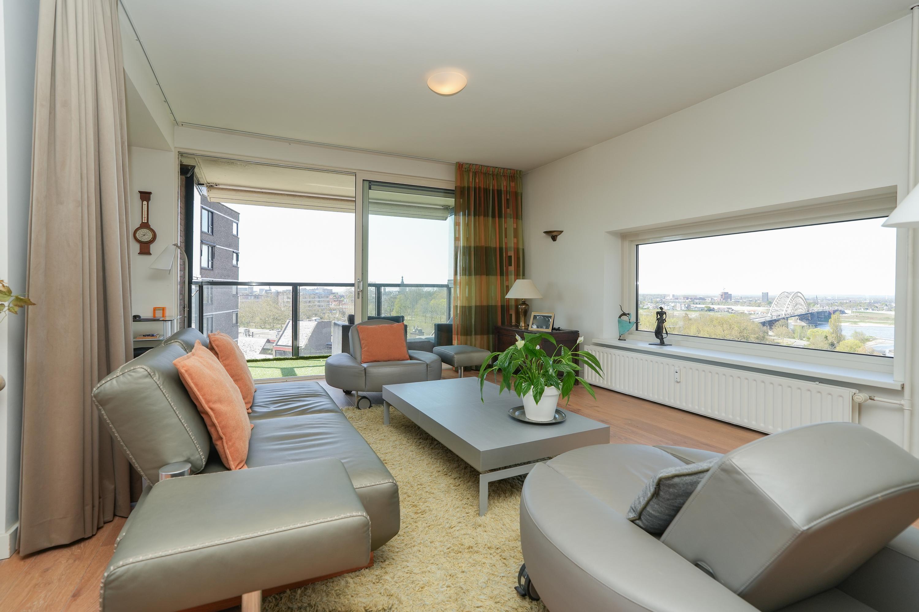 With sweeping views over the River Waal, the Ooijpolder and the skyline of Nijmegen, this exceptional apartment offers a living experience that is rarely found. This bright residence is located on the sixth floor of a well-maintained building with a total of nine storeys, on the edge of the highly sought-after Nijmegen-Oost district. The combination of generous space, spectacular views and an excellent location creates an extraordinary living experience, further enhanced by the comfort of a central yet pleasant setting.