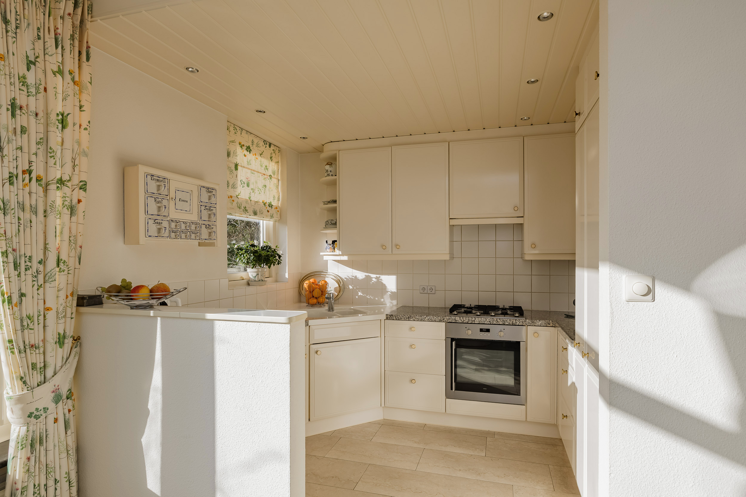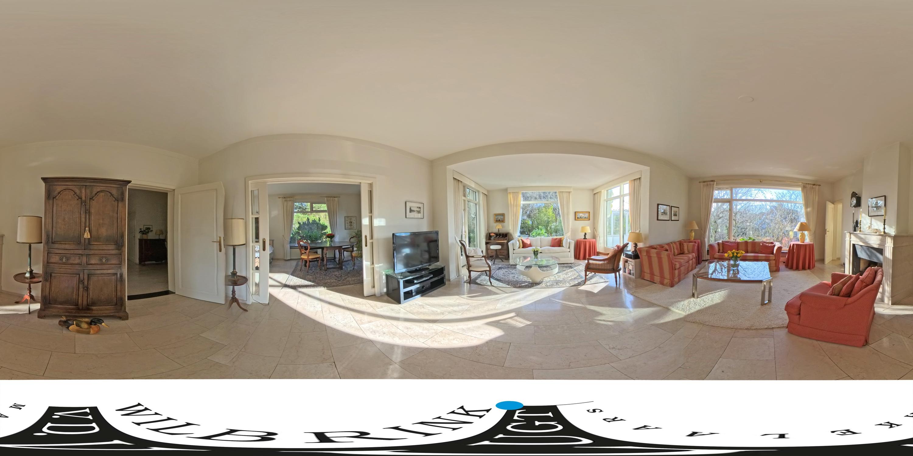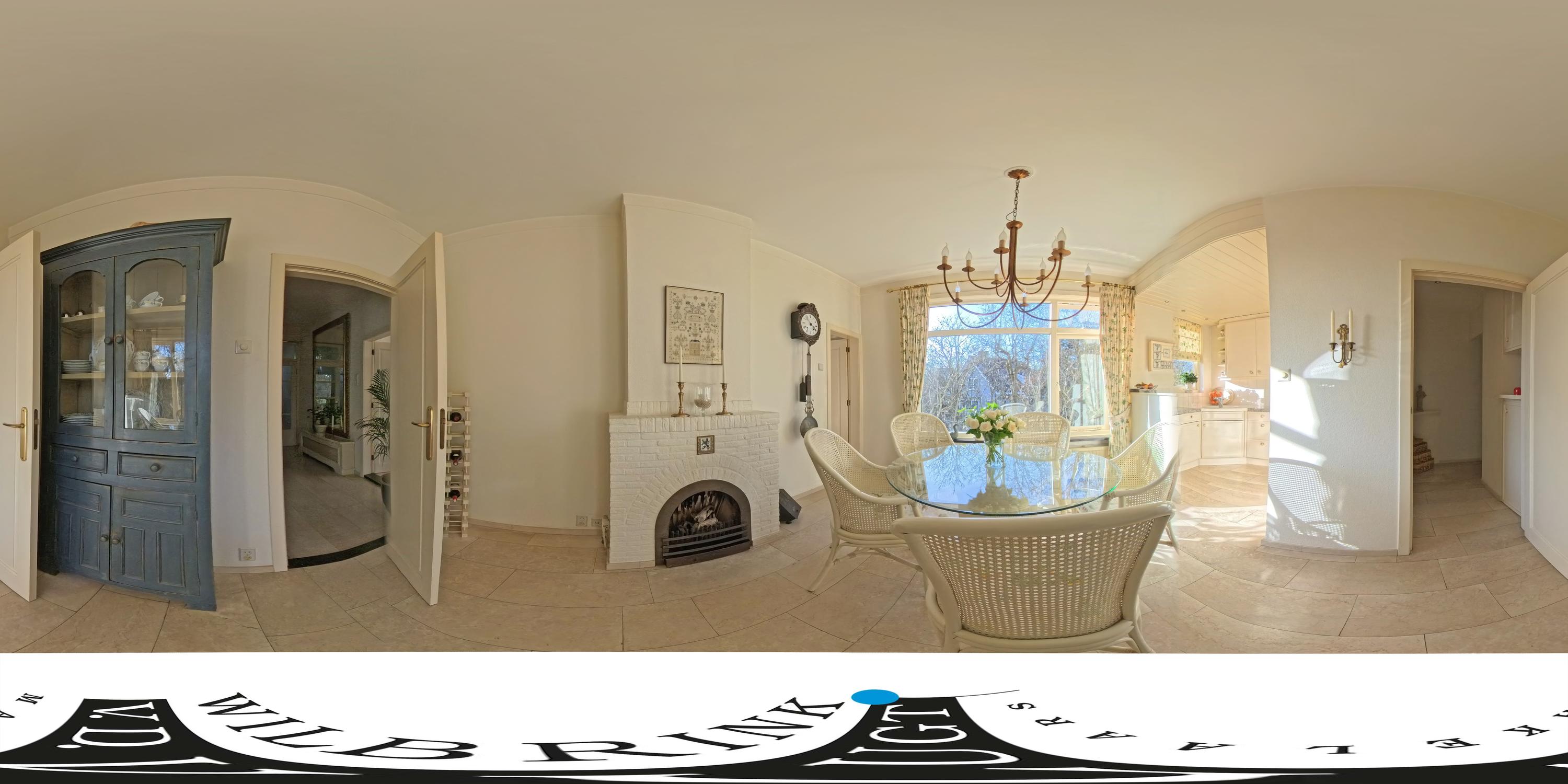 The spacious living room is a delightful living space with a warm, inviting atmosphere. The fireplace and elegant marble floor give the room character, while the doors from the living room provide direct access to the garden. The sun circles the house from morning to evening, creating a beautiful play of light.