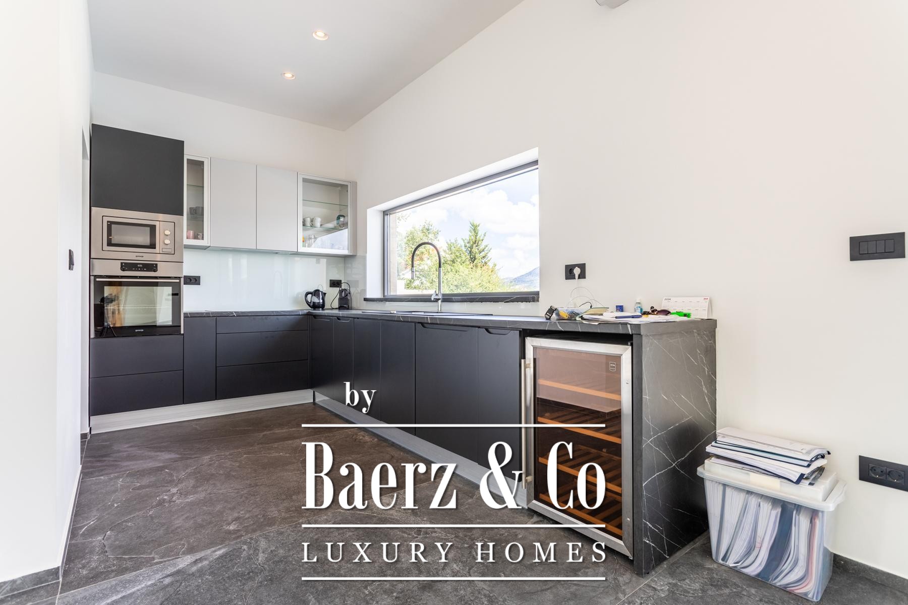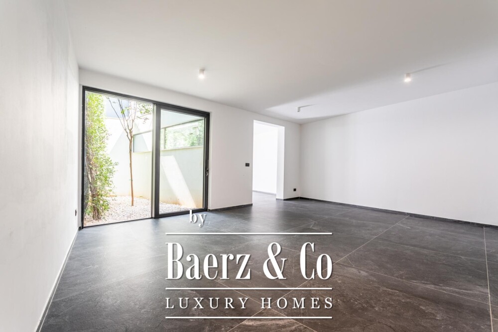 Inside, four bedrooms and five bathrooms offer robust privacy, complemented by a flowing layout that places the living room and a fully equipped kitchen at the heart of the home. Full-height triple-glazed windows and electric blinds mark the seamless transition between interior space and terrace, while large-format ceramic tiles and parquet flooring instil a contemporary rhythm throughout. The heated pool commands the terrace, inviting quiet reflection or discreet gatherings with sea as the backdrop.
