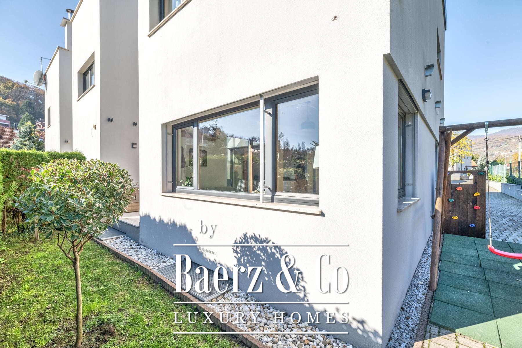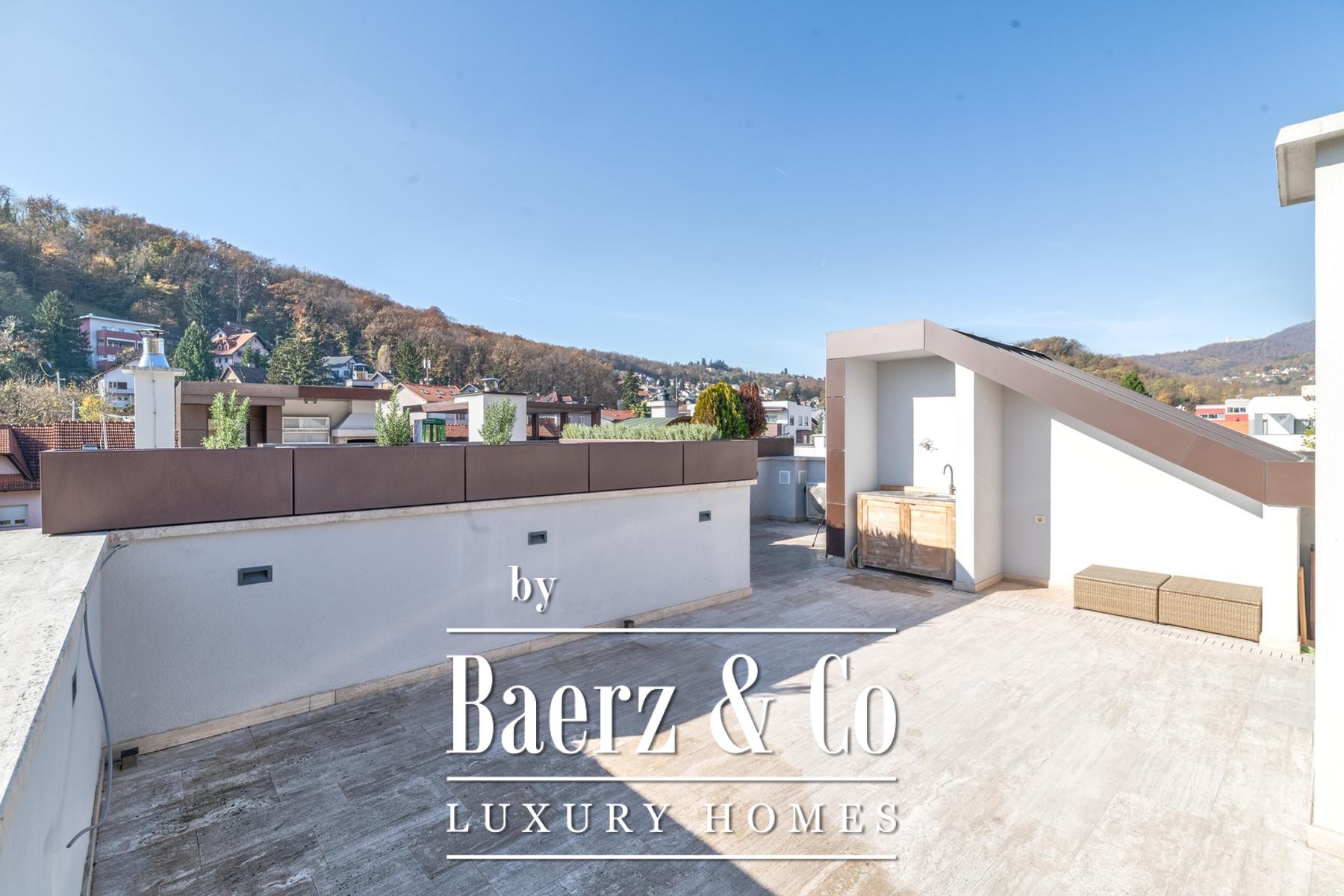 Mlinovi, Graščica street, a beautiful three-story, six-room apartment with a garden in an excellent building, recently built in 2011, with 3 outdoor parking spaces.It is spread over three floors connected by an internal staircase (basement, ground floor and first floor) with a closed area of 179 m2, an uncovered terrace of 14 m2, a covered roof terrace of 47 m2, a garden of 58 m2, 3 outdoor parking spaces each with an area of 12.5 m2. Total calculated NKP 213 m2. The ground floor consists of an entrance hall, toilet, living room with access to the terrace and garden, kitchen and dining room. Three