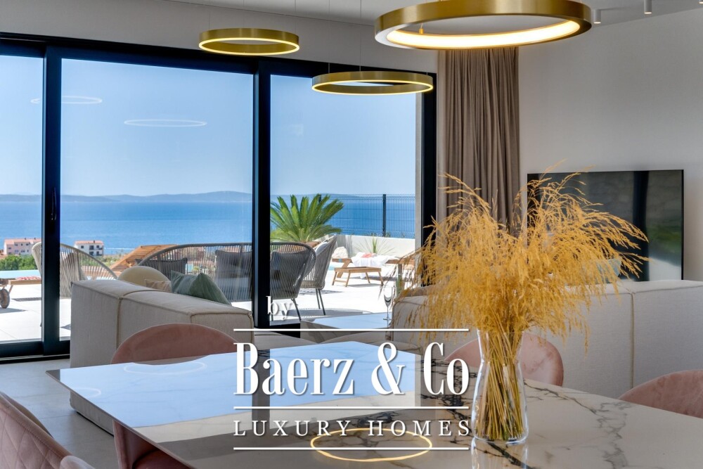 Upstairs, three bedrooms with en-suite bathrooms offer sanctuary, two enjoying terraces with open sea views. The uppermost floor is reserved for the master suite: a private terrace, a tranquil bathing space, and uninterrupted panoramas. High-quality finishes, private parking, and thoughtful outdoor spaces distinguish the property, while its location places daily essentials within a short walk, completing an atmosphere of understated luxury. The villa in Podstrana is defined by clarity of design and a strong sense of place.