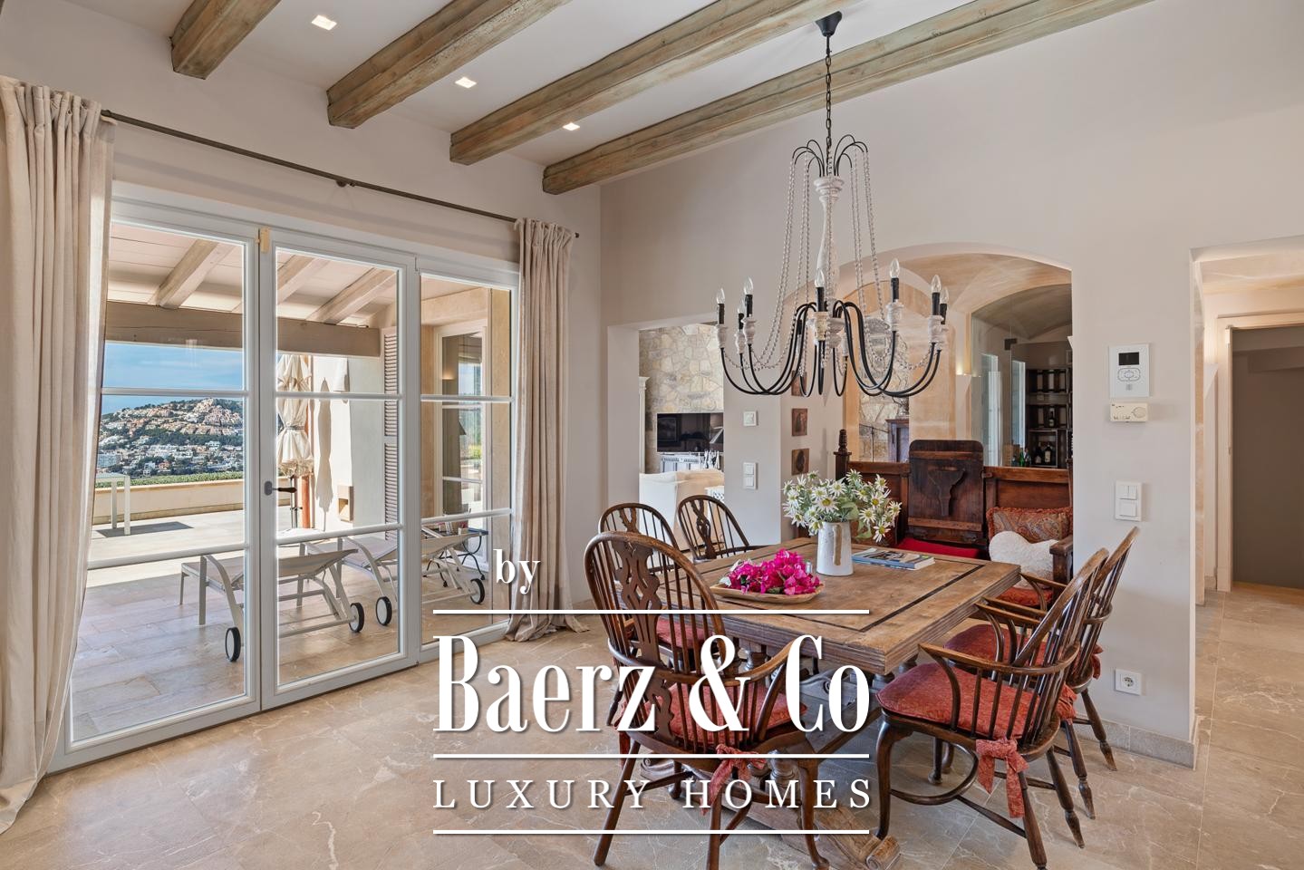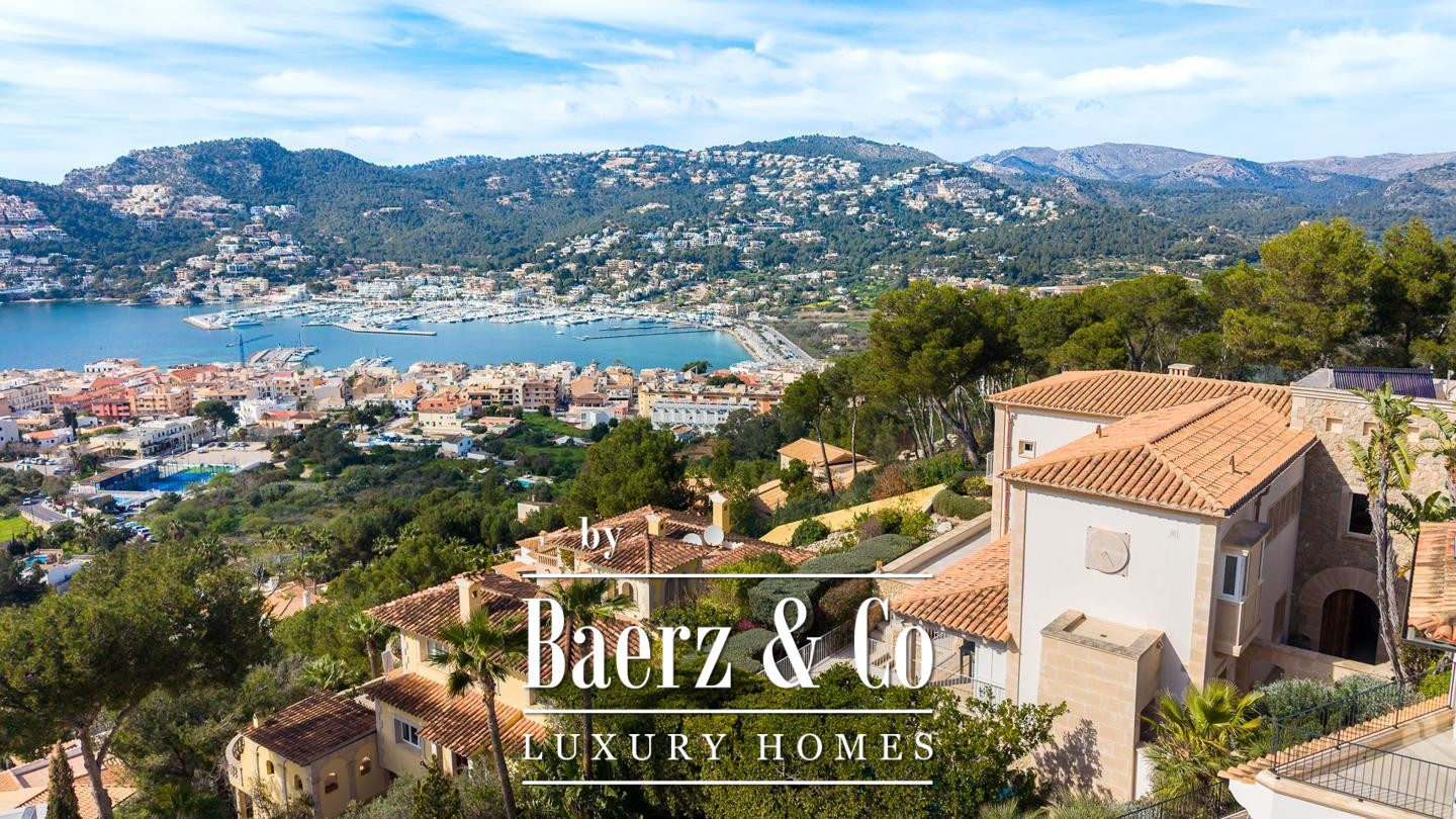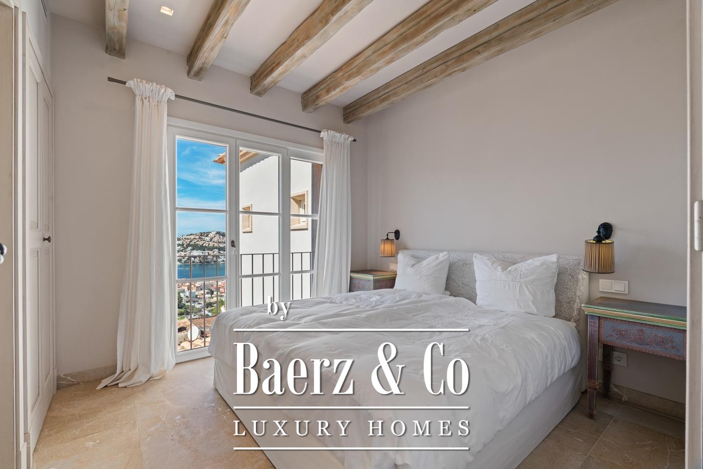 Villa Port d'Andratx with sea and harbour views is located in one of the most coveted enclaves in Mallorca. This four-storey residence, spanning 482 m² on a 778 m² plot, balances privacy and architectural presence with a character that resonates. A lift seamlessly connects all levels, setting a tone of ease and discretion from the cobbled entrance and garage designed for several vehicles.