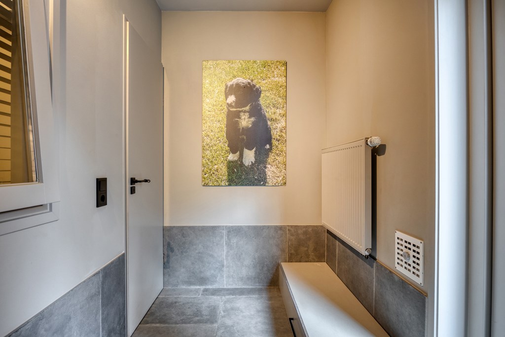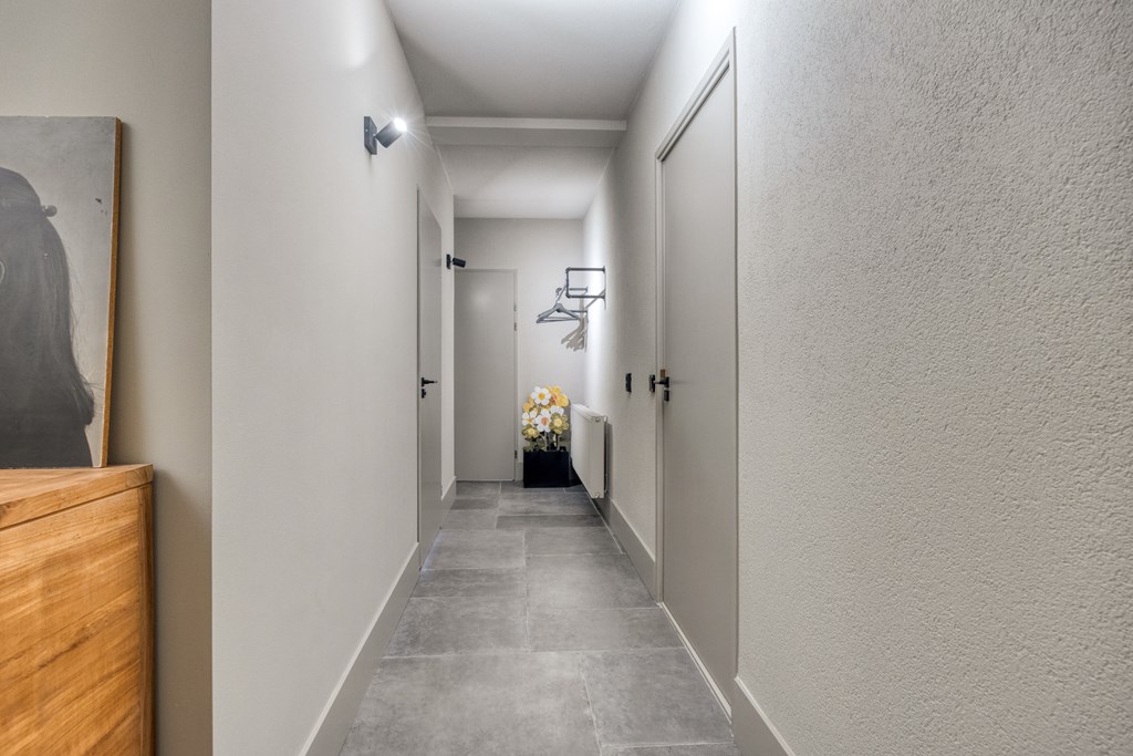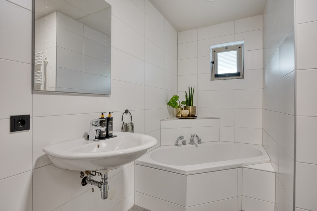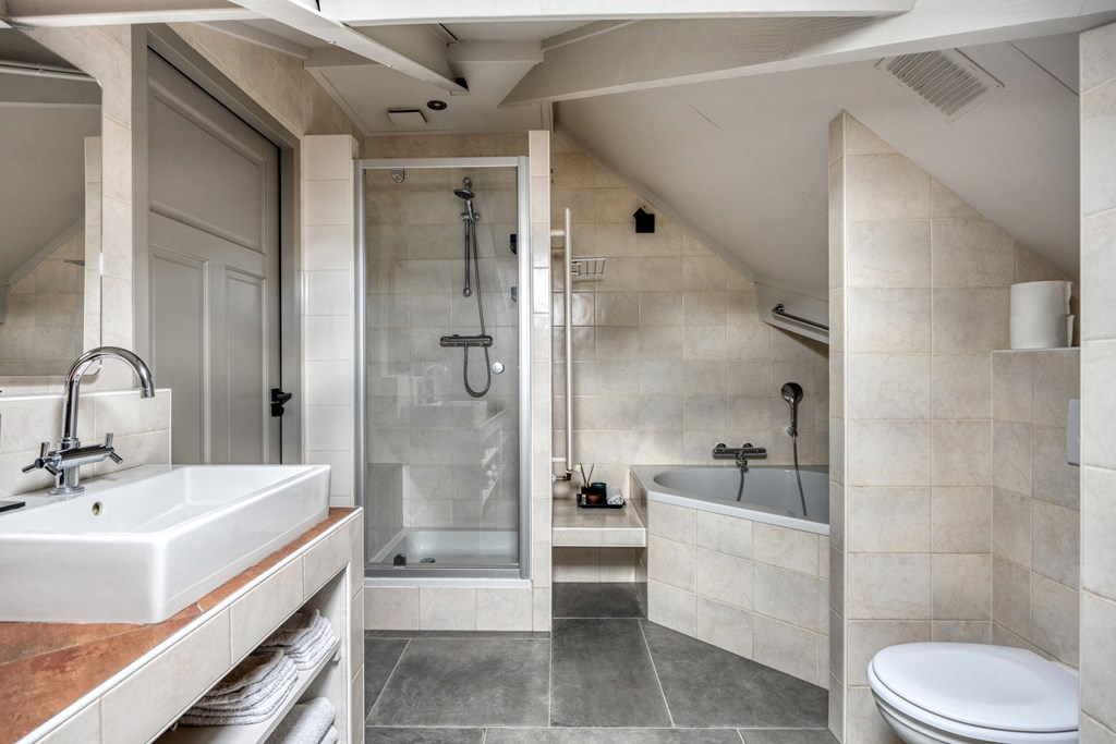 Een nette badkamer grenst eveneens aan de overloop. Deze is voorzien van een ruime douchecabine, ligbad, wastafel met spiegel en een zwevend toilet. De neutrale afwerking maakt de badkamer tijdloos en direct klaar voor gebruik.