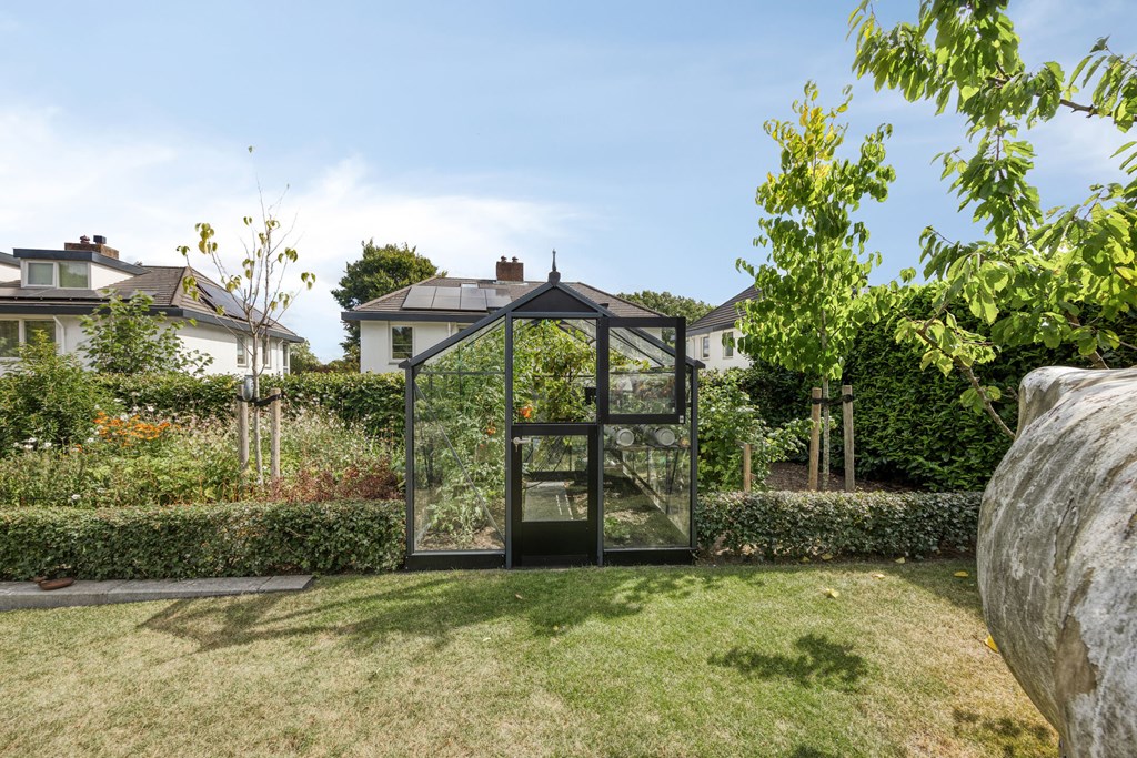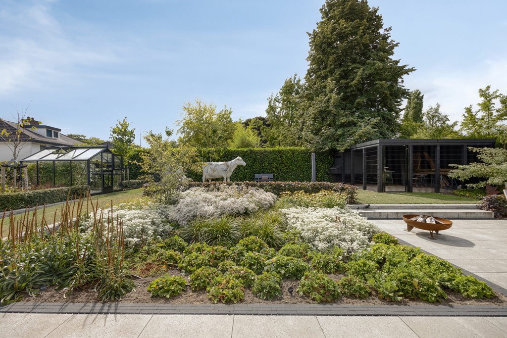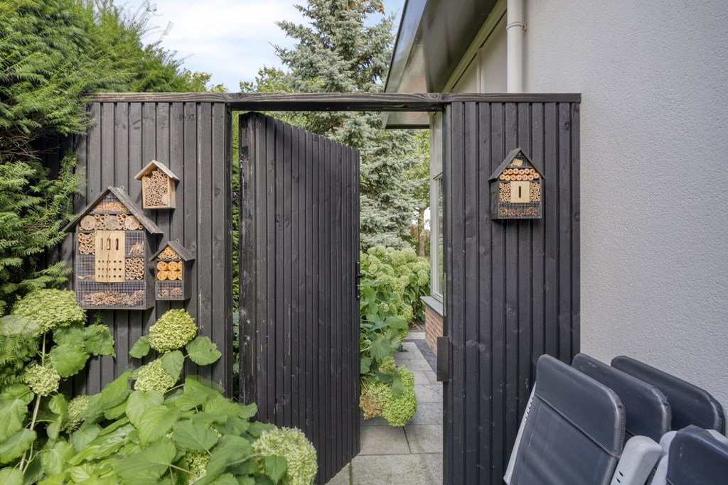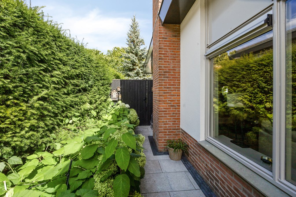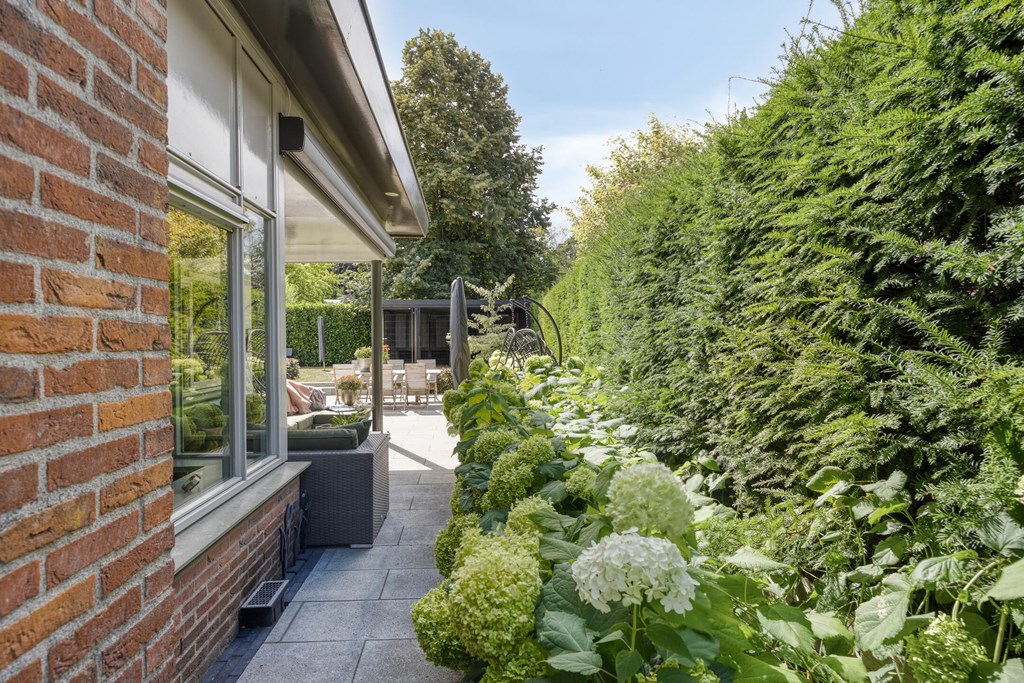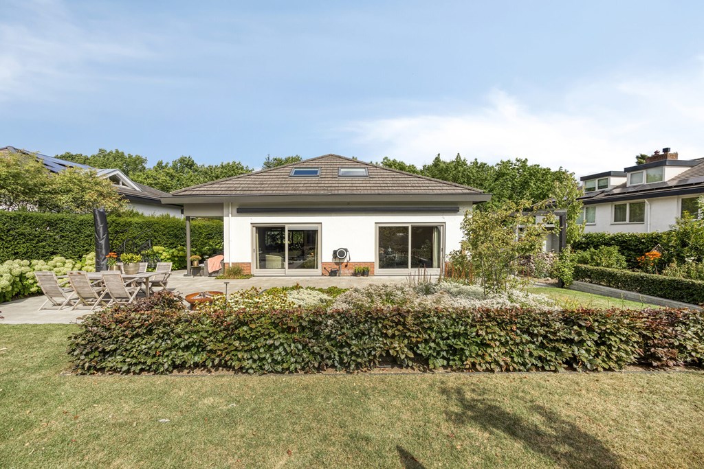 De groene en zonnige, op het zuiden gelegen achtertuin vormt een waar hoogtepunt van deze woning. Het ruime terras geeft volop ruimte aan een buitentafel en de westelijke veranda biedt plaats aan een loungeset. Het vele groen zorgt voor een natuurlijke en rustige uitstraling. Een kas biedt mogelijkheden voor tuinliefhebbers, en achterin de tuin bevindt zich een volière die gebruikt kan worden voor vogels of andere dieren. Dankzij de achterom is de tuin bovendien goed toegankelijk.
