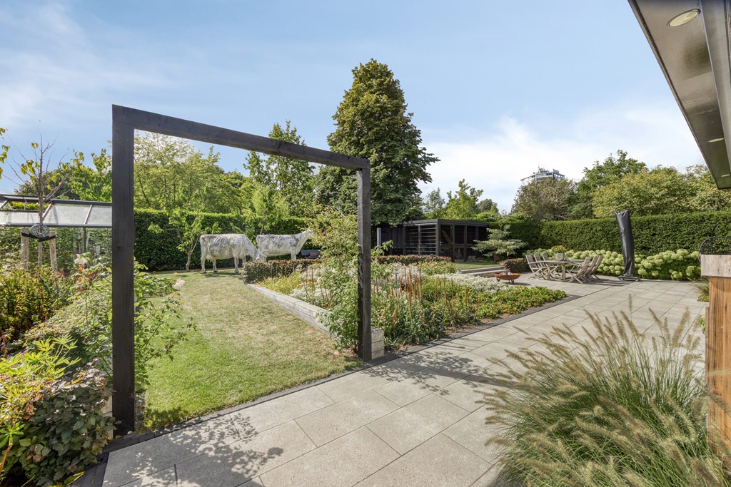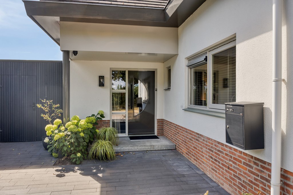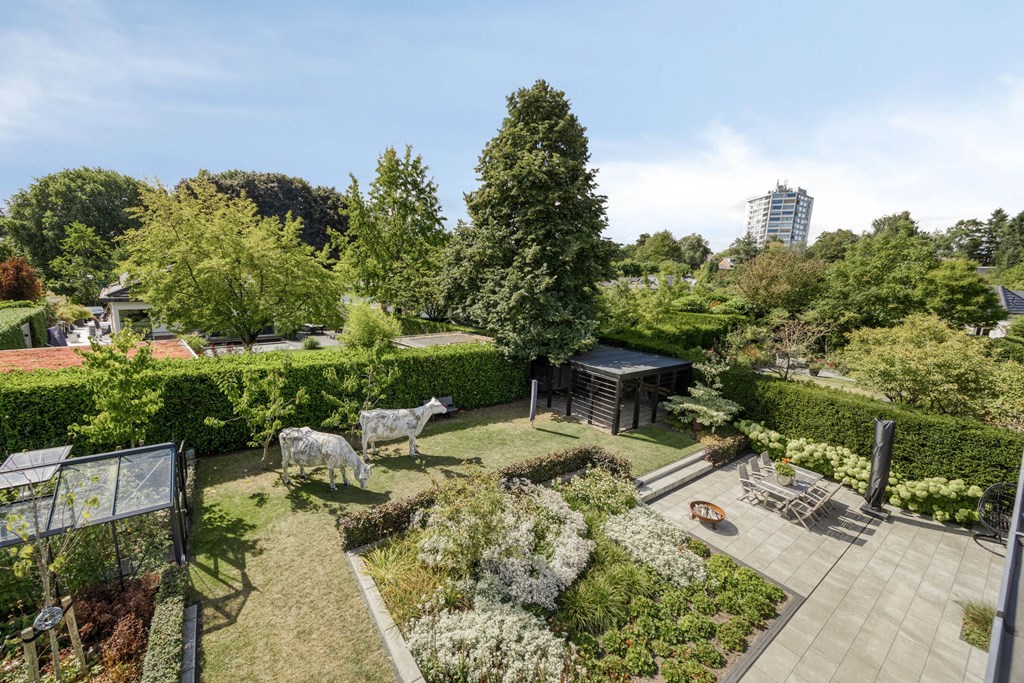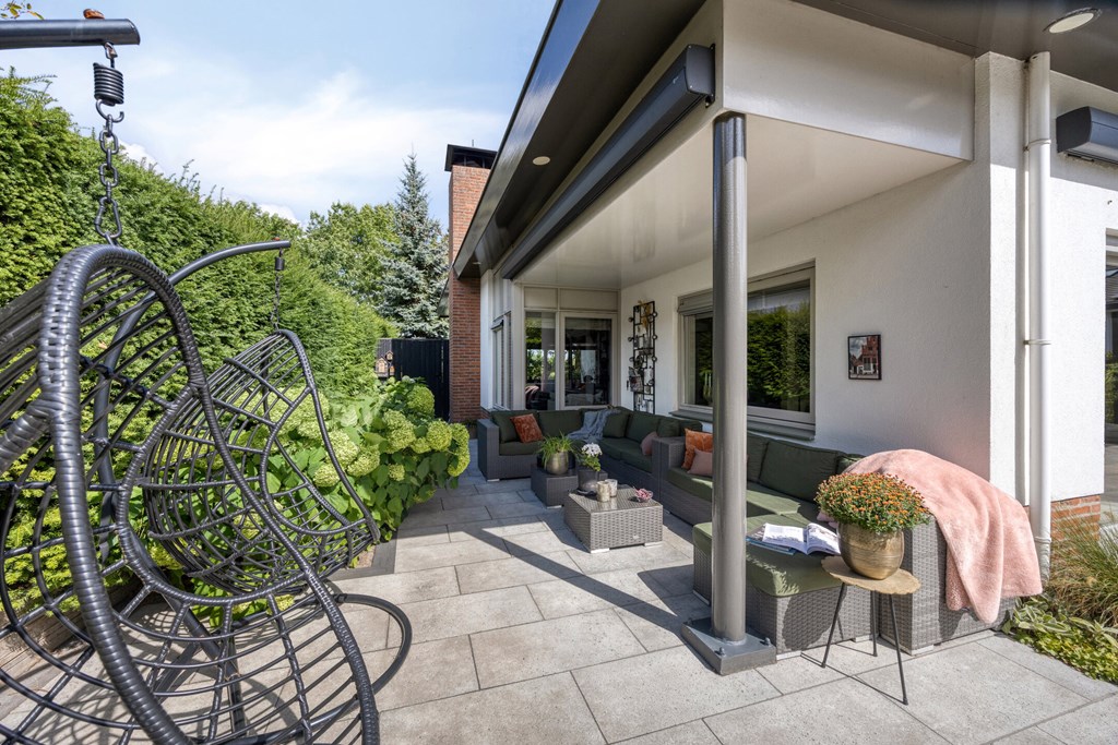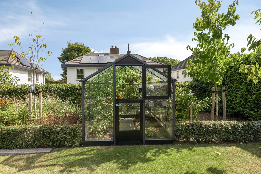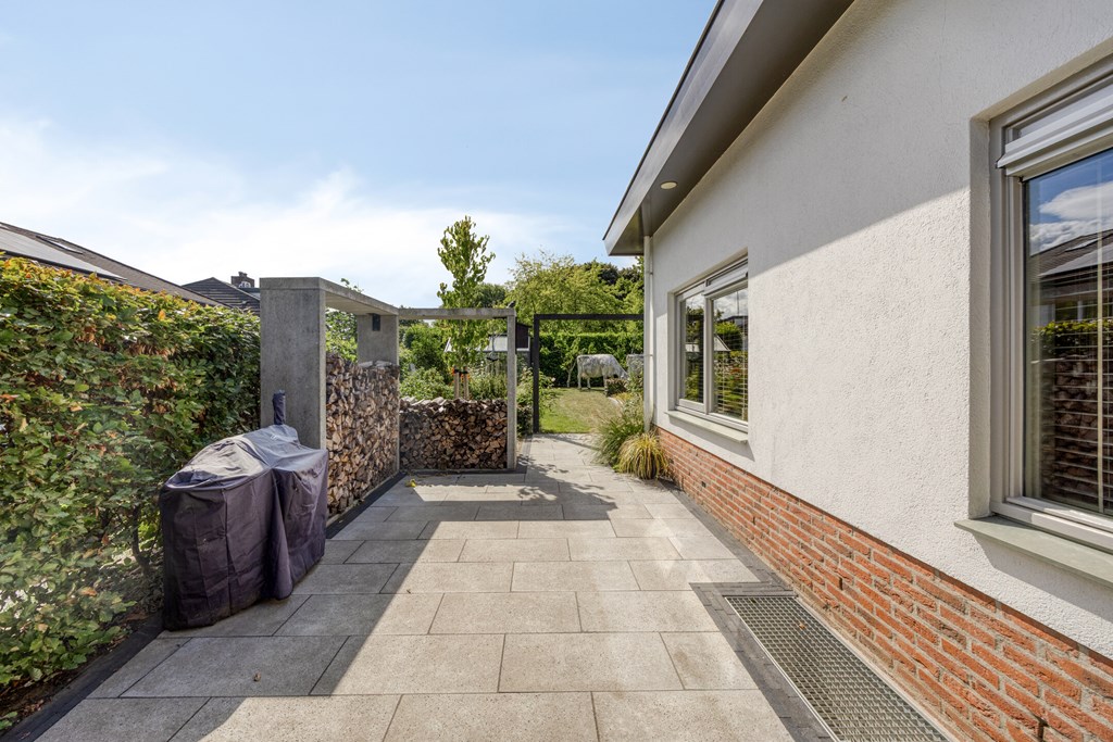 De groene en zonnige, op het zuiden gelegen achtertuin vormt een waar hoogtepunt van deze woning. Het ruime terras geeft volop ruimte aan een buitentafel en de westelijke veranda biedt plaats aan een loungeset. Het vele groen zorgt voor een natuurlijke en rustige uitstraling. Een kas biedt mogelijkheden voor tuinliefhebbers, en achterin de tuin bevindt zich een volière die gebruikt kan worden voor vogels of andere dieren. Dankzij de achterom is de tuin bovendien goed toegankelijk.