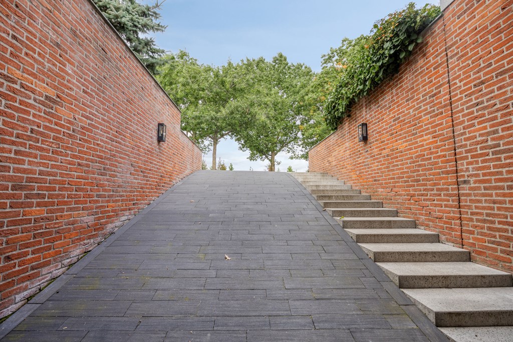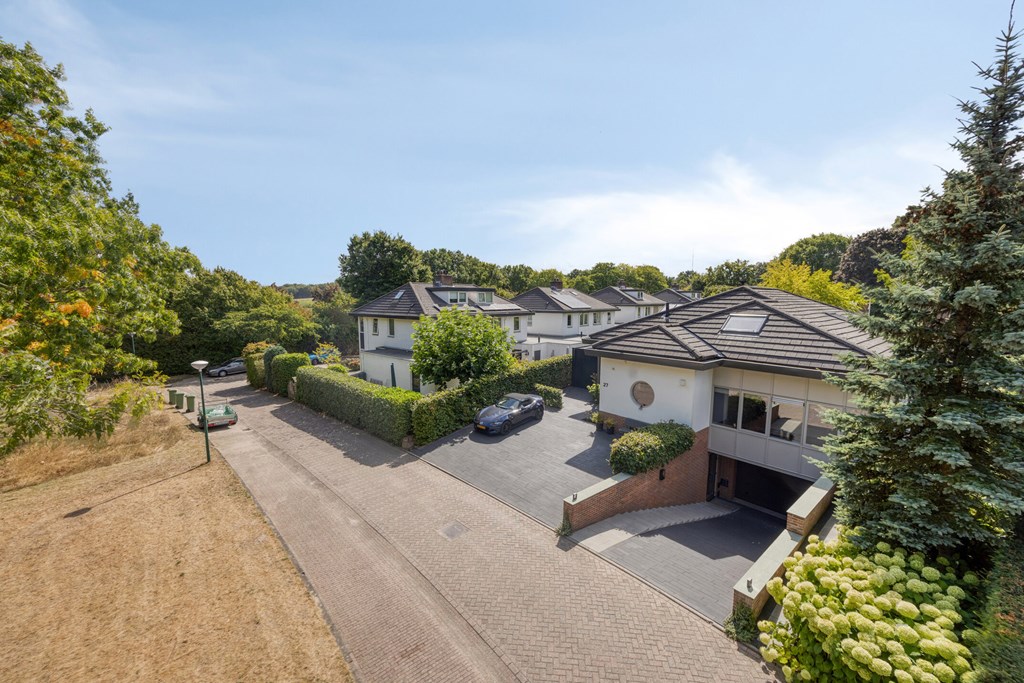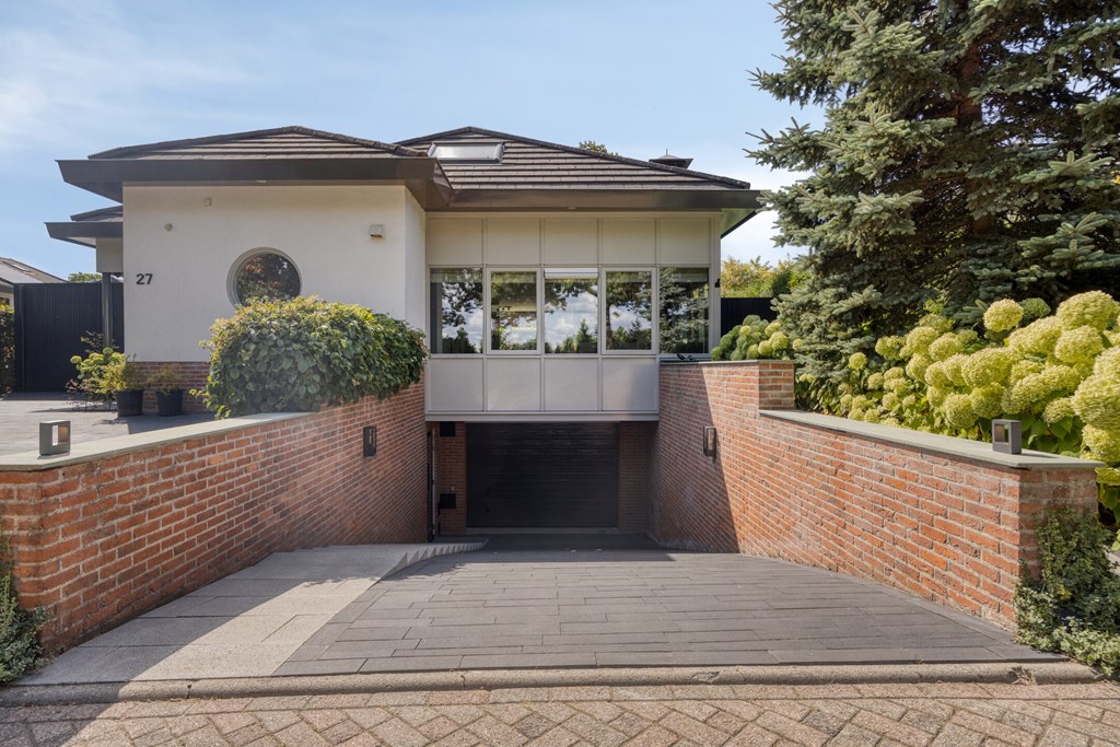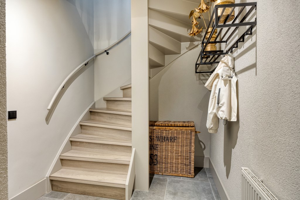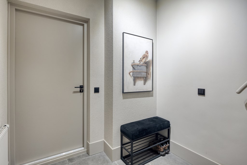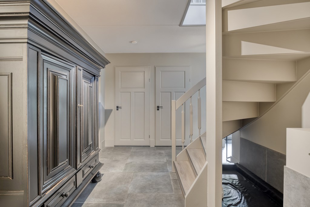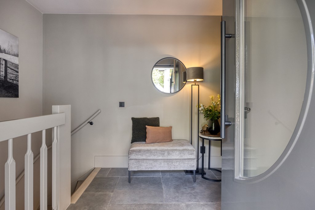 Een royale oprit met plaats voor meerdere auto’s leidt naar de entree en de ondergelegen garage. Binnen treft u de ruime hal, die fungeert als centrale verbinding tussen de verschillende vertrekken. Er is ruimte voor een kapstok en opbergmeubel, waardoor de hal zowel praktisch als representatief is ingericht.
