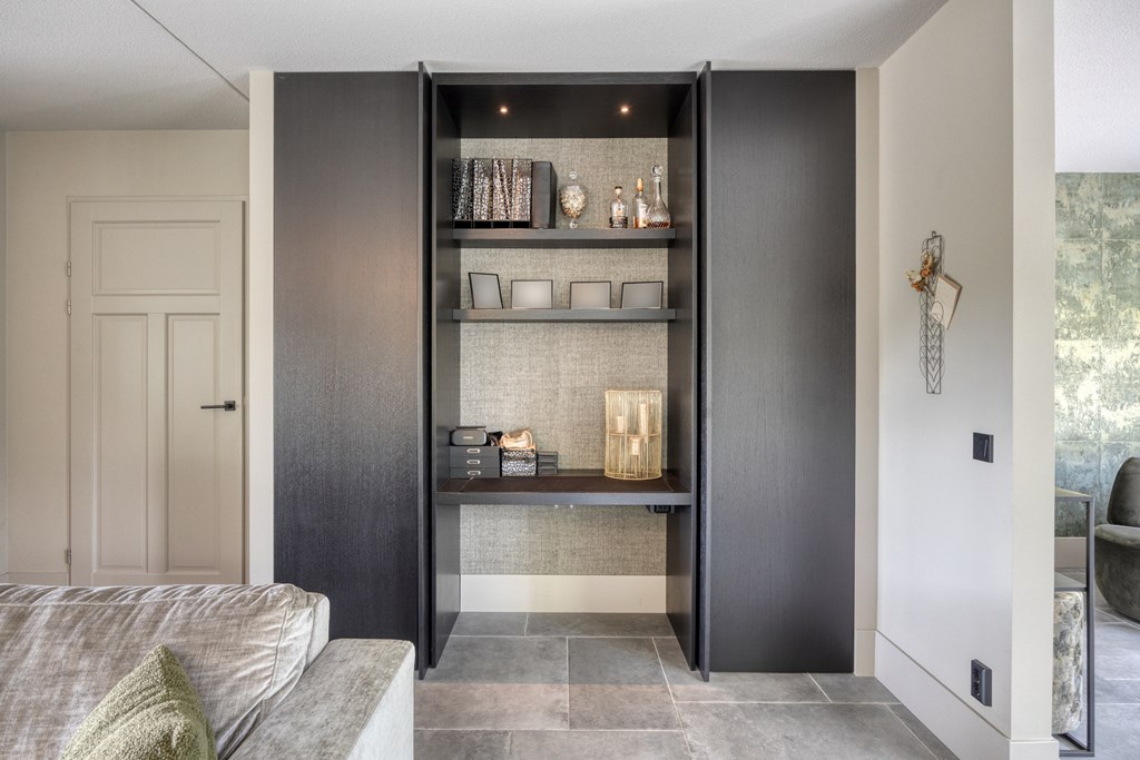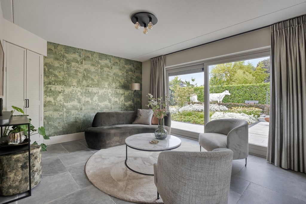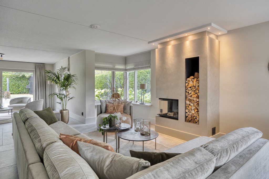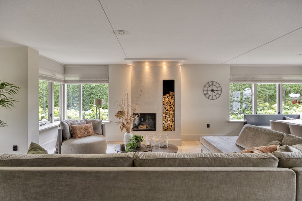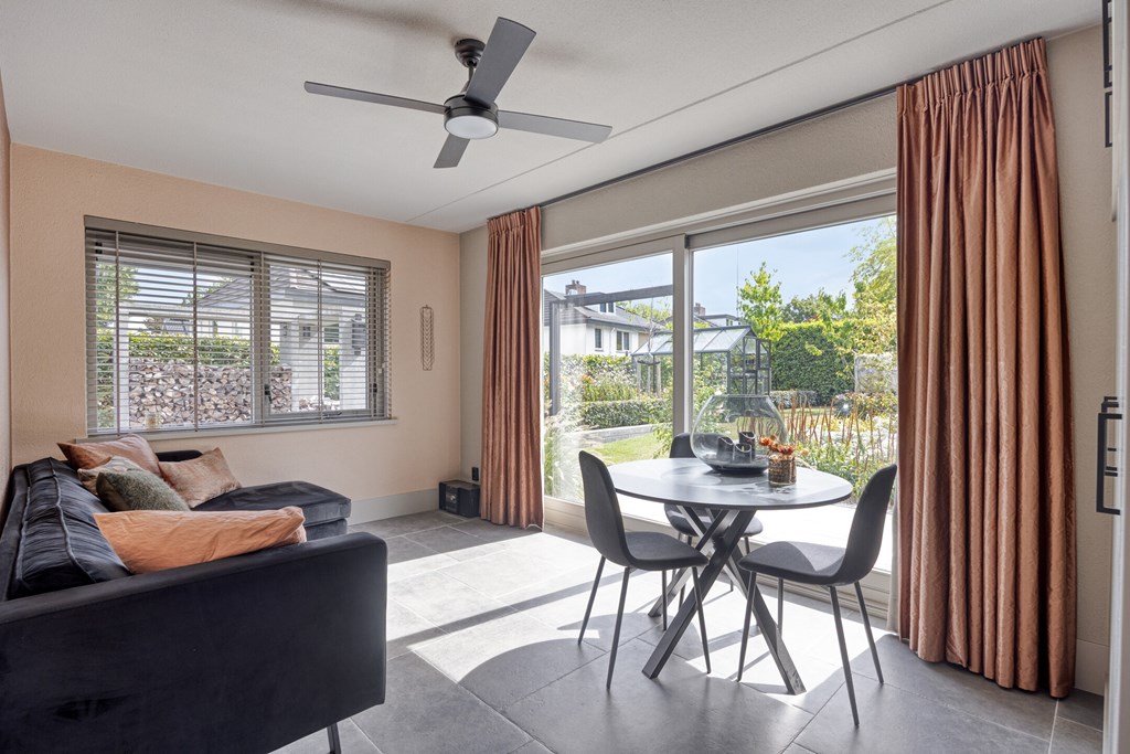 De lichte en open woonkamer vormt het hart van de woning. Dankzij de grote raampartijen rondom geniet u hier van veel natuurlijk licht en een heerlijk ruimtelijk gevoel. De indeling omvat meerdere comfortabele zitgedeeltes en een eetruimte, voorzien van een eetkamerbank met opbergruimte onder de zitting. Een stijlvolle houtgestookte inbouwhaard vormt de eyecatcher. Via schuifdeuren is er directe toegang tot de tuin. Daarnaast is er een extra kamer, die voorheen in gebruik was als slaapkamer. Deze ruimte is uitermate geschikt als lees-, of studeerkamer en is uitgerust met een plafondventilator en eveneens voorzien van schuifdeuren naar de tuin.