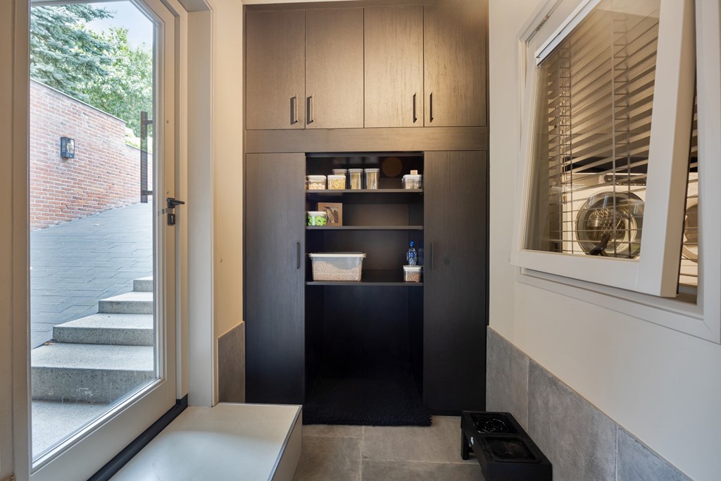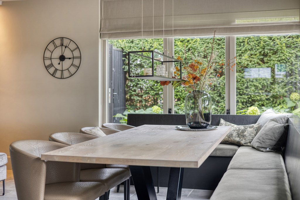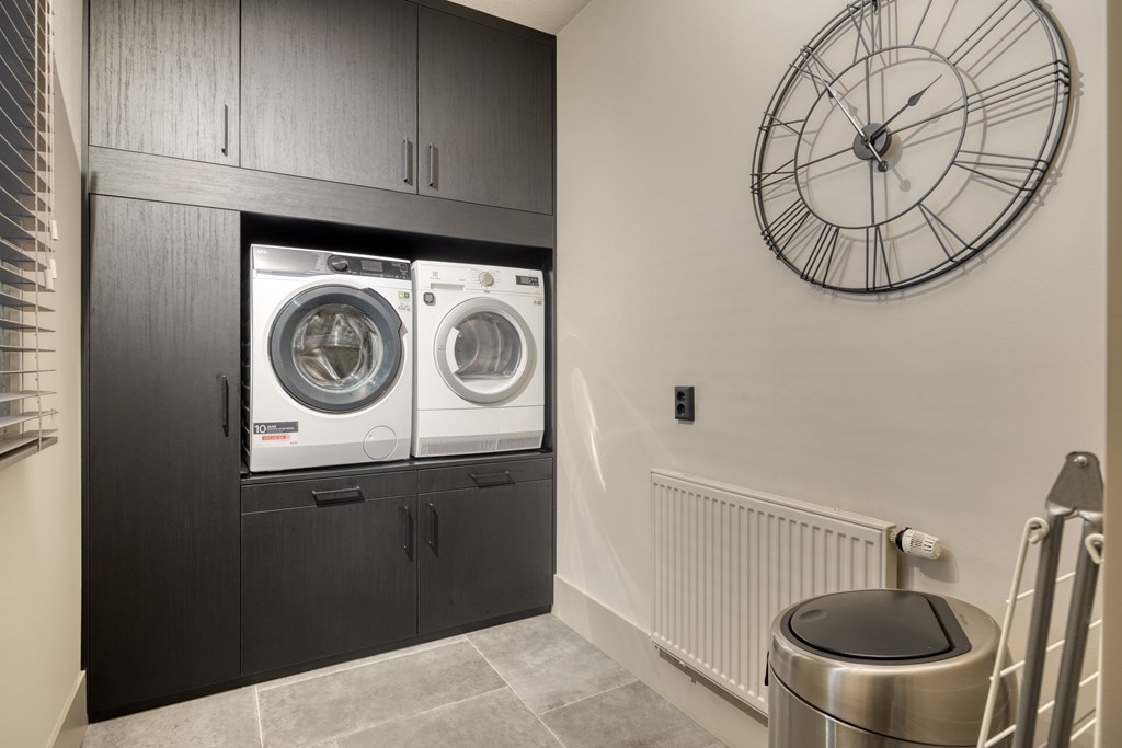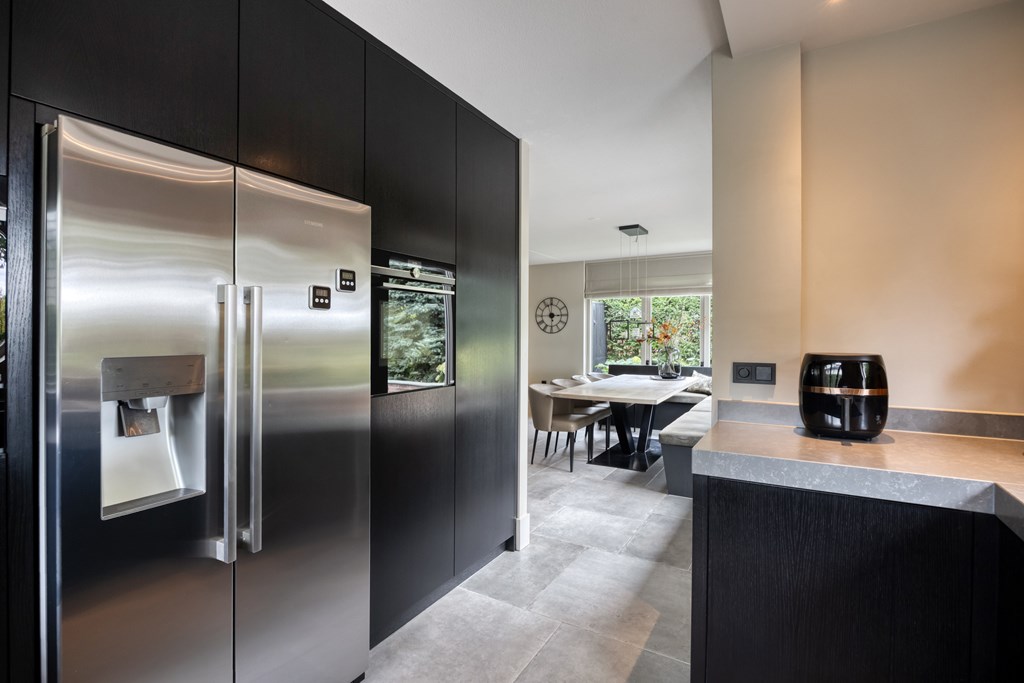 De moderne halfopen keuken grenst direct aan de eetkamer. Het U-vormige aanrecht is voorzien van hoogwaardige Siemens apparatuur, waaronder een inductiekookplaat met geïntegreerde afzuiging, Quooker-kraan, combimagnetron, volautomatische koffiemachine, warmhoudlade, koel-vriescombinatie met water- en ijsdispenser, vaatwasmachine en spoelbak. De keuken combineert stijl en functionaliteit en is een fijne plek om te koken en gezellig samen te zijn.