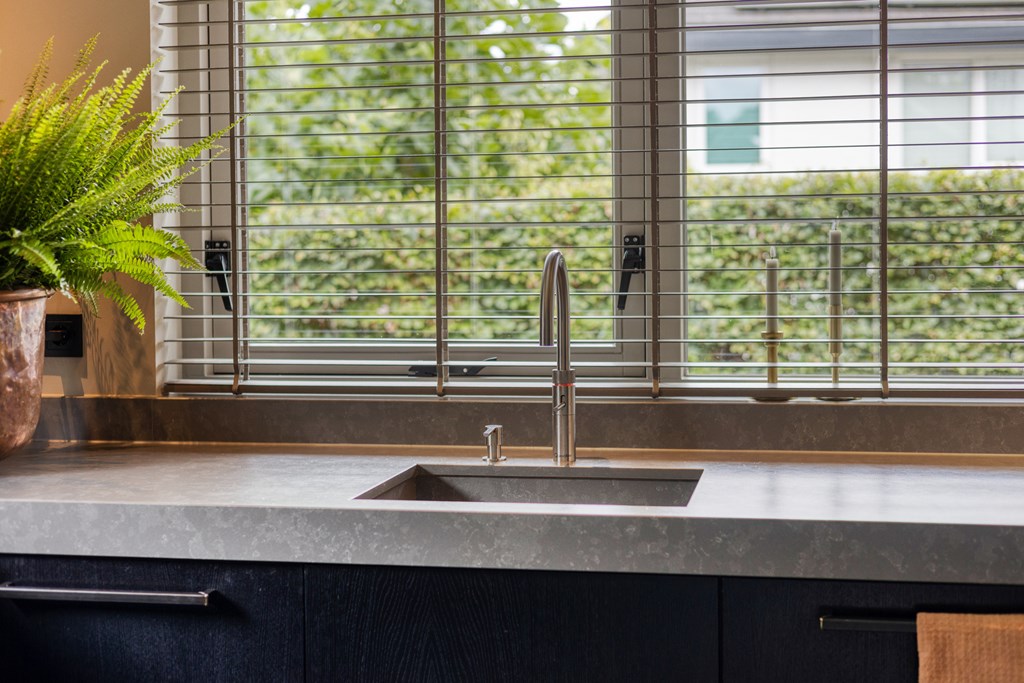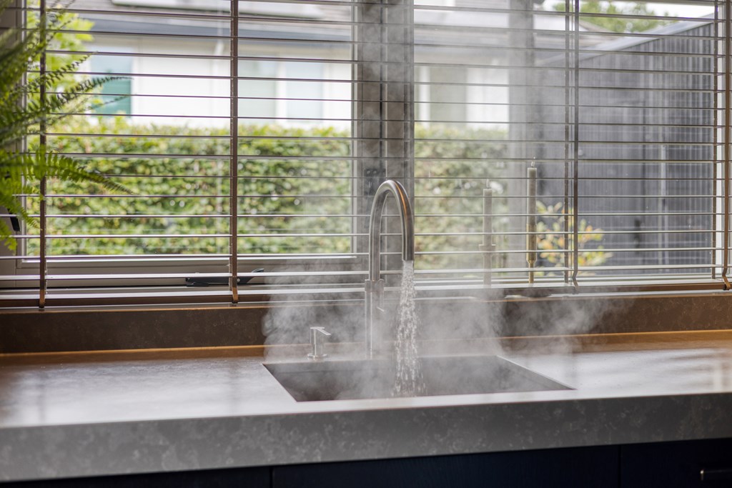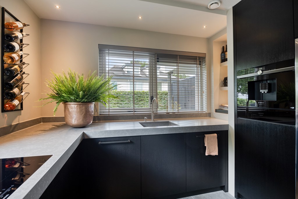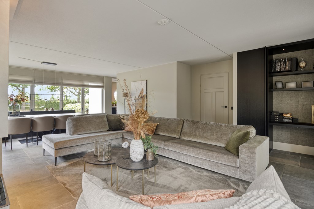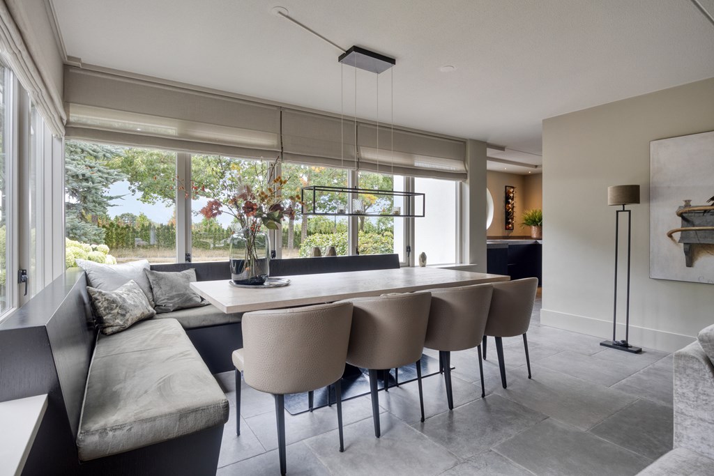 De moderne halfopen keuken grenst direct aan de eetkamer. Het U-vormige aanrecht is voorzien van hoogwaardige Siemens apparatuur, waaronder een inductiekookplaat met geïntegreerde afzuiging, Quooker-kraan, combimagnetron, volautomatische koffiemachine, warmhoudlade, koel-vriescombinatie met water- en ijsdispenser, vaatwasmachine en spoelbak. De keuken combineert stijl en functionaliteit en is een fijne plek om te koken en gezellig samen te zijn.