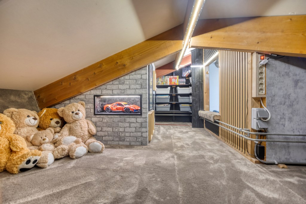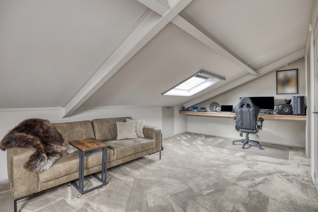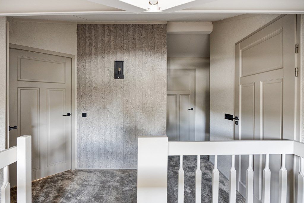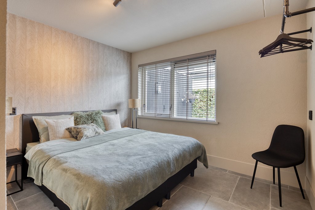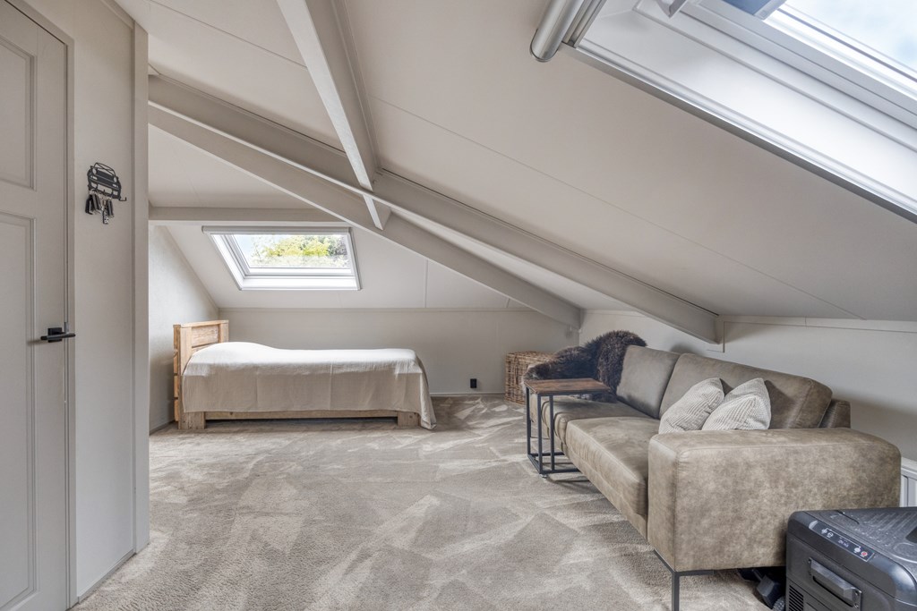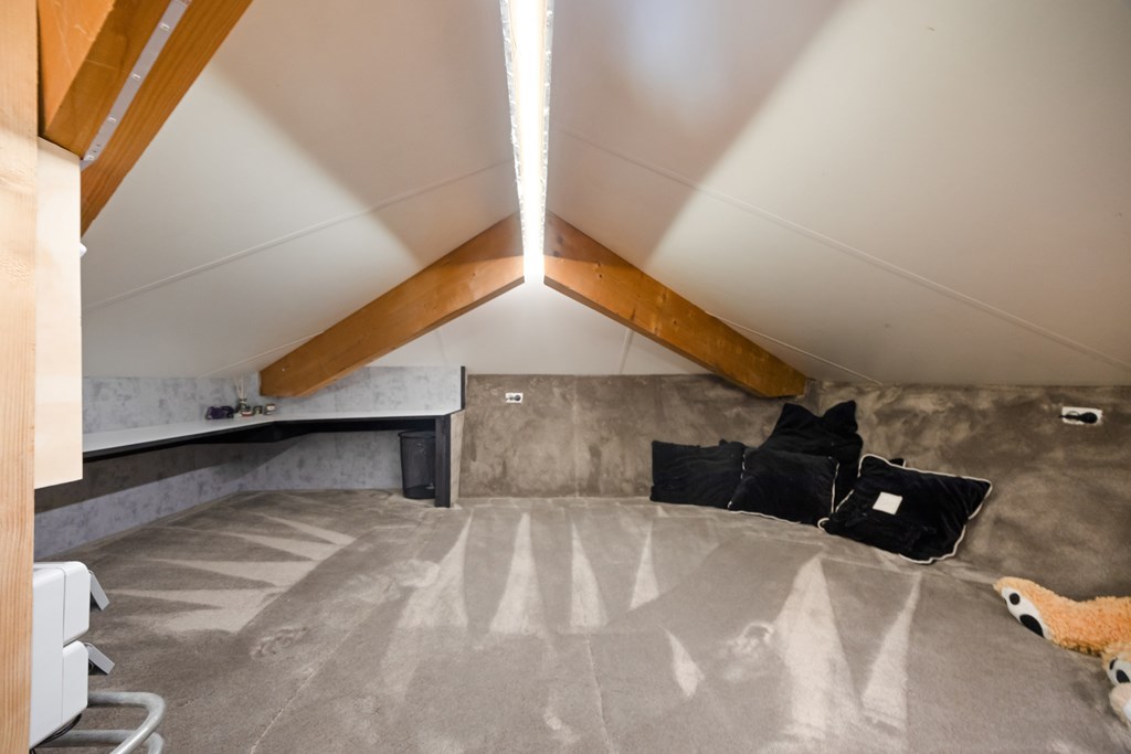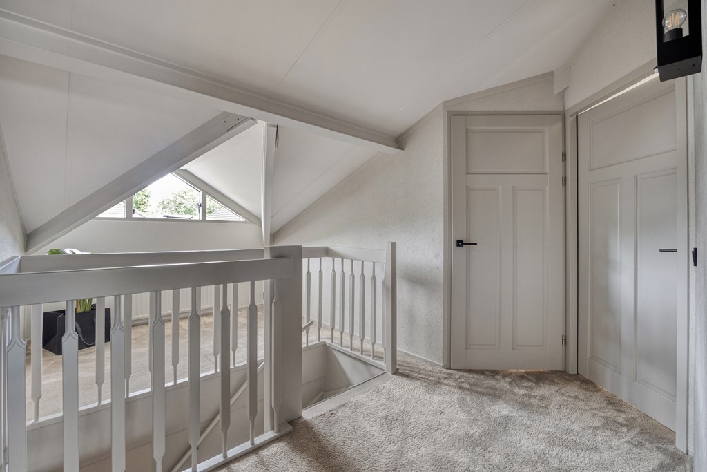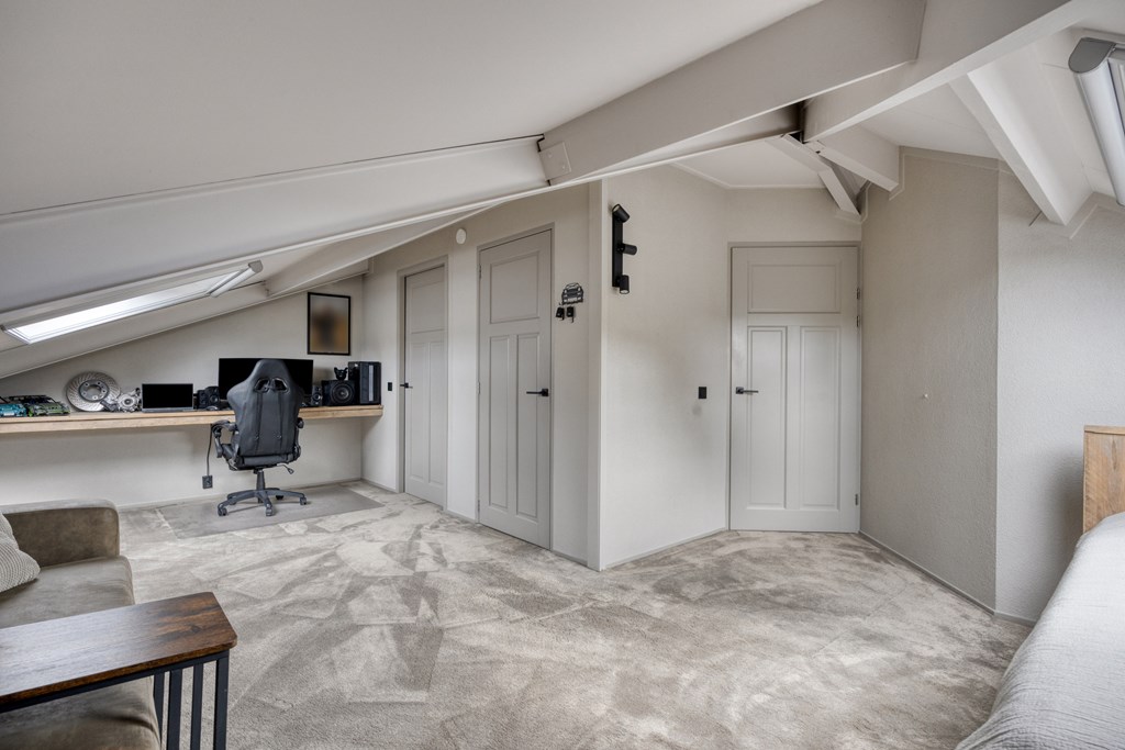 De slaapkamers bevinden zich rondom de overloop en zijn allen ruim van opzet. Dankzij grote ramen, voorzien van verduisteringsgordijnen, rolhorren en geïntegreerde buitenzonwering, is er optimale lichtinval en uitzicht, terwijl de houten draagbalken zorgen voor een warme en karaktervolle uitstraling. De kamers bieden flexibele indelingsmogelijkheden en zijn tevens geschikt als hobby- of werkkamer.