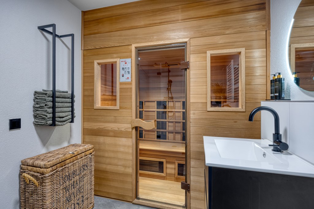 Een derde badkamer bevindt zich eveneens in het souterrain. Deze is uitgerust met een douchecabine, zwevend toilet, handdoekradiator, handdoekrek, wastafel met spiegel en een opbergmeubel. Als unieke toevoeging beschikt deze badkamer over een fantastische infrarood sauna, waar u heerlijk kunt ontspannen.