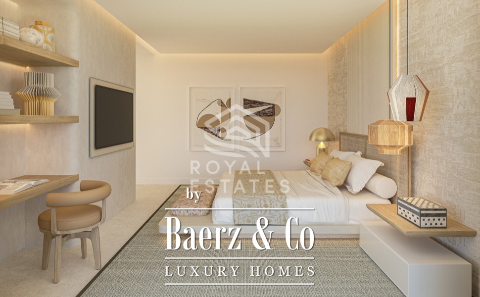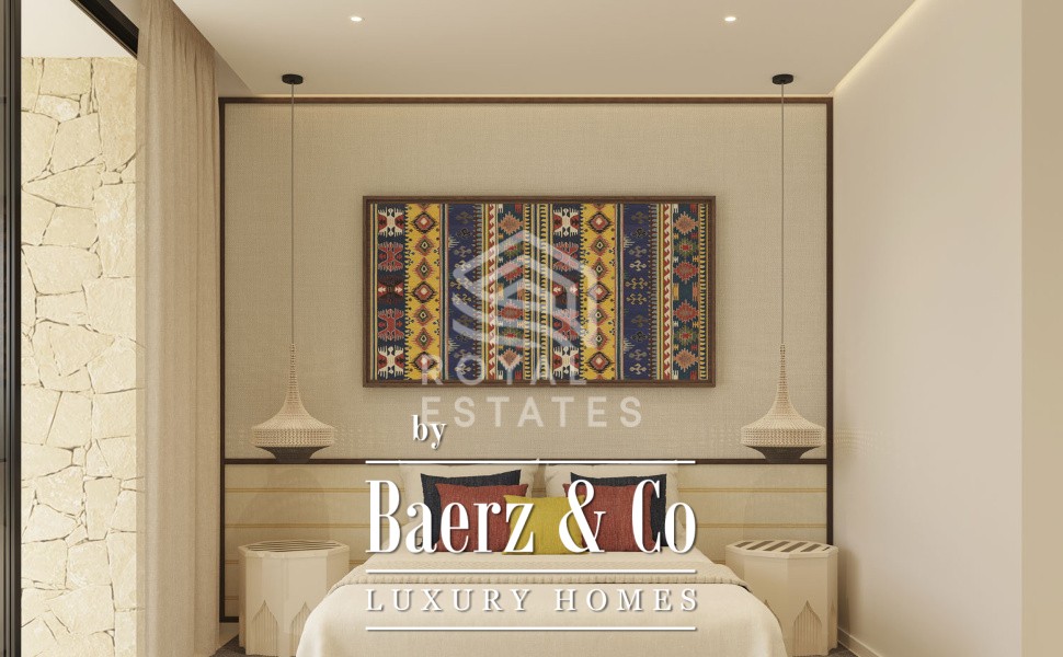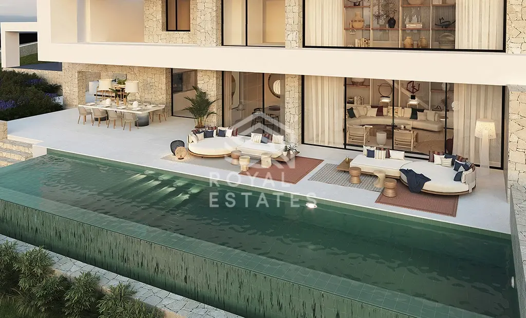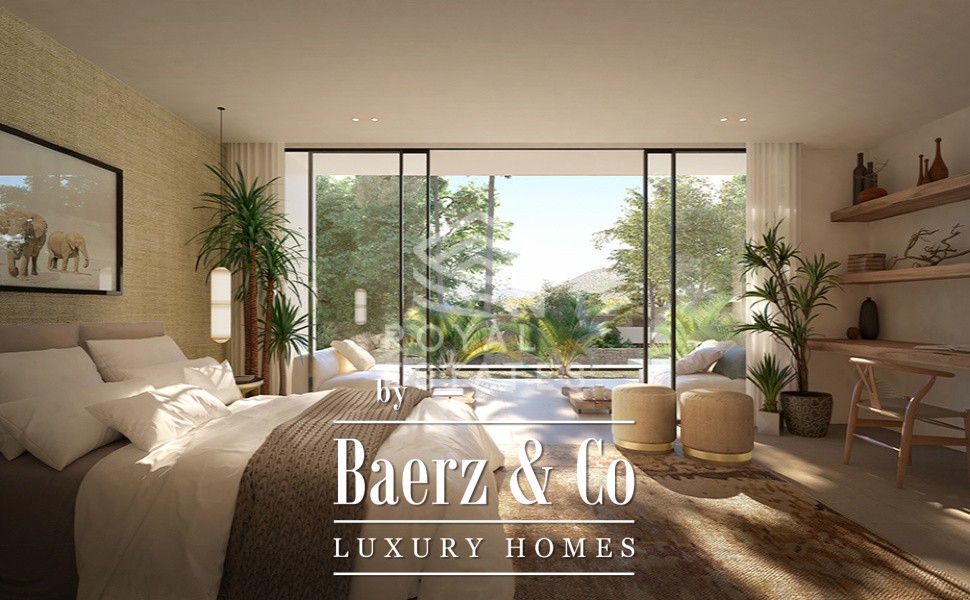 Tree-lined infinity pools, local stone, and a seamless transition between interior and exterior spaces define the spatial experience. Natural light diffuses gently across the villa, reflecting Ibiza’s unique style through native textures and forms, creating a tranquil dialogue with the landscape. The setting brings the island’s summer rhythm into daily life, retreating into an enclave that is both connected to and discreetly apart from the vibrancy of the White Island.