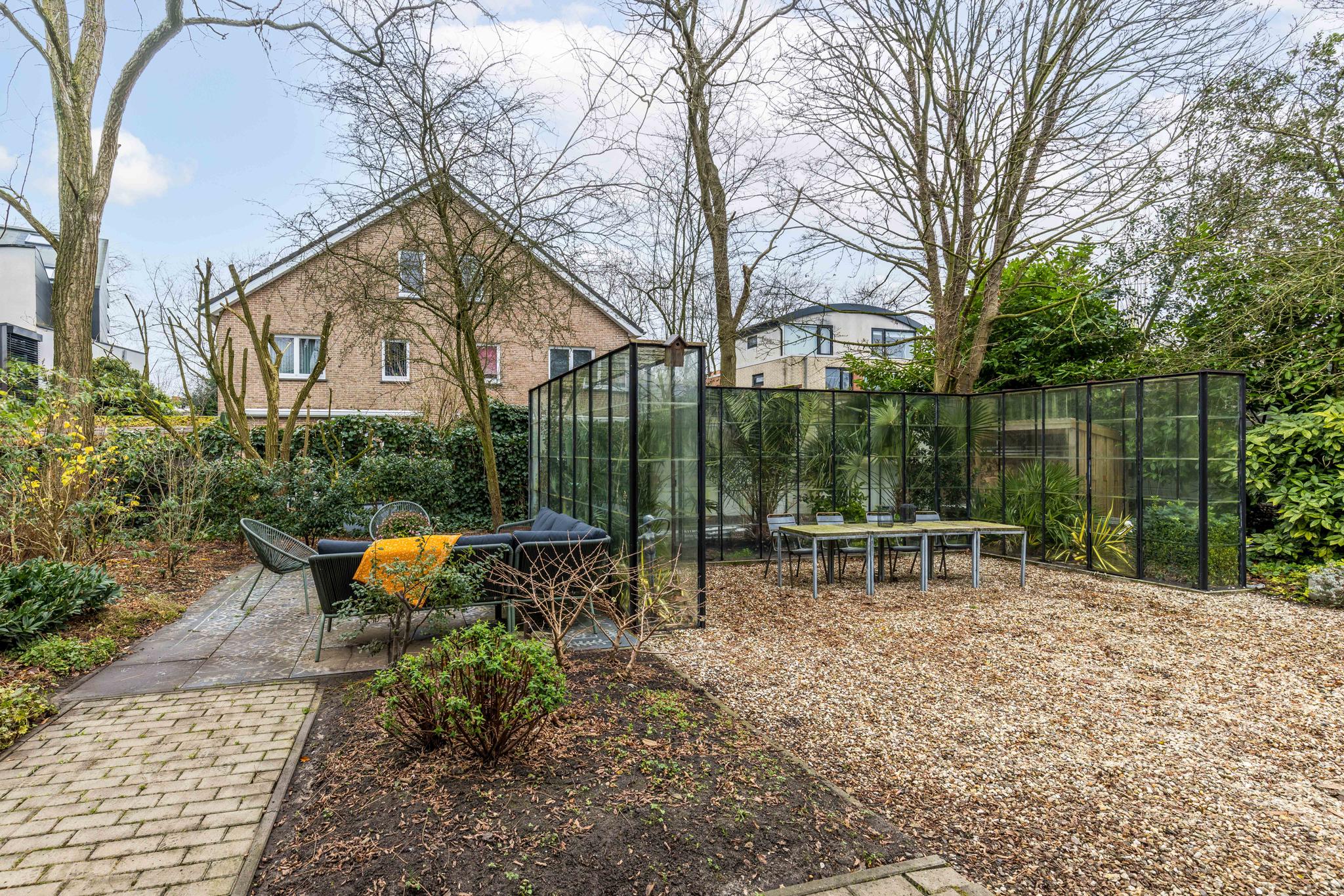 The front garden is beautifully landscaped with hedges, gravel paths and various plants. A side garden with driveway offers on-site parking, a carport with a charging station and a large storage room. The other side garden and the backyard together form a beautiful main garden area. At the back of the garden is a food forest with fruit trees, herbs and soft fruit. This garden has been landscaped under architecture and offers a lot of privacy and various sunny seating areas.