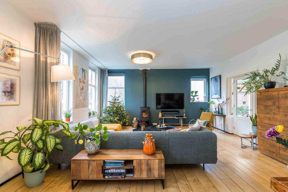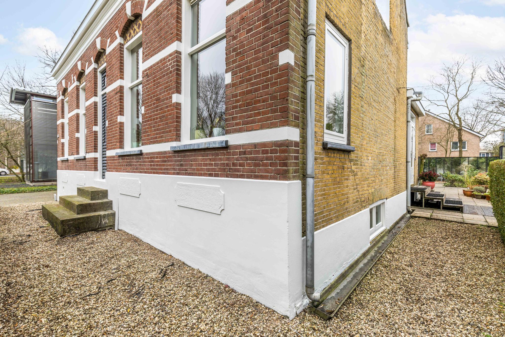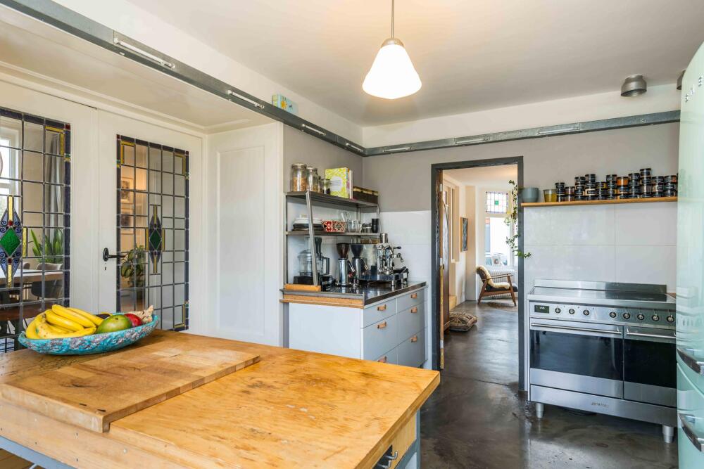 Entrance on the side of the house, spacious hall with toilet, wardrobe and staircase, attractive intermediate room with stained glass windows, cupboard space and a door to the kitchen, spacious wide living room with windows on three sides that provide lots of light, a beautiful wooden floor, high ceilings and a beautiful view, under the sitting room is also a (wine) cellar with daylight. The stained glass separation also leads to the kitchen, equipped with a kitchen unit and patio doors to the side garden and a door to the basement. From this kitchen there is access to the utility room with laundry room and heat pump installation. This utility room in turn provides access to the beautiful very spacious and garden-oriented kitchen in the back house with stairs to the first floor, a private toilet, a loft, high ceiling, large windows and patio doors to the garden.