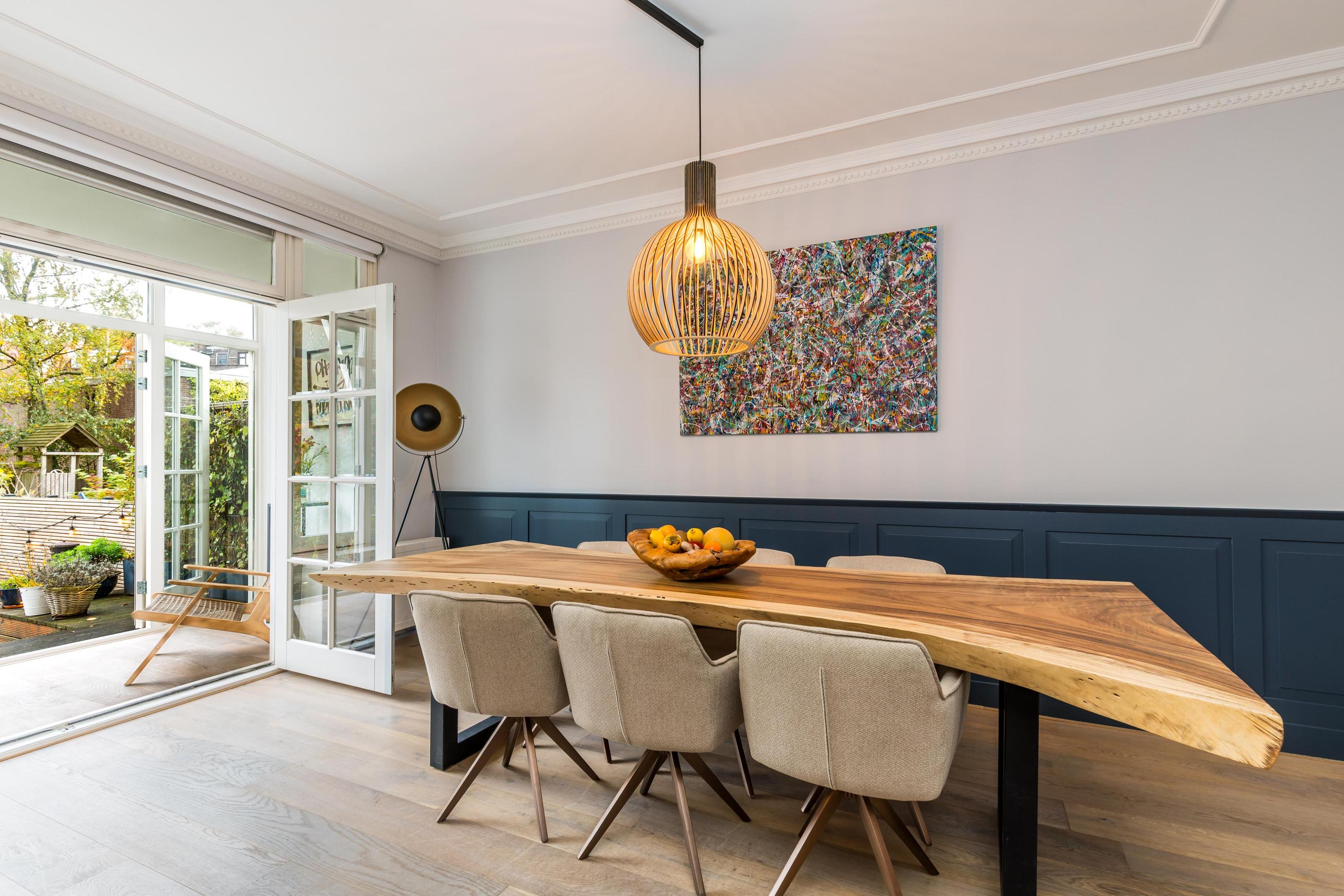Representative entrance with high ceilings and original details. From the hallway, access to the modern guest toilet and the spacious living area with a beautiful oak floor. The open kitchen (renovated in 2022) forms the heart of the home and is equipped with a large cooking island, high-end built-in appliances including a steam oven and a (wine) climate cabinet. Adjacent is the bright conservatory with French doors opening onto the sunny rear garden, where indoor and outdoor living blend seamlessly.