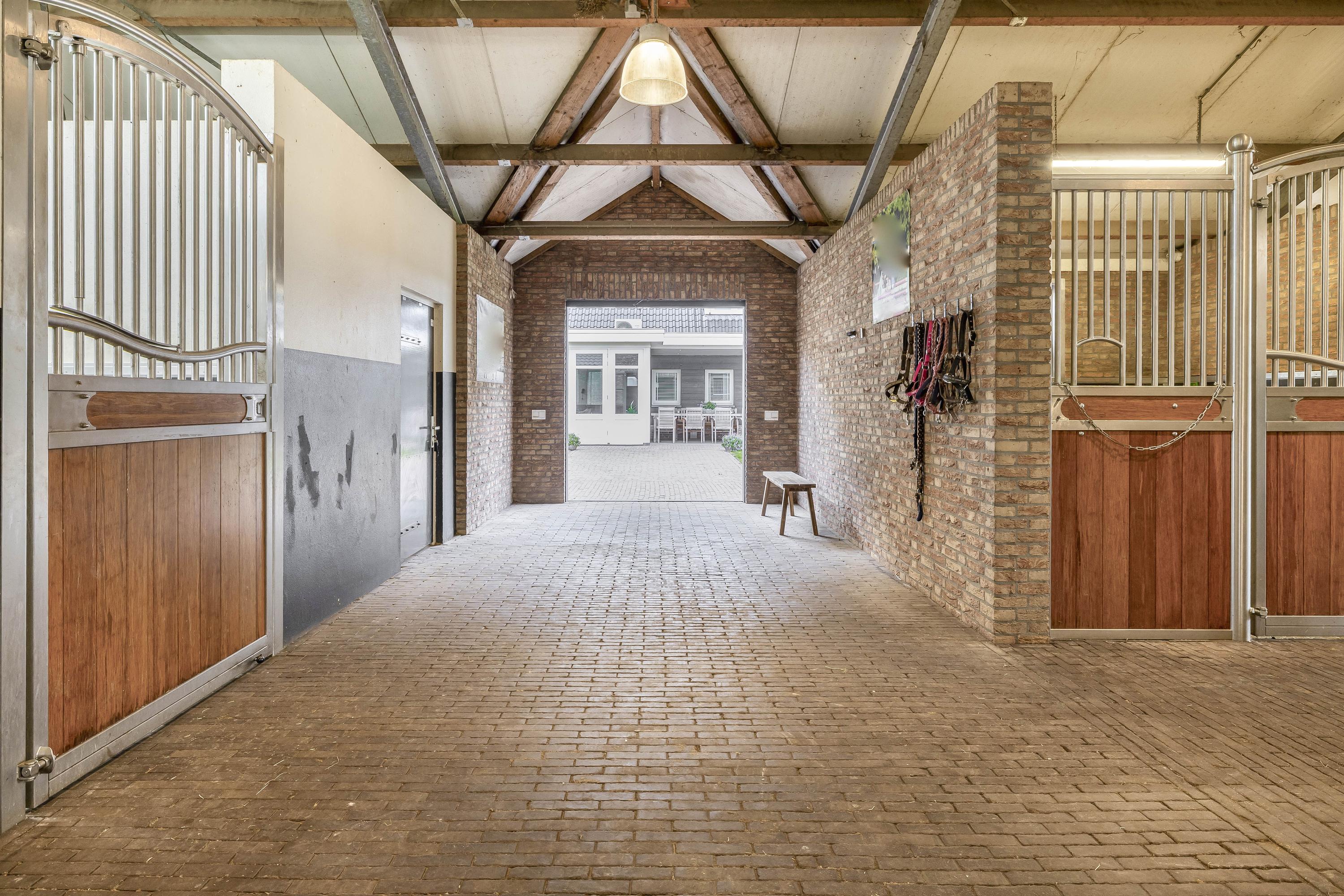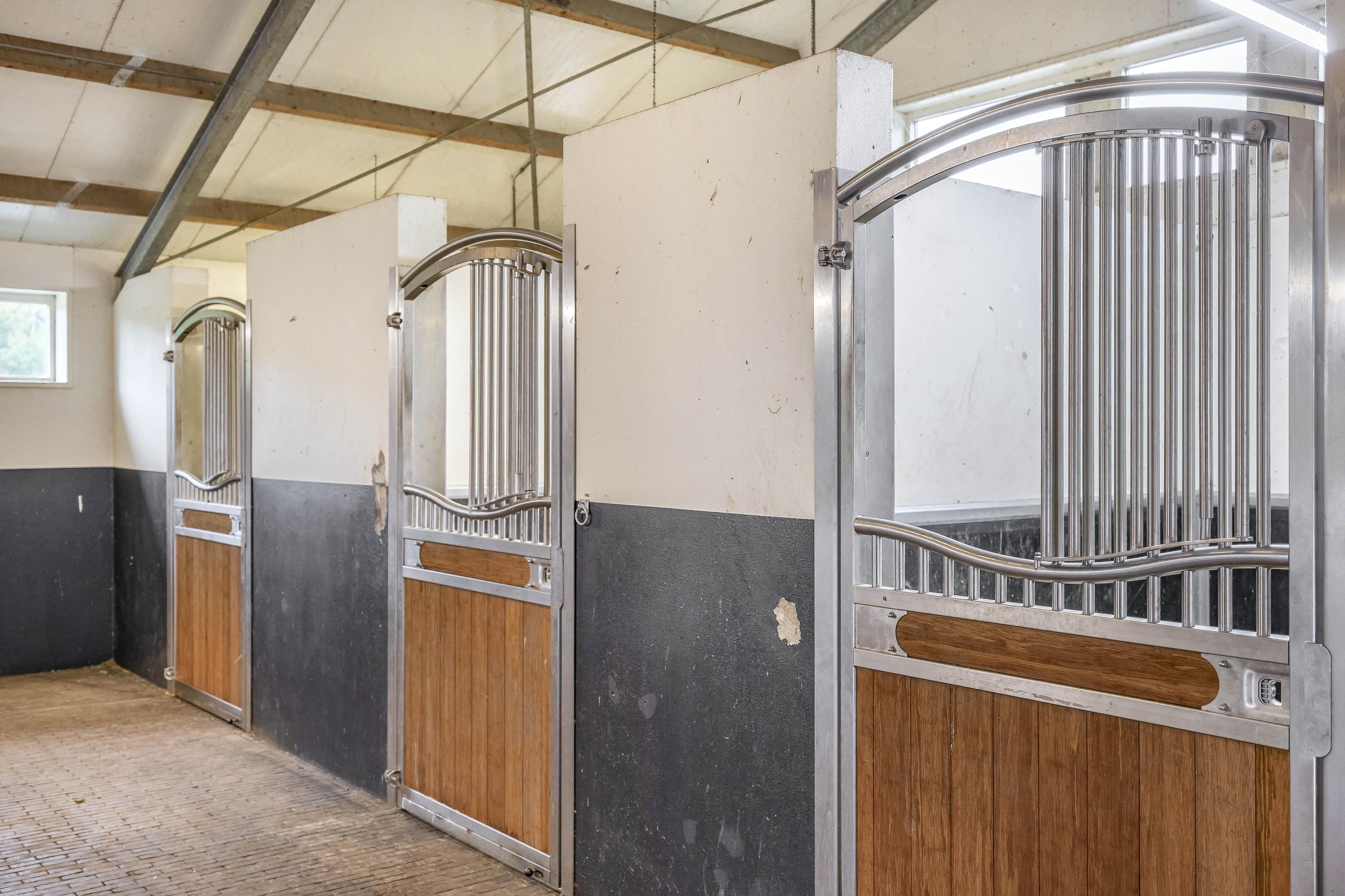 Discover this beautiful, detached horse stable; a true paradise for equestrian enthusiasts. The stable is built in a traditional style with brick facades, some of which are clapboard, and is finished with a roof featuring sandwich panels in an authentic roof tile pattern. The whole is enclosed by French doors. The aisle is equipped with baked clinkers. The six horse stalls, each with a rubber floor and partly occupied and partly rubber walls. The special stainless steel revolving doors with bamboo finish and the separate outside hatch per stall contribute to the modern look and functionality. The tack room is finished with stucco walls, a wooden beam ceiling, and a concrete floor. This room is equipped with connections for washing equipment, an irrigation pump, a fuse box, and the power supply for the pasture. For extra comfort, the stable has a toilet room, which is equipped with a wall-mounted toilet, a urinal, and a sink.