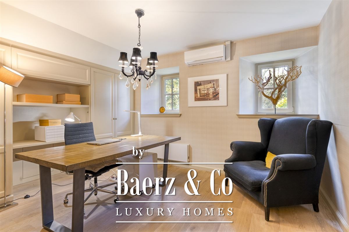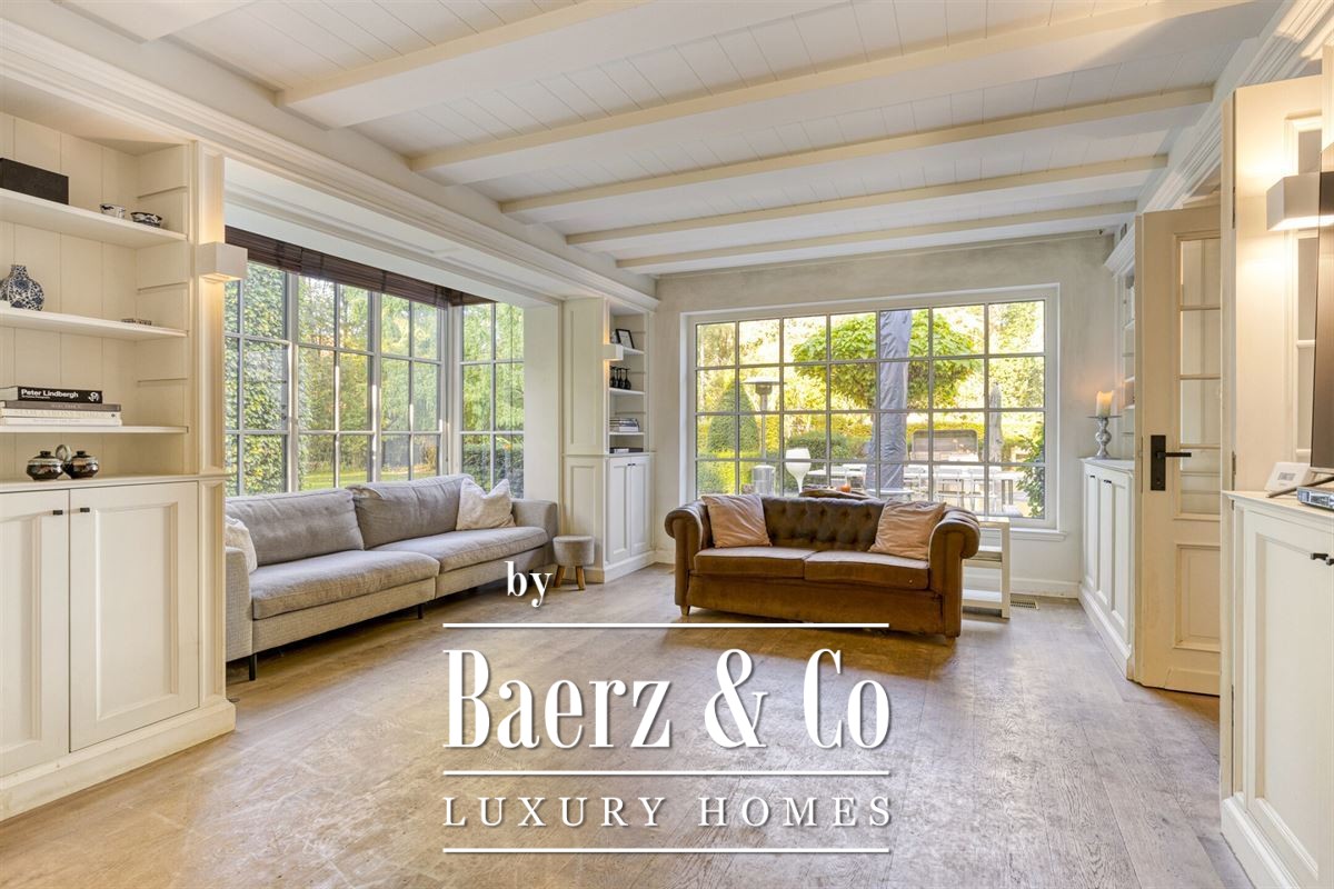 De leefruimte op eiken parket baadt in het licht dankzij grote raampartijen met zicht op de tuin. De open haard en airco zorgen voor ultiem comfort.