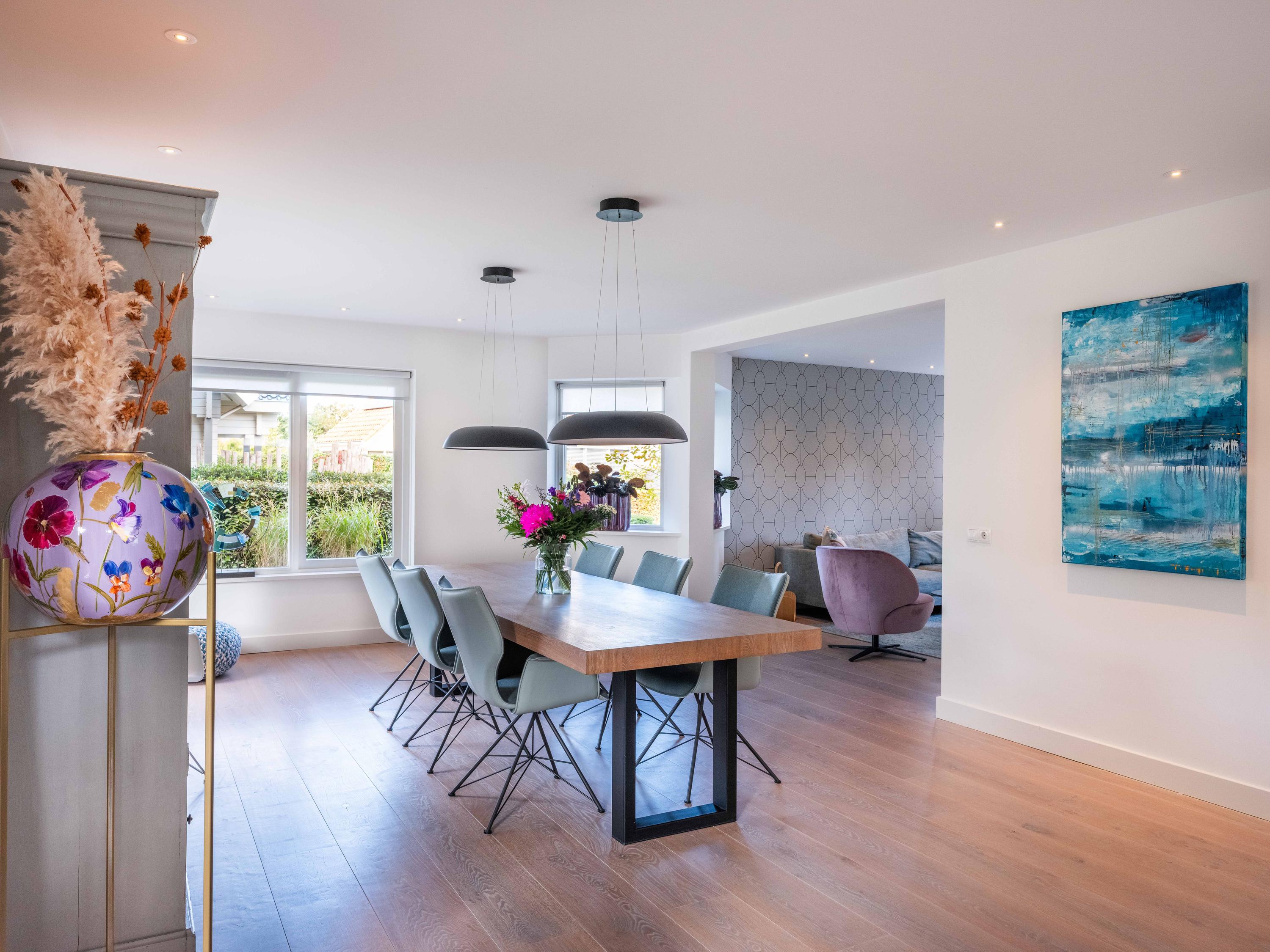 Double doors give access to the spacious L-shaped living room, where you are immediately welcomed by lots of light thanks to the large windows. In the corner is a cosy sitting area with an attractive gas fireplace. The oak laminate flooring in combination with underfloor heating throughout the ground floor creates a warm and comfortable atmosphere.