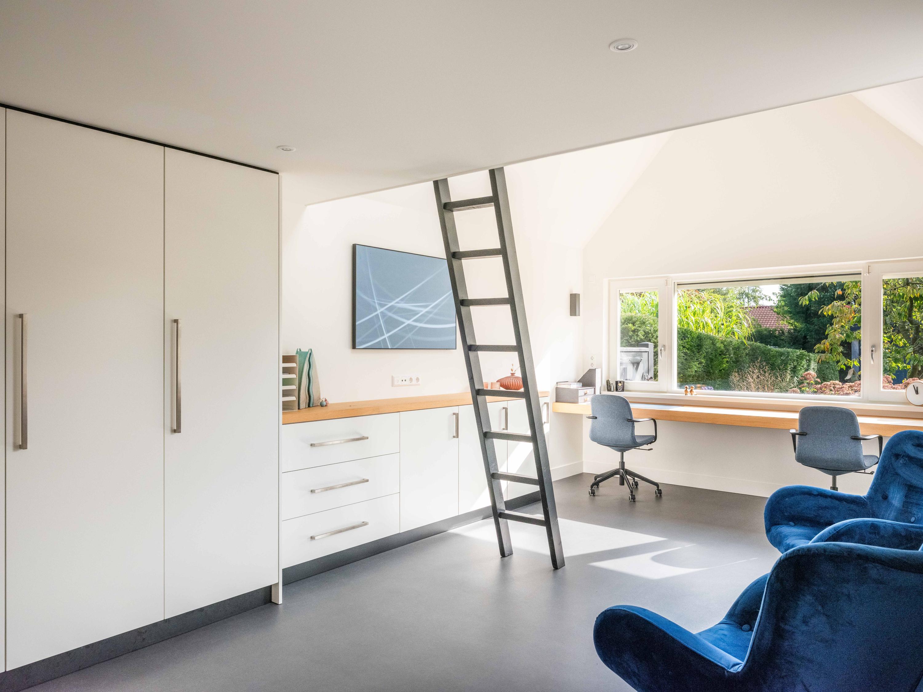 From the utility room, there is access to an additional room with air conditioning, built-in cupboards and a loft. This room is currently used as an office but could also serve as a bedroom or hobby room. The loft offers additional storage space.