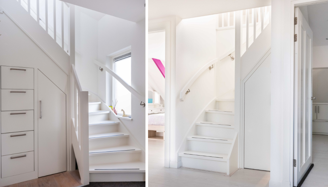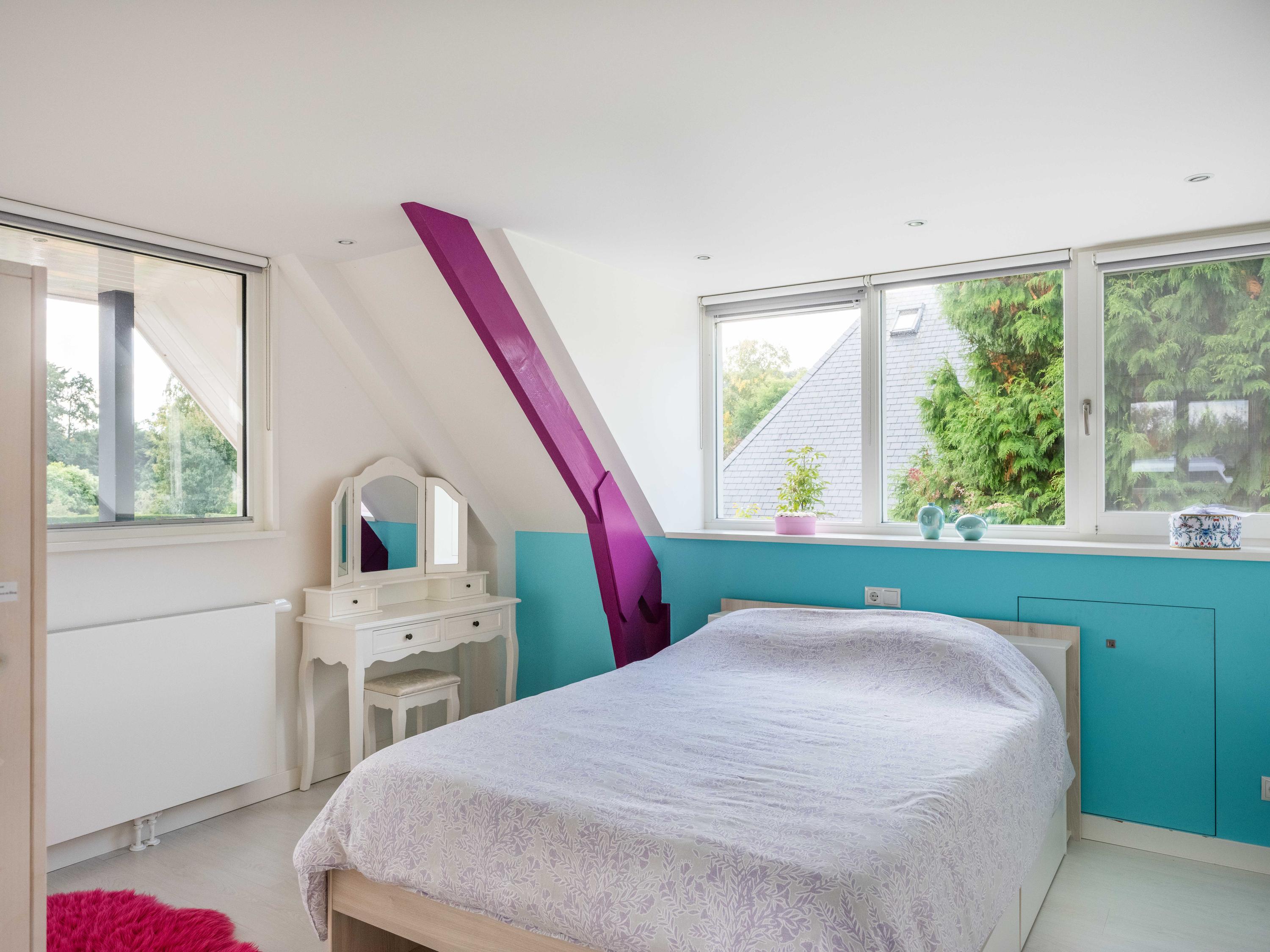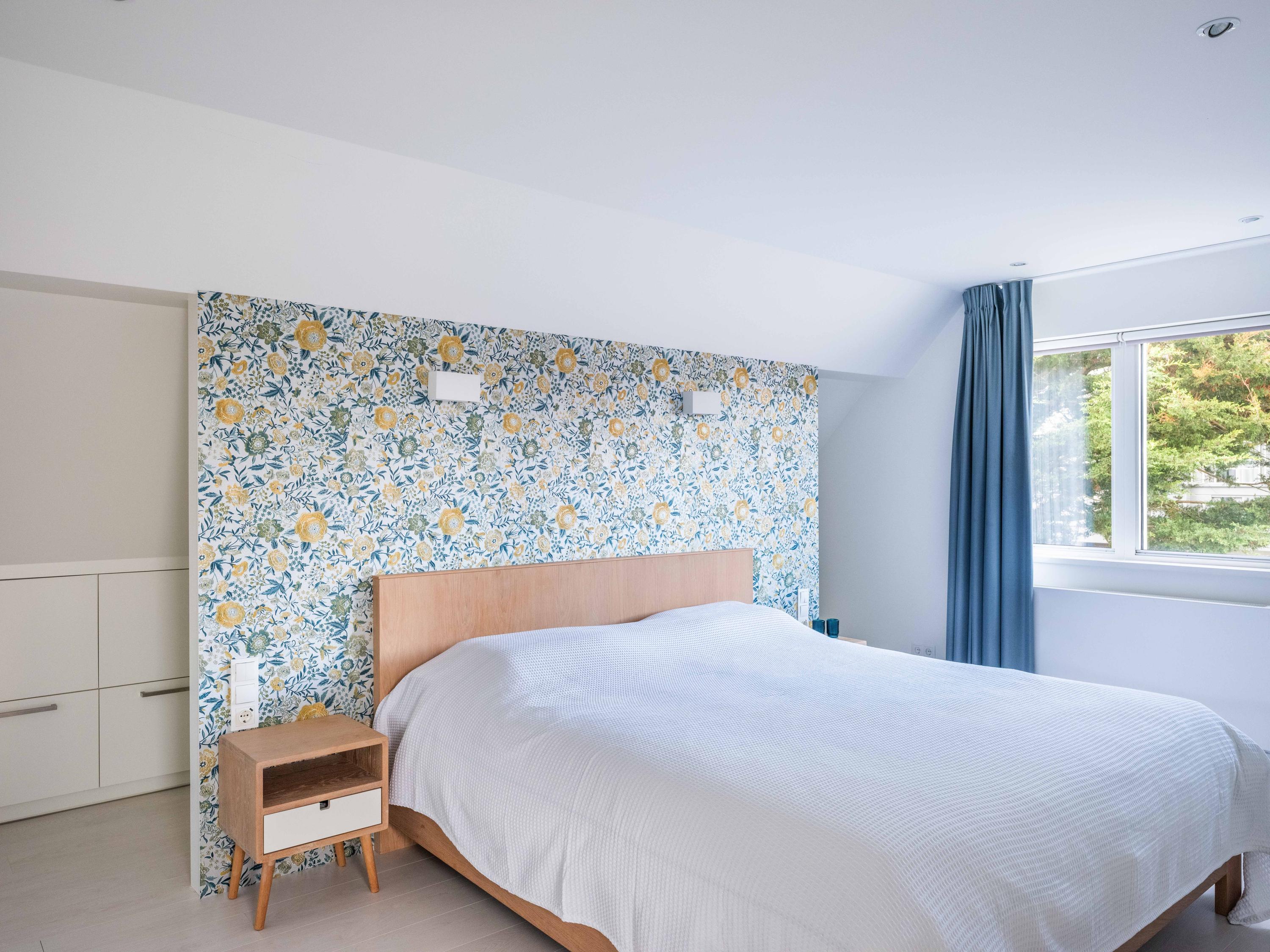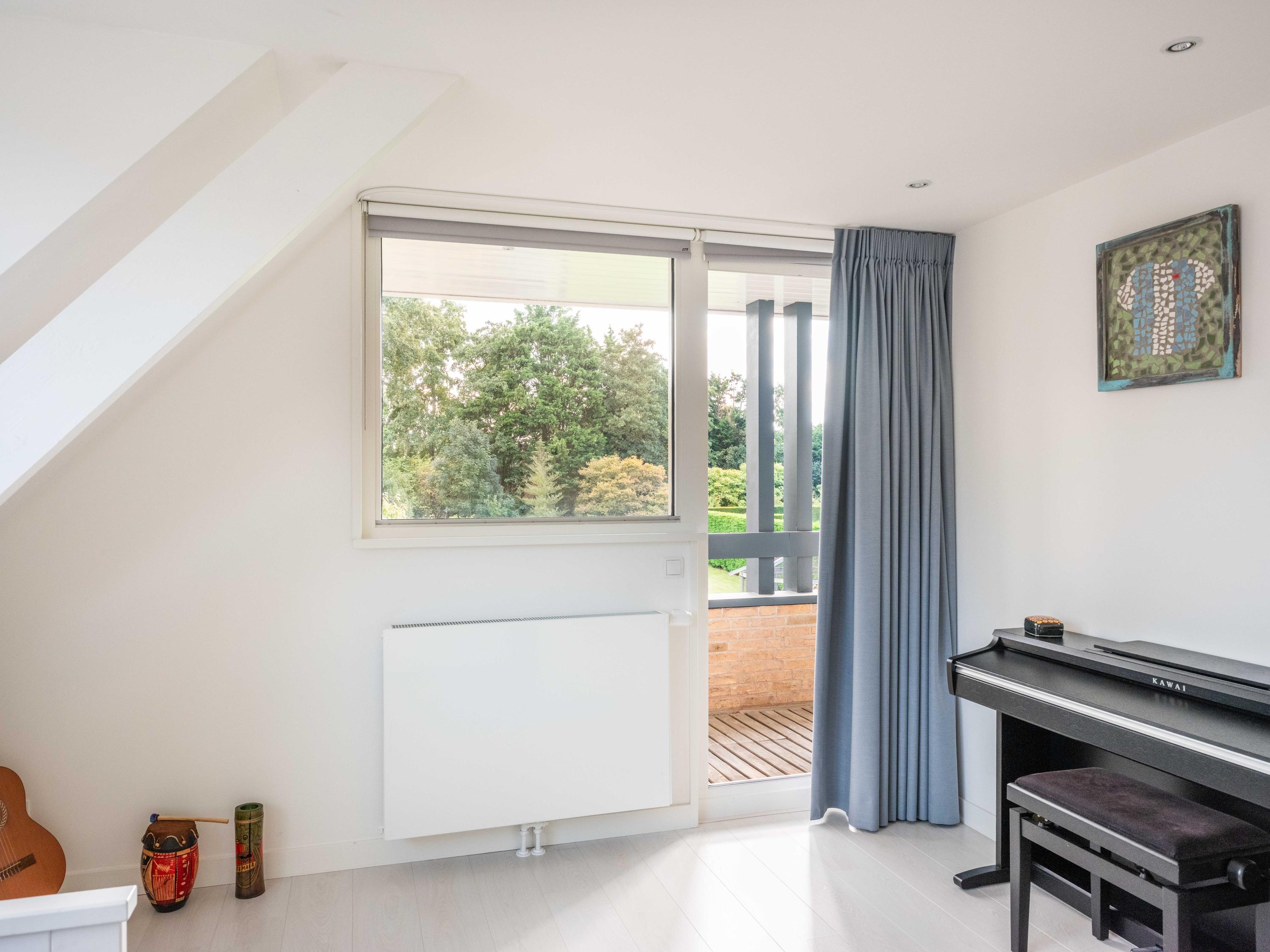 On the first floor, there are three bedrooms and a spacious bathroom with double sink, toilet, bathtub and a generous double walk-in shower. Underfloor heating is also present here, as well as a radiator. The master bedroom is spacious and has plenty of built-in cupboard space. There are two additional bright bedrooms, both with built-in cupboards and access to a private balcony. There is a handy storage cupboard under the stairs to the attic.