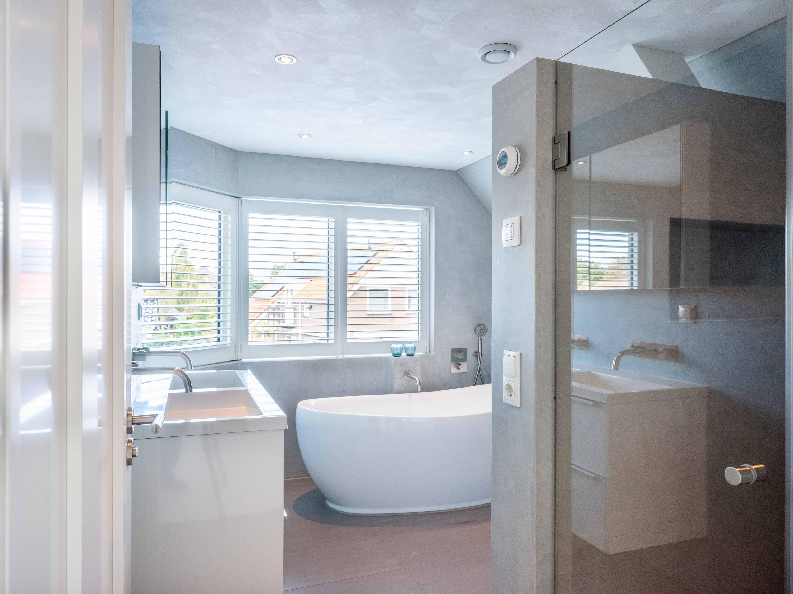 The open kitchen is attractively decorated and equipped with a cosy bar with seating. From the kitchen, you can enjoy a beautiful view of the garden and there is a direct connection to the living room. Thanks to the open layout and abundant light, everything feels spacious, fresh and inviting.