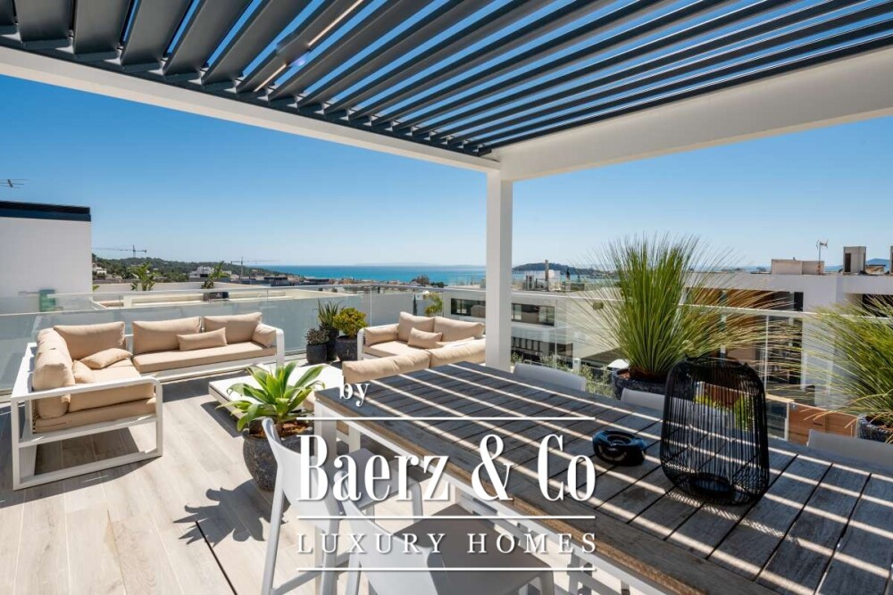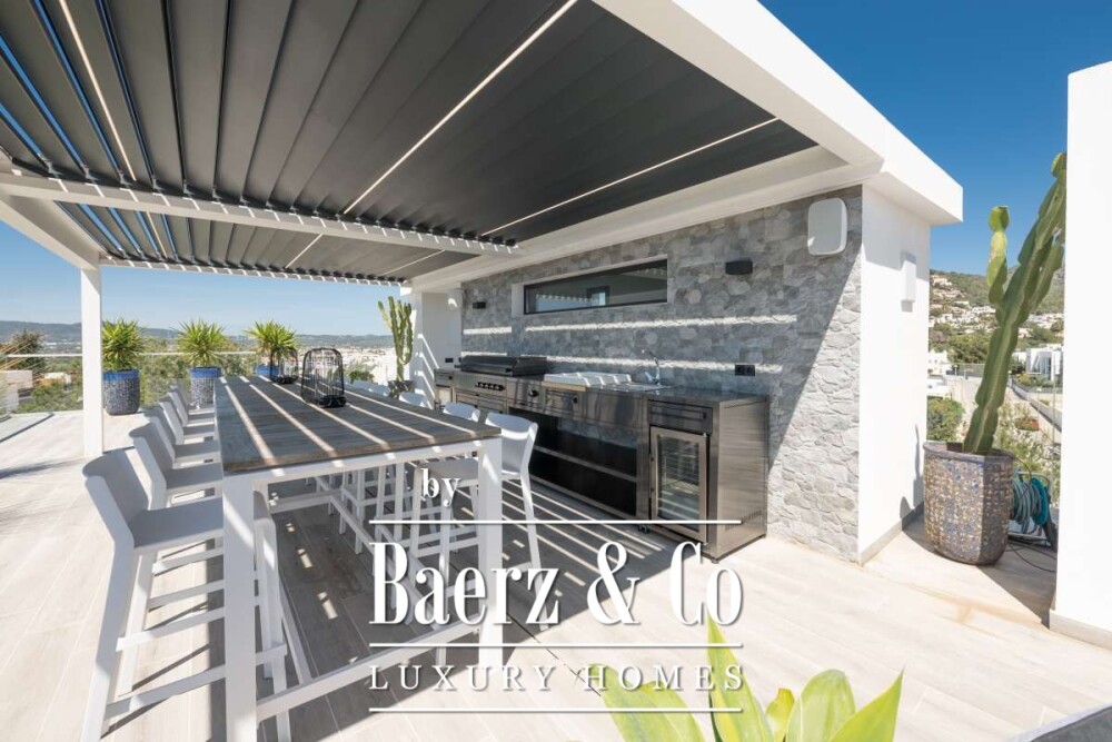 Wellness is centered in the lower level’s gym, equipped with high-quality machines, and a club lounge that invites quiet evenings at a marble bar. A Sonos system orchestrates four individualized music zones, connecting the club, pool, living area, and roof terrace, where serene views toward Dalt Vila and partial sea vistas unfold. Glass sliding doors lead to an elongated swimming pool edged by a distinctive glass wall, sunbeds, tranquil lounge sets, and a jacuzzi amplify outdoor living. On the roof terrace, an equipped kitchen under a shady canopy and a large dining area underscore the villa’s social dimension.