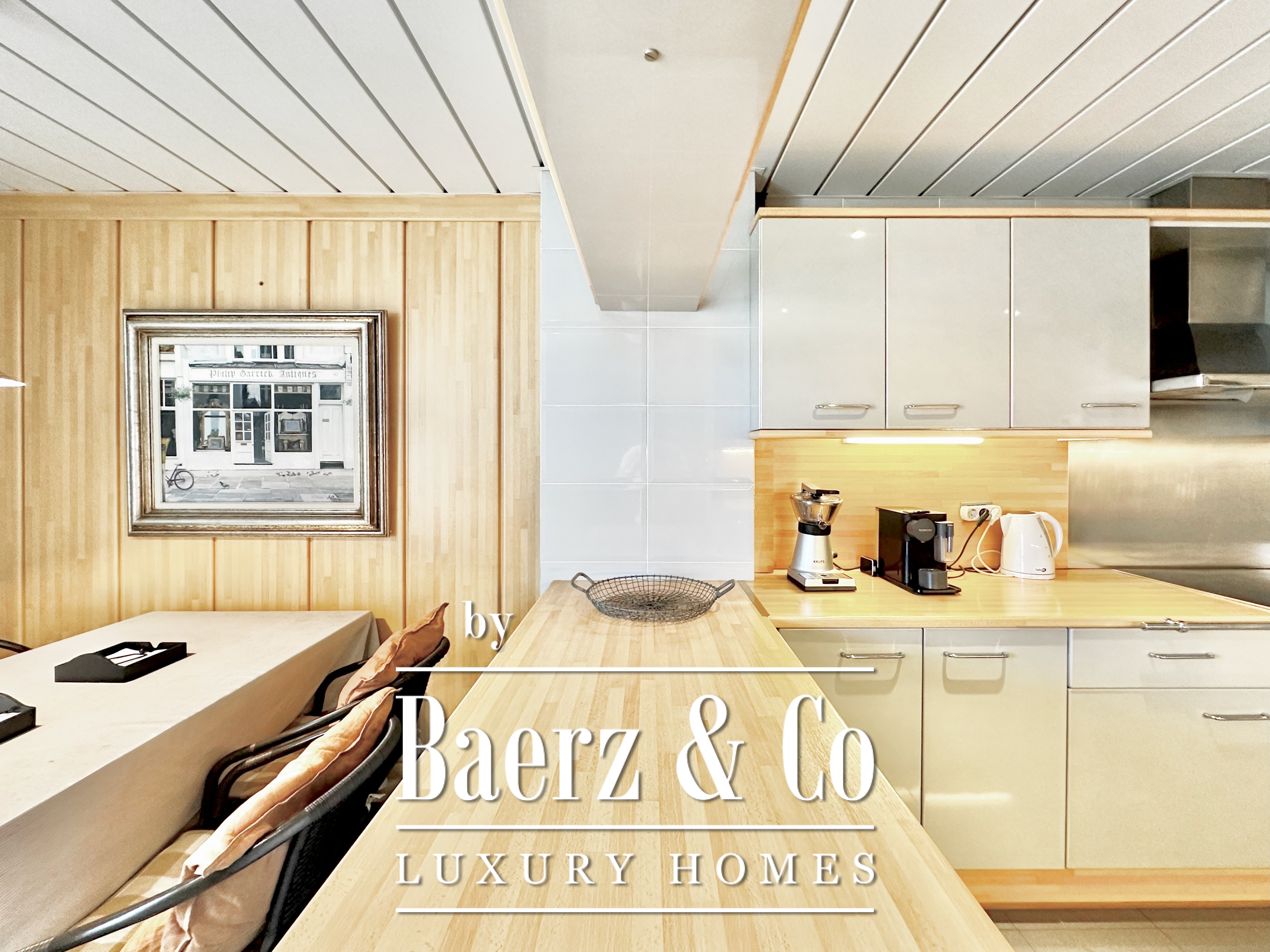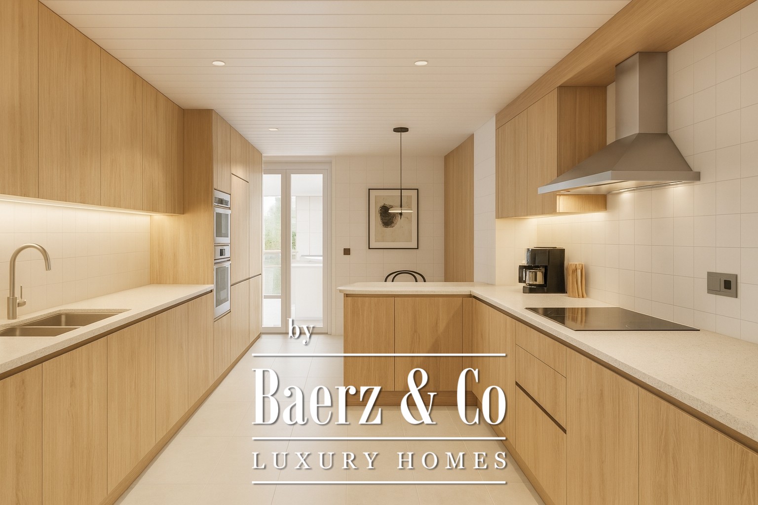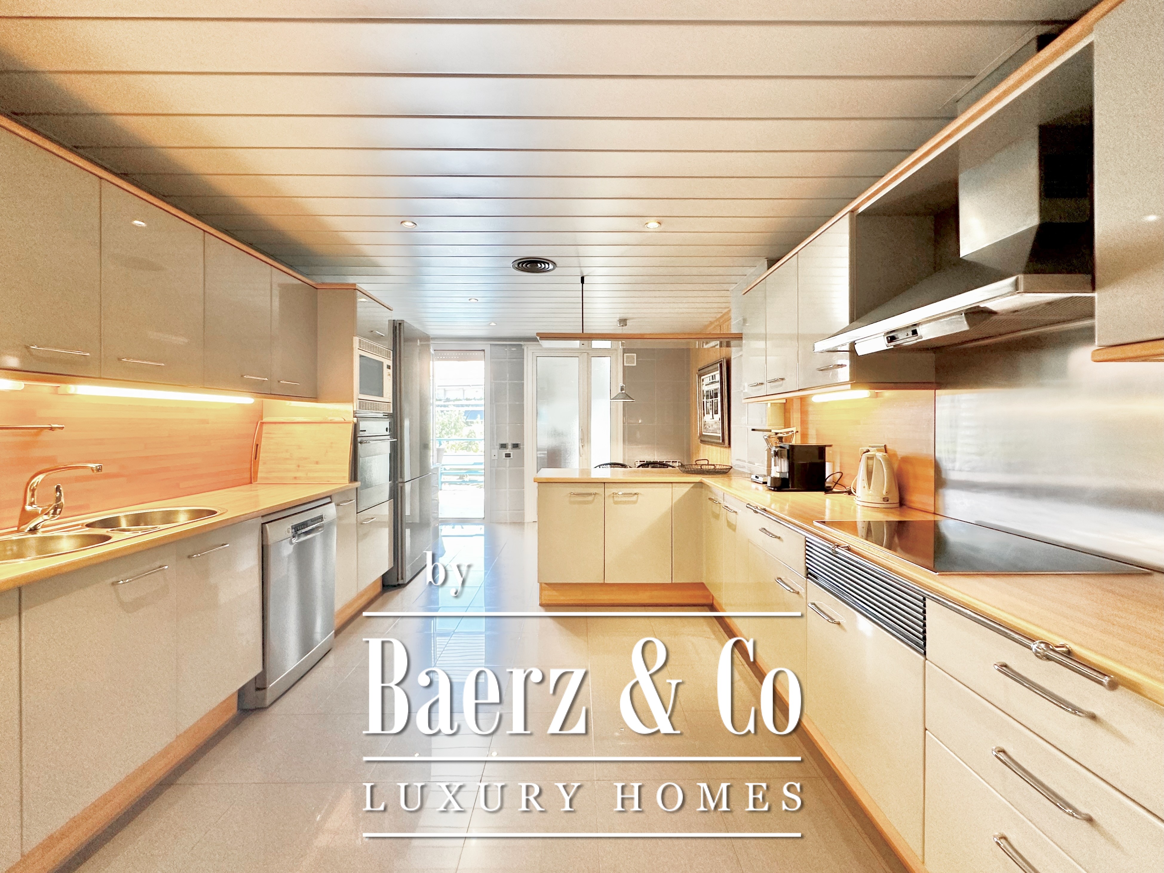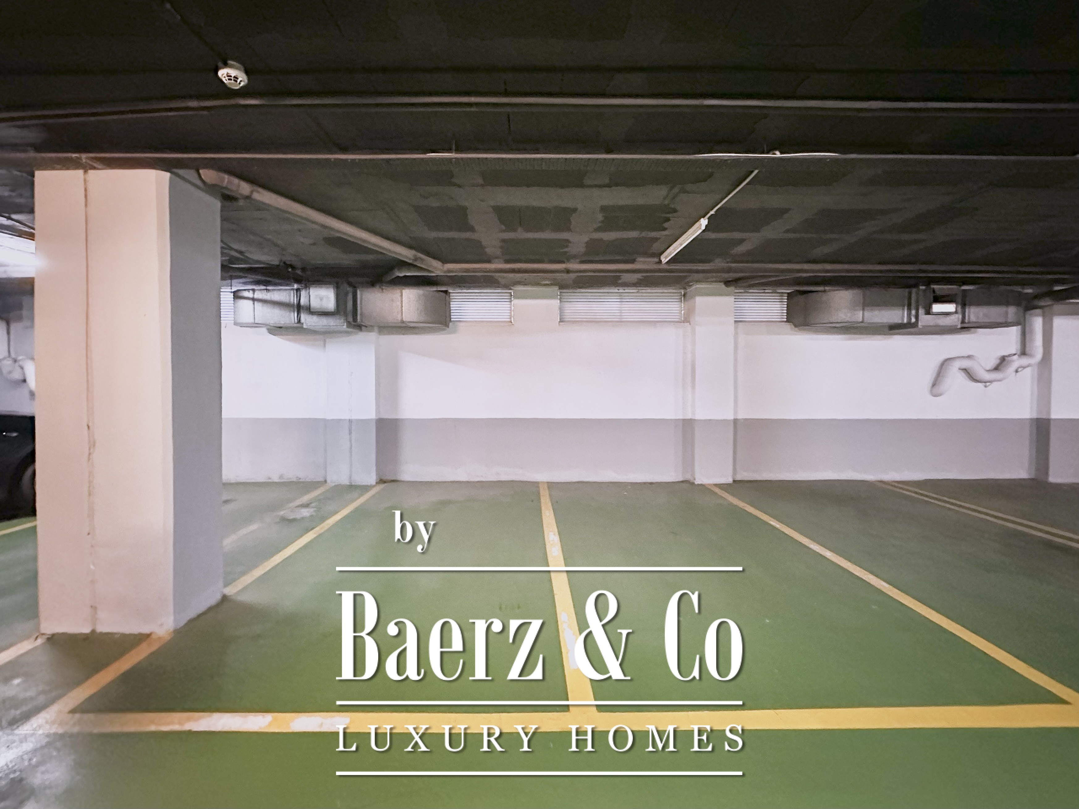A functional kitchen-diner benefits from airy views across the landscaped communal spaces. Modern comforts include air conditioning, gas heating, two generous parking spaces, a 14 m² storage room, elevator access, and 24-hour security. The property is offered unfurnished, allowing for a bespoke interior vision.