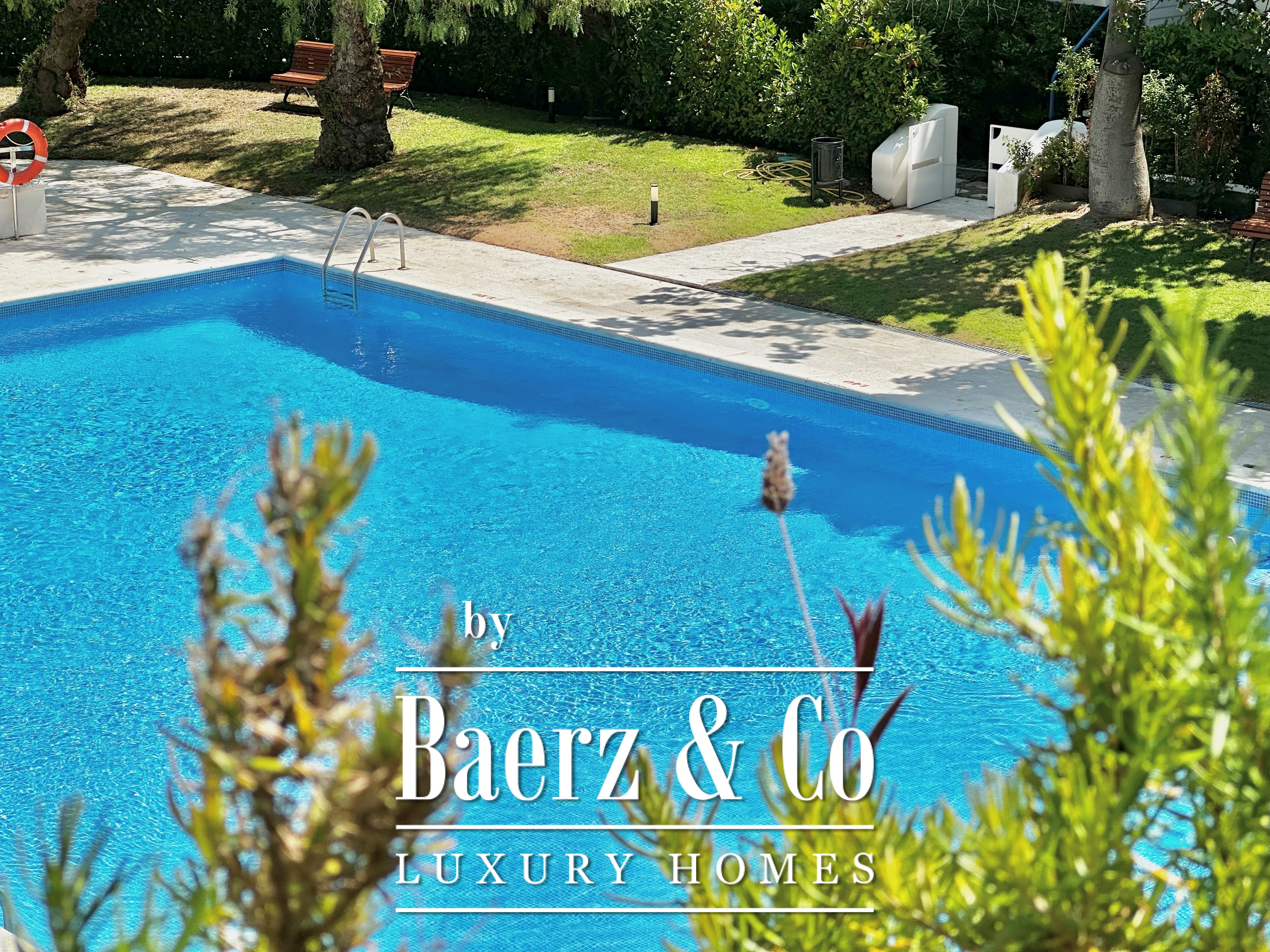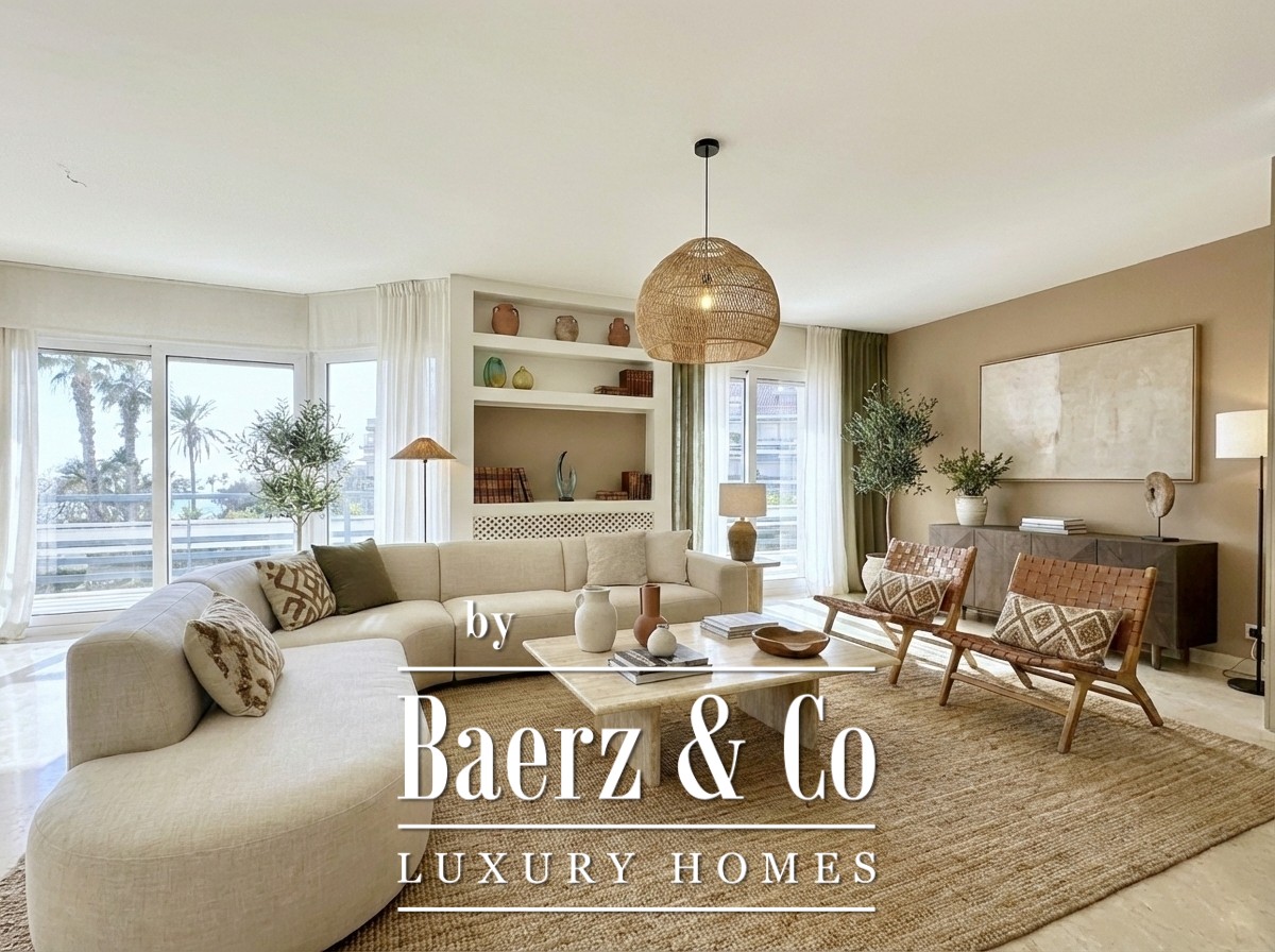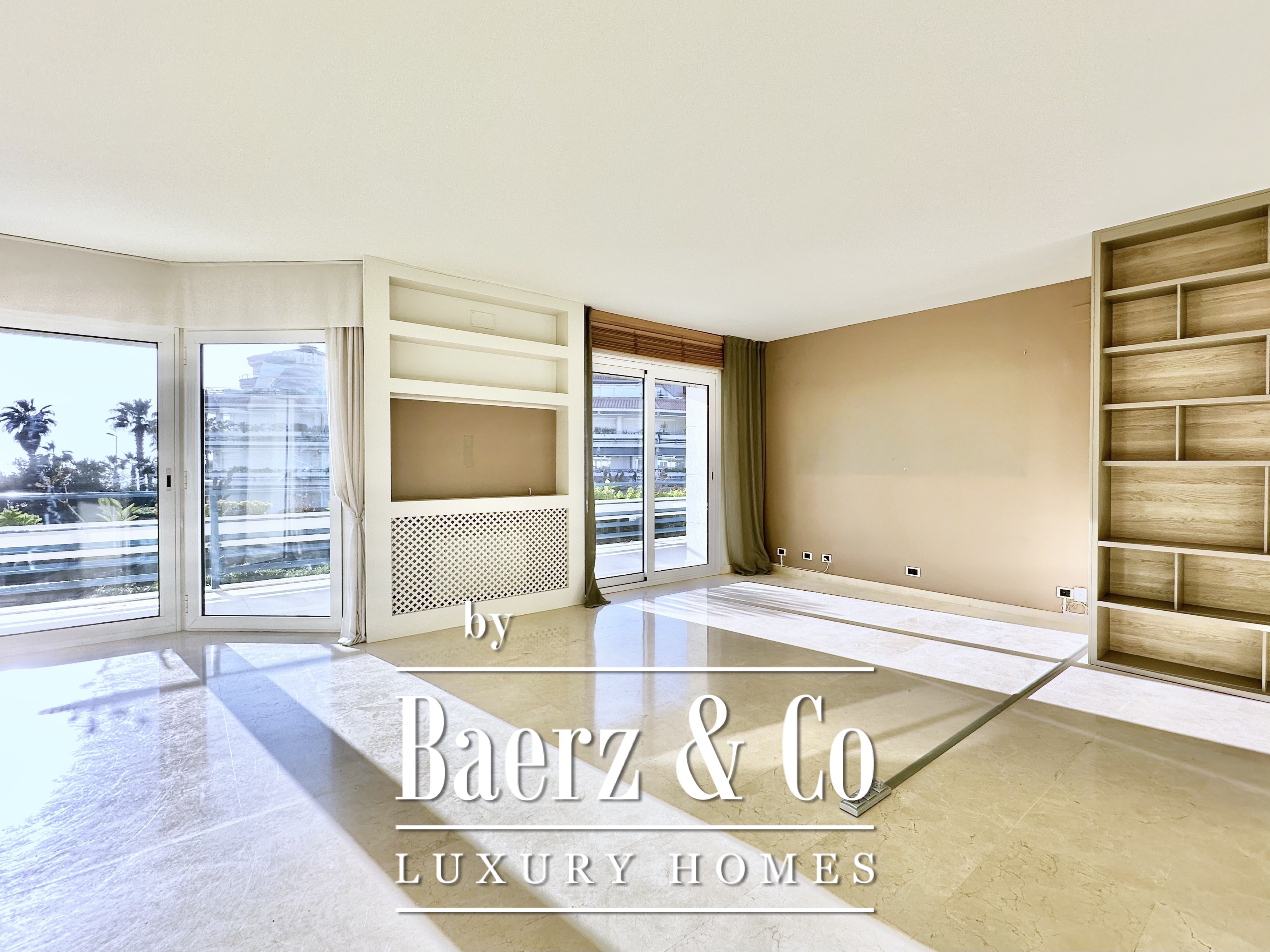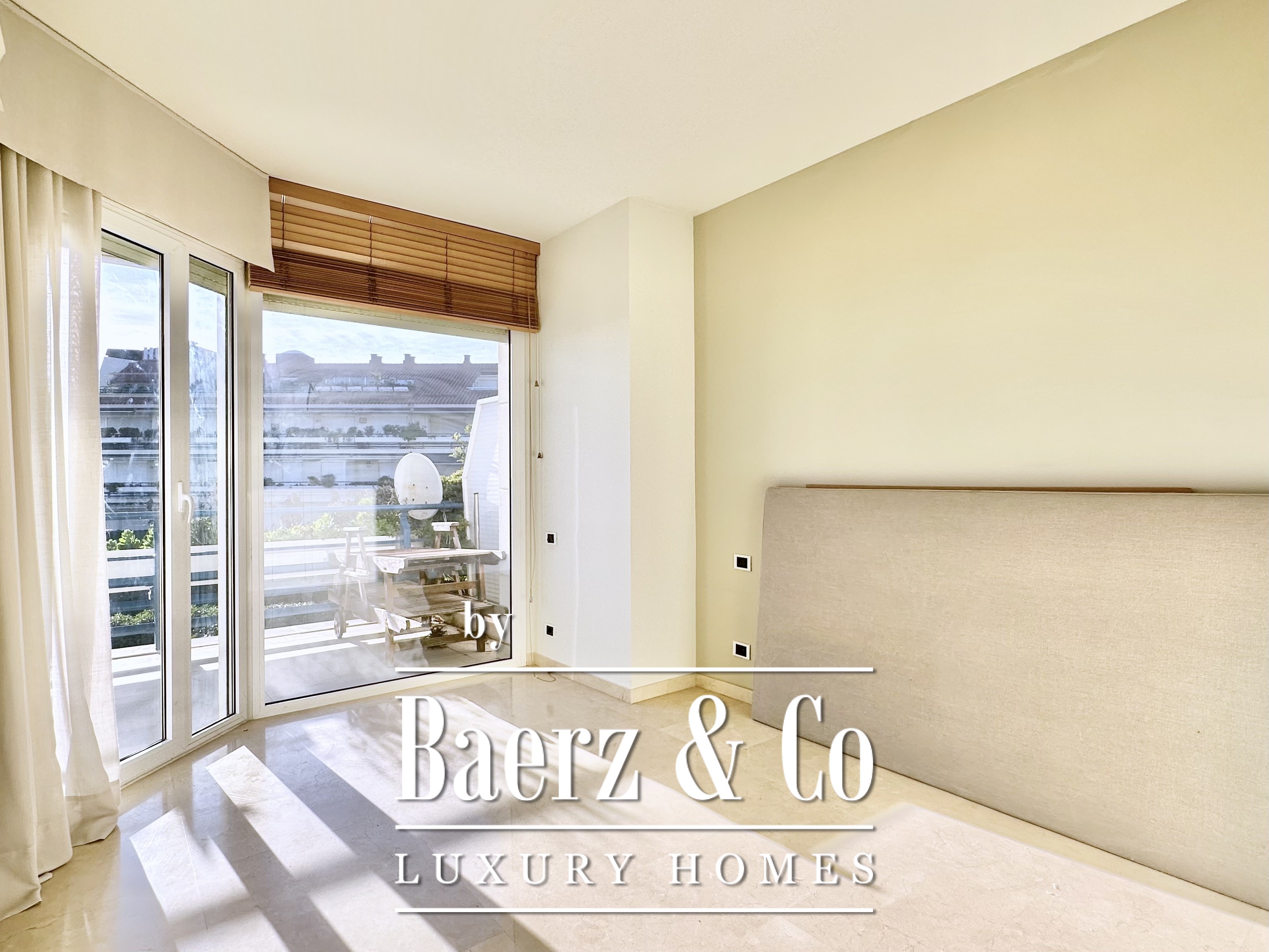 Designed and updated to rigorous standards, this residence once served as the show apartment for the development. Each of its four bedrooms provides en-suite privacy, with the master suite directly oriented towards the sea. Elegant marble finishes enhance understated interiors, while built-in wardrobes add discreet utility. Two terraces, one capturing the movement of the Mediterranean and another overlooking serene gardens and the swimming pool, invite a life attuned to both sea and greenery.
