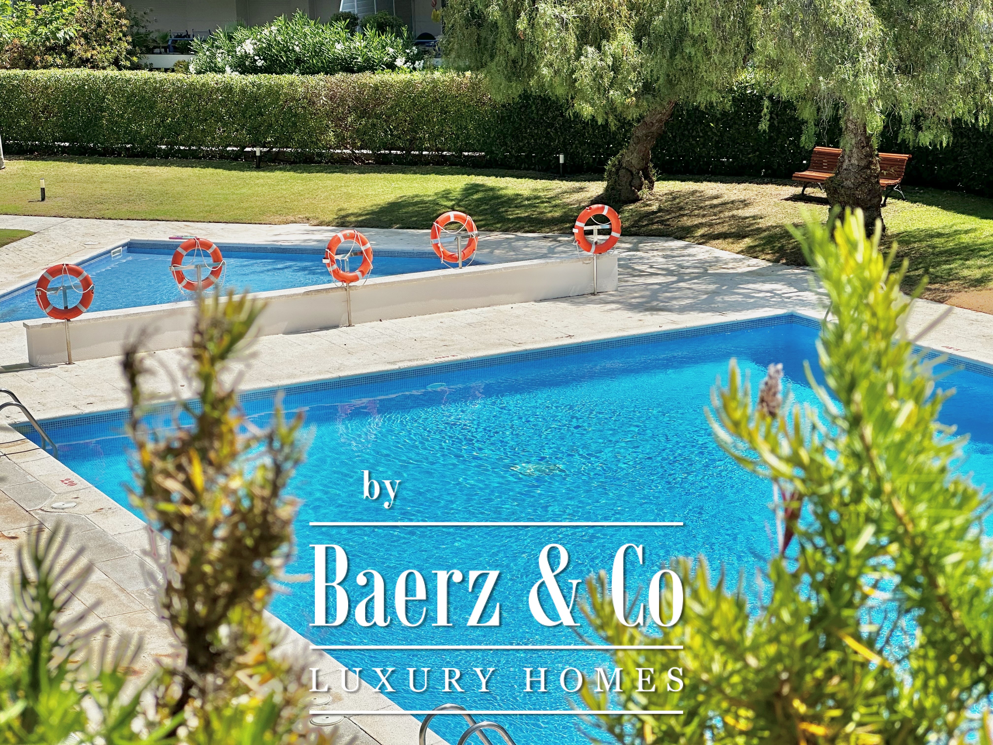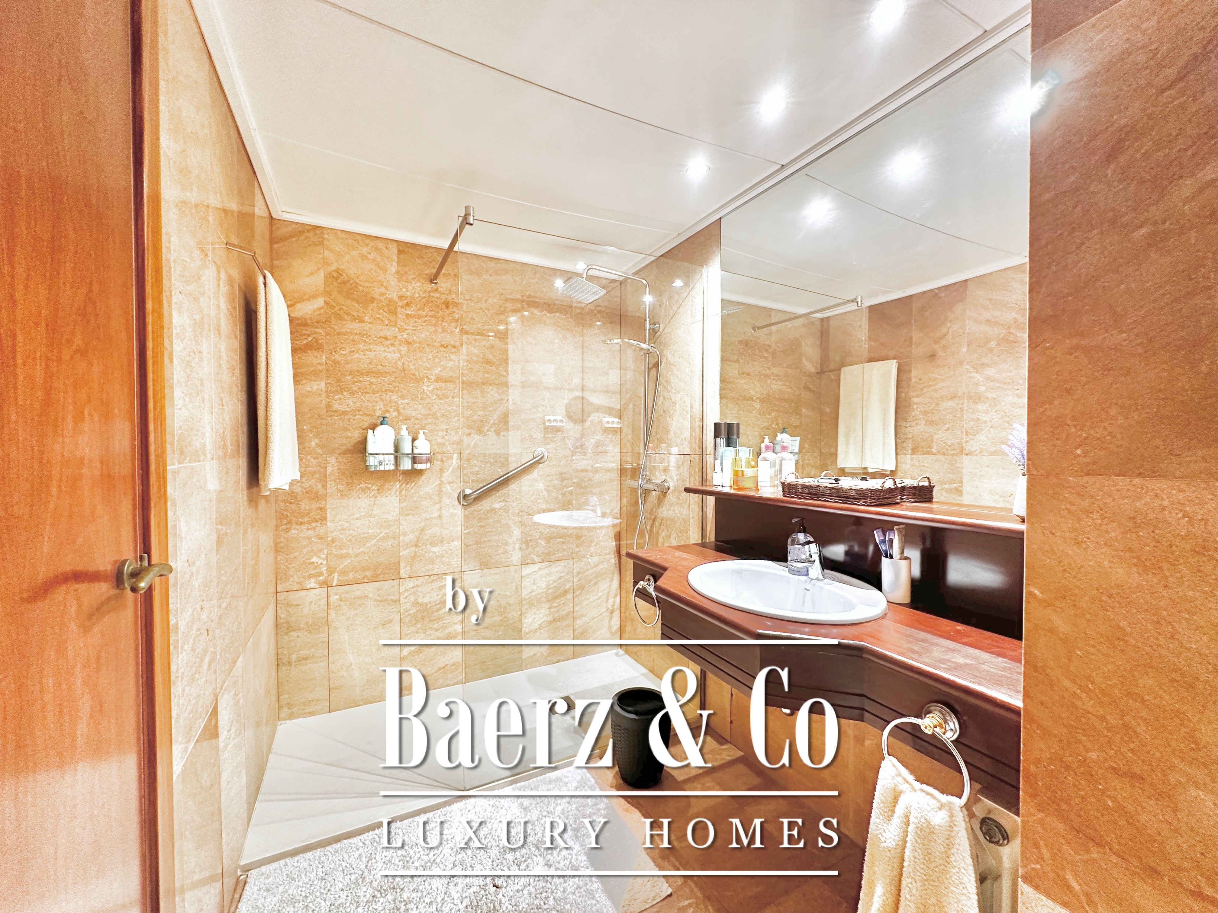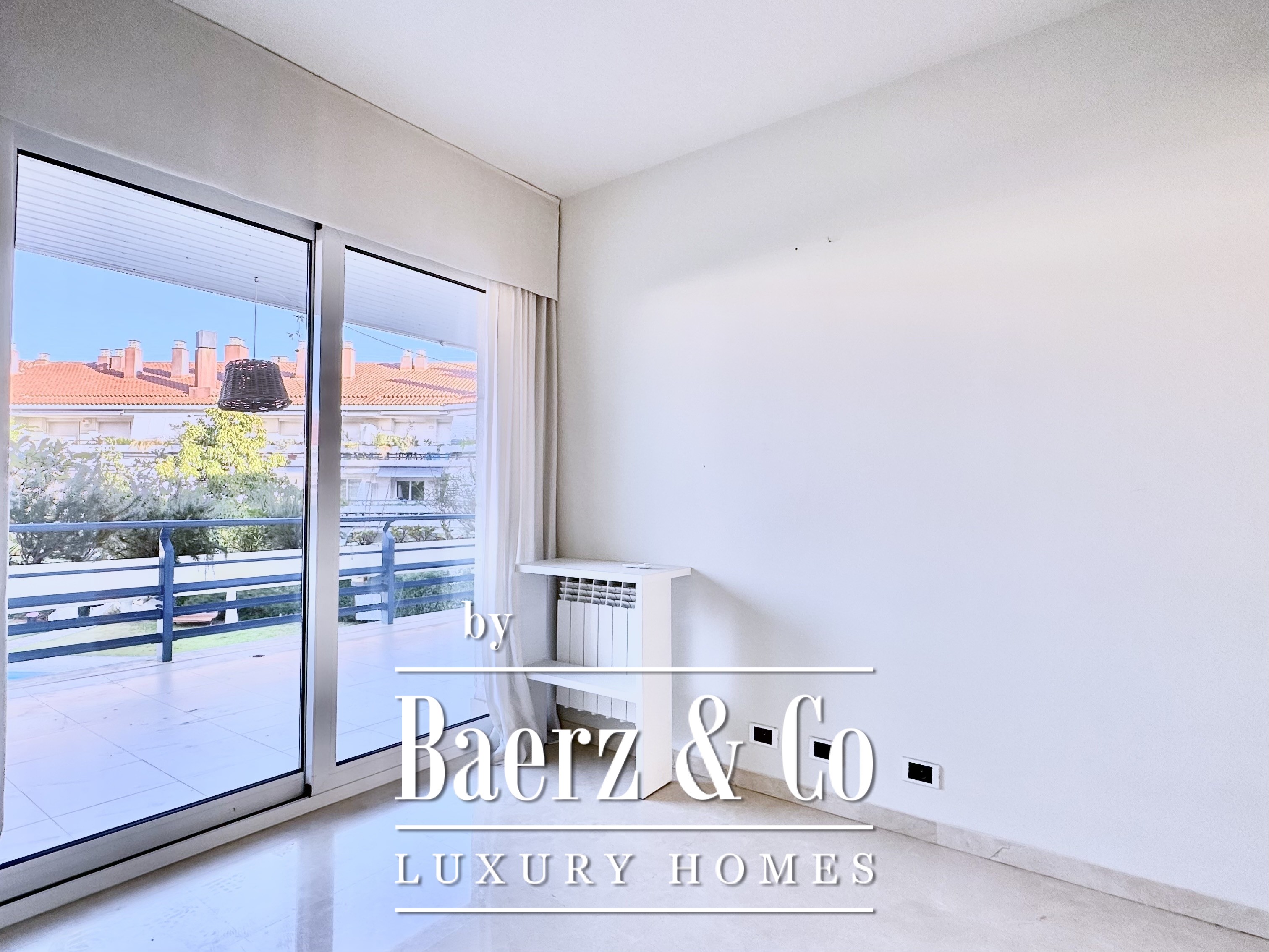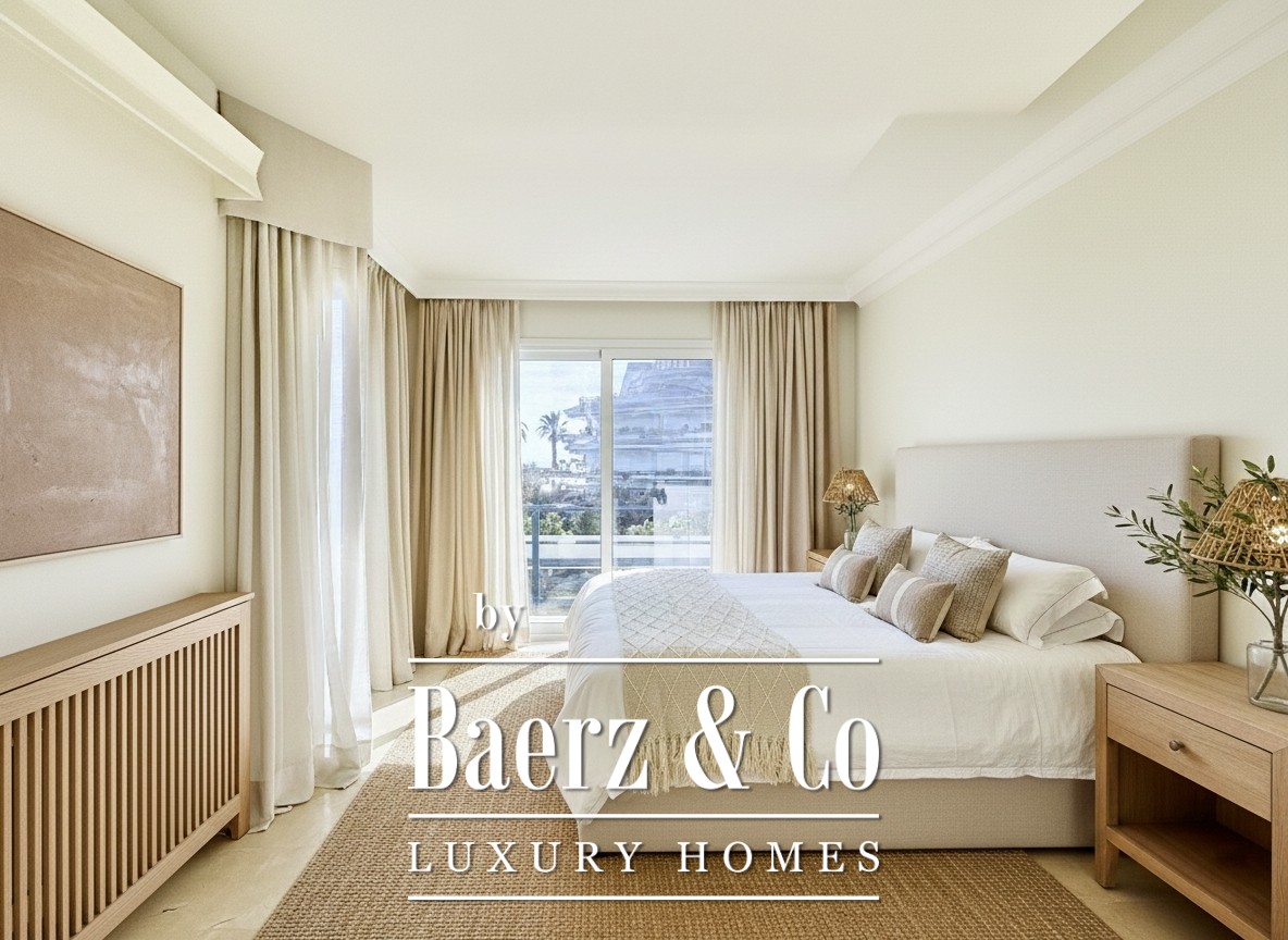 Designed and updated to rigorous standards, this residence once served as the show apartment for the development. Each of its four bedrooms provides en-suite privacy, with the master suite directly oriented towards the sea. Elegant marble finishes enhance understated interiors, while built-in wardrobes add discreet utility. Two terraces, one capturing the movement of the Mediterranean and another overlooking serene gardens and the swimming pool, invite a life attuned to both sea and greenery.