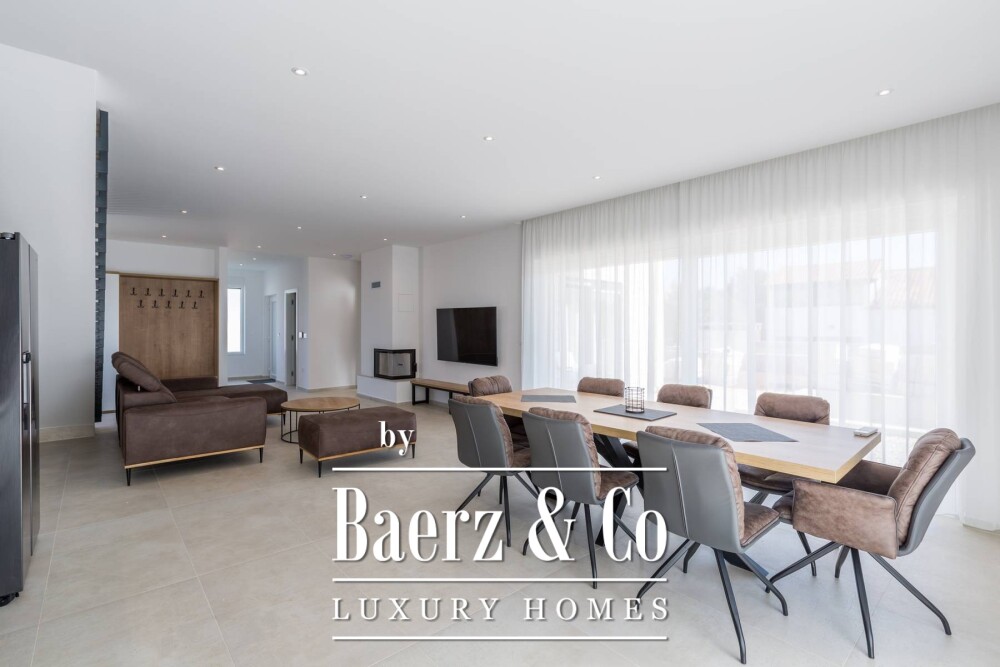 On the ground level, a bedroom adapted for accessibility, an additional bathroom, and a storage room ensure function without compromise. The first floor offers three further en-suite bedrooms, each opening to a generous terrace, extending both light and air throughout. Materials draw from the Mediterranean context, while underfloor heating, air conditioning in every room, and solar panels speak to contemporary standards.